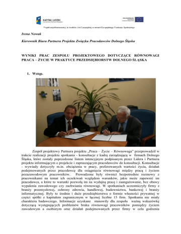 Irena Nowak Kierownik Biura Partnera Projektu Związku Pracodawców Dolnego Śląska WYNIKI PRAC ZESPOŁU PROJEKTOWEGO DOTYCZĄCE RÓWNOWAGI PRACA – ŻYCIE W PRAKTYCE PRZEDSIĘBIORSTW DOLNEGO ŚLĄSKA 1. Wstęp. Zespół projektowy Partnera projektu „Praca – Życie – Równowaga” przeprowadził w trakcie realizacji projektu spotkania - konsultacje z kadrą zarządzającą w firmach Dolnego Śląska, które zostały poprzedzone listem intencyjnym podpisanym przez Lidera i Partnera projektu informującym o projekcie i zapraszającym pracodawców do konsultacji. Konsultacje - wywiady dotyczyły m.in. obciążenia w pracy, preferowanych wartości życia, działań podejmowanych przez pracodawcę dla osiągnięcia równowagi między pracą i życiem pozazawodowym pracowników. Prowadzone były również bezpośrednie rozmowy z pracownikami na temat ich oczekiwań względem warunków, jakie może zapewnić im pracodawca, a które to warunki pozwolą im na wydajną pracę i zaangażowanie, bez obawy wypalenia zawodowego czy zachwiania równowagi. W spotkaniach uczestniczyły firmy z branży przemysłowej, ochrony zdrowia, handlowej, budownictwa, bankowej i branży informatycznej. Były to średnie i duże przedsiębiorstwa o formie własności prywatnej w części spółki z kapitałem zagranicznym w łącznej liczbie 15 firm. Spotkania nie miały charakteru badawczego. Informacje uzyskane stanowiły dla zespołu ważną wskazówkę dotyczącą występujących problemów braku równowagi pracowników pomiędzy życiem zawodowym a osobistym oraz działań podejmowanych przez firmy w celu godzenia warunków pracy z życiem pozazawodowym swoich pracowników. Udział przedsiębiorstw był anonimowy. Niektóre wizytowane firmy ujawniły swoją tożsamość i w części III niniejszej publikacji prezentują swoje dokonania w tym obszarze. Wyniki rozmów posłużyły zespołowi do zbudowania standardów Programu Praca – Życie – Równowaga. 2. Wywiady z przedsiębiorcami Wizytowane firmy charakteryzowały się stosowaniem następujących form zatrudnienia i organizacji pracy: Umowa o pracę na czas nieokreślony – od 70 do 100% zatrudnionych pracowników w stosunku do ogółu zatrudnienia Umowa o pracę na czas określony – od 10 do 80% zatrudnionych pracowników w stosunku do ogółu zatrudnienia Umowa o pracę w niepełnym wymiarze czasu pracy (niepełny etat) – stosowana w większości firm Telepraca – bardzo rzadko, popularna w firmie informatycznej ok. 7% zatrudnionych Ruchomy czas pracy – stosowany w większości firm Stosowanie indywidualnych harmonogramów pracy – sporadycznie w zależności od rodzaju stanowiska Firmy korzystają z pracy innych osób w ramach umów zlecenia i umów o dzieło bardzo często, rzadziej z umów stażowych, samozatrudnienia czy umów pracy tymczasowej. Wolontariat i praktyki były stosowane w dwóch firmach. Na pytanie jak często zdarza się praca po godzinach pracy w stosunku do ustaleń regulaminu pracy firmy wypowiadały się następująco w stosunku do poszczególnych kategorii zatrudnienia: Kategoria zatrudnionych często rzadko nie stosuje kadra kierownicza 30% 40% 30% pracownicy produkcyjni 20% 30% 50% pracownicy usług osobistych i sprzedawcy specjaliści 100% 10% technicy i średni personel pracownicy biurowi 20% Inne grupy pracownikówjakie? – zakupy 10% 40% 50% 40% 60% 40% 40% Na pytanie czy firma analizuje treść i środowisko pracy pod kątem czynników mogących ujemnie wpływać na życie pozazawodowe pracowników – regularnie raz w roku badają trzy firmy, sporadycznie – dwie firmy, pozostałe firmy w ogóle nie analizują środowiska pracy pod kątem czynników mogących ujemnie wpływać na życie pozazawodowe pracowników. Natomiast problem zachowania równowagi między pracą zawodową a życiem osobistym pracowników jest w trzech firmach zauważany i podejmowany przez kierownictwo firmy w pozostałych tylko zauważany lub jest wyłączną sprawą każdego pracownika. Tylko dwie firmy wizytowane podejmują w firmie badania, których celem jest ustalenie czy równowaga praca i życie osobiste jest zachowane, pozostałe firmy nie prowadzą takich badań, często wymieniane były badania satysfakcji pracowników jako namiastka takich badań. Na pomoc ze strony firmy może liczyć pracownik, który ma problemy związane z zakłóceniem równowagi między pracą zawodową a życiem osobistym np. stres, wypalenie zawodowe, czy też problemy rodzinne, prawie każdy pracownik z wizytowanych firm ale jest to pomoc różnorodna. Najczęściej wymienianą formą pomocy są: Ułatwienia w organizacji pracy Porady specjalisty – pakiety medyczne, pomoc psychologa, Komunikacja z pracownikiem, wsparcie bezpośredniego kierownictwa, Kierowanie na leczenie w przypadku nałogu, Szkolenia, które pozwalają zminimalizować skutki braku równowagi Jedna z firm zastosowała postój pracownika – na zasadzie 2 tygodniowego płatnego urlopu na uregulowanie spraw osobistych pracownika Dobrowolna pomoc firmy – ułatwienia pracowników mających małe dzieci lub w wieku szkolnym i pracowników samotnie wychowujących dzieci – najczęściej stosowane to: Świadczenia z funduszu socjalnego – wczasy rodzinne, paczki Mikołajowe, Wyprawka dla nowonarodzonego dziecka, Elastyczny czas pracy, Planowanie urlopów pod potrzeby rodzinne, Pokój w firmie na karmienie dziecka lub na odpoczynek dla kobiety w ciąży podczas pracy a także na chwilowy pobyt małego dziecka w celu załatwienia spraw służbowych rodzica podczas urlopu, Dodatkowy urlop płatny macierzyński dla kobiety lub mężczyzny, Biuletyn dla mam – dystrybuowany dla kobiet nieobecnych w firmie Dobrowolna pomoc firmy dla pracowników uzupełniających swoją wiedzę – najczęściej stosowane są: Urlopy szkoleniowe, Planowanie urlopów pod potrzeby szkoleniowe pracownika, Wolne piątki dla pracownika skierowanego na studia, Premia za certyfikaty. Dobrowolna pomoc firmy
