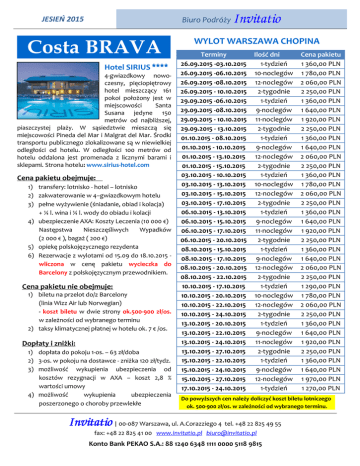 JESIEŃ 2015 Biuro Podróży . Costa BRAVA . Hotel SIRIUS **** 4-gwiazdkowy nowoczesny, pięciopiętrowy hotel mieszczący 161 pokoi położony jest w miejscowości Santa Susana jedyne 150 metrów od najbliższej, piaszczystej plaży. W sąsiedztwie mieszczą się miejscowości Pineda del Mar i Malgrat del Mar. Środki transportu publicznego zlokalizowane są w niewielkiej odległości od hotelu. W odległości 100 metrów od hotelu oddalona jest promenada z licznymi barami i sklepami. Strona hotelu: www.sirius-hotel.com Cena pakietu obejmuje: 1) transfery: lotnisko - hotel – lotnisko 2) zakwaterowanie w 4–gwiazdkowym hotelu 3) pełne wyżywienie (śniadanie, obiad i kolacja) + ¼ l. wina i ¼ l. wody do obiadu i kolacji 4) ubezpieczenie AXA: Koszty Leczenia (10 000 €) Następstwa Nieszczęśliwych Wypadków (2 000 € ), bagaż ( 200 €) 5) opiekę polskojęzycznego rezydenta 6) Rezerwacje z wylotami od 15.09 do 18.10.2015 wliczona w cenę pakietu wycieczka do Barcelony z polskojęzycznym przewodnikiem. Cena pakietu nie obejmuje: 1) biletu na przelot do/z Barcelony (linia Wizz Air lub Norwegian) - koszt biletu w dwie strony ok.500-900 zł/os. w zależności od wybranego terminu 2) taksy klimatycznej płatnej w hotelu ok. 7 € /os. Dopłaty i zniżki: 1) dopłata do pokoju 1-os. – 63 zł/doba 2) 3-os. w pokoju na dostawce - zniżka 120 zł/tydz. 3) możliwość wykupienia ubezpieczenia od kosztów rezygnacji w AXA – koszt 2,8 % wartości umowy 4) możliwość wykupienia ubezpieczenia poszerzonego o choroby przewlekłe WYLOT WARSZAWA CHOPINA Terminy Ilość dni 26.09.2015 -03.10.2015 1-tydzień 26.09.2015 -06.10.2015 10-noclegów 26.09.2015 -08.10.2015 12-noclegów 26.09.2015 - 10.10.2015 2-tygodnie 29.09.2015 -06.10.2015 1-tydzień 29.09.2015 -08.10.2015 9-noclegów 29.09.2015 - 10.10.2015 11-noclegów 29.09.2015 - 13.10.2015 2-tygodnie 01.10.2015 - 08.10.2015 1-tydzień 01.10.2015 - 10.10.2015 9-noclegów 01.10.2015 - 13.10.2015 12-noclegów 01.10.2015 - 15.10.2015 2-tygodnie 03.10.2015 - 10.10.2015 1-tydzień 03.10.2015 - 13.10.2015 10-noclegów 03.10.2015 - 15.10.2015 12-noclegów 03.10.2015 - 17.10.2015 2-tygodnie 06.10.2015 - 13.10.2015 1-tydzień 06.10.2015 - 15.10.2015 9-noclegów 06.10.2015 - 17.10.2015 11-noclegów 06.10.2015 - 20.10.2015 2-tygodnie 08.10.2015 - 15.10.2015 1-tydzień 08.10.2015 - 17.10.2015 9-noclegów 08.10.2015 - 20.10.2015 12-noclegów 08.10.2015 - 22.10.2015 2-tygodnie 10.10.2015 - 17.10.2015 1-tydzień 10.10.2015 - 20.10.2015 10-noclegów 10.10.2015 - 22.10.2015 12-noclegów 10.10.2015 - 24.10.2015 2-tygodnie 13.10.2015 - 20.10.2015 1-tydzień 13.10.2015 - 22.10.2015 9-noclegów 13.10.2015 - 24.10.2015 11-noclegów 13.10.2015 - 27.10.2015 2-tygodnie 15.10.2015 - 22.10.2015 1-tydzień 15.10.2015 - 24.10.2015 9-noclegów 15.10.2015 - 27.10.2015 12-noclegów 17.10.2015 - 24.10.2015 1-tydzień Cena pakietu 1 360,00 PLN 1 780,00 PLN 2 060,00 PLN 2 250,00 PLN 1 360,00 PLN 1 640,00 PLN 1 920,00 PLN 2 250,00 PLN 1 360,00 PLN 1 640,00 PLN 2 060,00 PLN 2 250,00 PLN 1 360,00 PLN 1 780,00 PLN 2 060,00 PLN 2 250,00 PLN 1 360,00 PLN 1 640,00 PLN 1 920,00 PLN 2 250,00 PLN 1 360,00 PLN 1 640,00 PLN 2 060,00 PLN 2 250,00 PLN 1 290,00 PLN 1 780,00 PLN 2 060,00 PLN 2 250,00 PLN 1 360,00 PLN 1 640,00 PLN 1 920,00 PLN 2 250,00 PLN 1 360,00 PLN 1 640,00 PLN 1 970,00 PLN 1 270,00 PLN Do powyższych cen należy doliczyć koszt biletu lotniczego ok. 500-900 zł/os. w zależności od wybranego terminu. | 00-087 Warszawa, ul. A.Corazziego 4 tel. +48 22 825 49 55 fax: +48 22 825 41 00 www.invitatio.pl [email protected] Konto Bank PEKAO S.A.: 88 1240 6348 1111 0000 5118 9815 JESIEŃ 2015 Biuro Podróży . Costa BRAVA . Hotel SIRIUS **** 4-gwiazdkowy nowoczesny, pięciopiętrowy hotel mieszczący 161 pokoi położony jest w miejscowości Santa Susana jedyne 150 metrów od najbliższej, piaszczystej plaży. W sąsiedztwie mieszczą się miejscowości Pineda del Mar i Malgrat del Mar. Środki transportu publicznego zlokalizowane są w niewielkiej odległości od hotelu. W odległości 100 metrów od hotelu oddalona jest promenada z licznymi barami i sklepami. Strona hotelu: www.sirius-hotel.com Cena pakietu obejmuje: 1) transfery: lotnisko - hotel – lotnisko 2) zakwaterowanie w 4–gwiazdkowym hotelu 3) pełne wyżywienie (śniadanie, obiad i kolacja) + ¼ l. wina i ¼ l. wody do obiadu i kolacji 4) ubezpieczenie AXA: Koszty Leczenia (10 000 €) Następstwa Nieszczęśliwych Wypadków (2 000 € ), bagaż ( 200 €) 5) opiekę polskojęzycznego rezydenta 6) Rezerwacje z wylotami od 15.09 do 18.10.2015 wliczona w cenę pakietu wycieczka do Barcelony z polskojęzycznym przewodnikiem. WYLOT WARSZAWA CHOPINA Terminy 17.10.2015 - 27.10.2015 17.10.2015 - 31.10.2015 20.10.2015 - 27.10.2015 20.10.2015 - 31.10.2015 20.10.2015 - 03.11.2015 22.10.2015 - 31.10.2015 22.10.2015 - 03.11.2015 24.10.2015 - 31.10.2015 24.10.2015 - 03.11.2015 24.10.2015 - 07.11.2015 27.10.2015 - 03.11.2015 27.10.2015 - 07.11.2015 31.10.2015 - 07.11.2015 Ilość dni 10-noclegów 2-tygodnie 1-tydzień 11-noclegów 2-tygodnie 9-noclegów 12-noclegów 1-tydzień 10-noclegów 2-tygodnie 1-tydzień 11-noclegów 1-tydzień Cena pakietu 1 630,00 PLN 2 080,00 PLN 1 540,00 PLN 1 750,00 PLN 2 080,00 PLN 1 510,00 PLN 1 880,00 PLN 1 270,00 PLN 1 630,00 PLN 2 080,00 PLN 1 270,00 PLN 1 750,00 PLN 1 270,00 PLN Do powyższych cen należy doliczyć koszt biletu lotniczego ok. 500-900 zł/os. w zależności od wybranego terminu. Cena pakietu nie obejmuje: 1) biletu na przelot do/z Barcelony (linia Wizz Air lub Norwegian) - koszt biletu w dwie strony ok.500-900 zł/os. w zależności od wybranego terminu 2) taksy klimatycznej płatnej w hotelu ok. 7 € /os. Dopłaty i zniżki: 1) dopłata do pokoju 1-os. – 63 zł/doba 2) 3-os. w pokoju na dostawce - zniżka 120 zł/tydz. 3) możliwość wykupienia ubezpieczenia od kosztów rezygnacji w AXA – koszt 2,8 % wartości umowy 4) możliwość wykupienia ubezpieczenia poszerzonego o