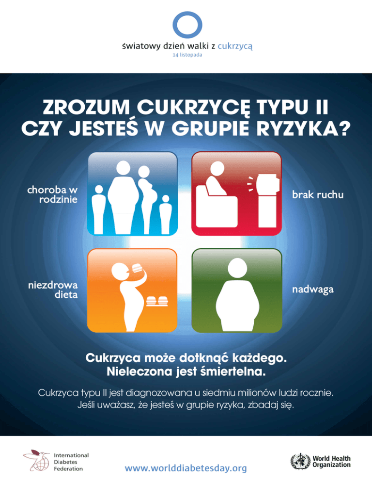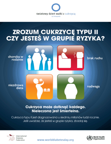 swiatowy dzien walki z cukrzyca 14 listopada ZROZUM CUKRZYCĘ TYPU II CZY JESTEŚ W GRUPIE RYZYKA? choroba w rodzinie brak ruchu niezdrowa dieta nadwaga Cukrzyca może dotknąć każdego. Nieleczona jest śmiertelna. Cukrzyca typu II jest diagnozowana u siedmiu milionów ludzi rocznie. Jeśli uważasz, że jesteś w grupie ryzyka, zbadaj się. www.worlddiabetesday.org