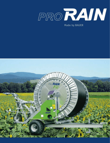 Ekonomiczny sposób nawadniania - kompaktowy, ekonomiczny, elastyczny Najwyższa jakość rury PE wysoka trwałość również w trudnych warunkach pracy Najlepszy stosunek możliwości deszczowni do ceny. W pełni zautomatyzowane nawadnianie przy PRO RAIN kompaktowa maszyna do nawadniania różnych typów gleby wykorzystaniu sterowania komputerem. Bardzo ekonomiczny ze względu na niskie Demontowane elementy bębna łatwy dostęp dla obsługi i konserwacji zapotrzebowanie na energię. Niezawodność i bezpieczeństwo dzięki wysokiej jakości materiałów. Długa żywotność i stabilność konstrukcji ze względu na cynkowane ogniowo metalowe części produkowane zgodnie z wysokimi normami jakości BAUER. EcoStar 4000 S komputer zapewniający precyzyjne podanie wymaganego opadu Wahadło zraszacza pozwala na delikatne nawadnianie na końcu pola i nierównym terenie Mocna zębatka napędowa bębna duża średnica zapewnia równomierny rozkład sił na szpuli Automatyczne podnoszenie wózka zraszacza pod koniec nawadniania wózek zraszacza jest podnoszony do pozycji transportowej Zawór odcinający optymalne bezpieczeństwo dzięki automatycznemu wyłączaniu systemu w przypadku spadku lub wzrostu ciśnienia Hydrauliczne podpory deszczowni łatwe w obsłudze, zapewniają stabilizację w trakcie podnoszenia wózka i zwijania rury 4-biegowa skrzynia biegów / połączona z turbiną łatwa w obsłudze, elektroniczna kontrola wydajności Obrotowy bęben deszczowni zapewnia precyzyjne ustawienie w każdej pozycji pracy Podwozie i bęben ocynkowane ogniowo stabilna konstrukcja i długa żywotność dzięki optymalnemu zabezpieczeniu przed korozją Opcja: mechaniczne lub hydrauliczne obracanie bębna nawet na nierównym terenie www.bauerpolska.pl Dane techniczne PRO RAIN PE rura Ø x długość Max. długość nawad. pola F30 typ mm x m m F40 90 – 450 100 – 400 100 – 450 110-330 100-540 110-500 120-370 90-450 100-400 100-450 110-330 100-540 110-500 120-370 500 450 500 380 590 550 420 Turbina typ DTU - 742 M DTU - 742 M Ciśnienie na wejściu deszcz. bar 6.6-11.0 6.6-11.0 Waga deszcz. z wodą Waga deszcz.bez wody kg 4 838 5 117 kg 2 851 2 868 5 509 5111 4 685 6 997 6 430 3 047 2929 3 716 3 812 3 598 Długość z wózkiem zraszacza (I) mm 5 562 5 700 Długość bez wózka zraszacza (J) mm 5 010 5 144 Długość transportowa (K) mm 2 750 – 3 153 2 820 – 3 221 Max.szerokość (L) mm 2 340 2 540 (M) mm 2 157 2 372 Wysokość (N) mm 3 320 3 442 Rozstaw kół deszczowni (O) mm 2 000 2 200 Rozmiar kół deszczowni rozmiar 10.0 / 75 - 15.3 / 12 Ply 11.5 / 80 - 15.3 / 12 Ply Szerokość transportowa Ciśnienie w kołach deszczowni bar 6.0 5.5 Prześwit podwozia deszczowni (R) mm 300 327 Wysokość zaczepu , standard (S) mm 530 557 Wysokośc zaczepu , dolne położenie (T) mm 250 227 Wysokość transportowa (U) mm 3.020 3.115 Szerokość wózka zraszacza (V) mm 1 500 – 2 000 1 500 – 2 000 Rozmiar kół wózka zraszacza rozmiar 165 / 70 R 13 165 / 70 R 13 1.3 1.3 Ciśnienie w kołach wózka zraszacza bar *) Waga deszczowni obejmuje maszynę z PE rurą, wózkiem, zraszaczem i 6 obciążnikami Opcje wyposażenia Wąż przyłączeniowy HK 108 / 7m Panel słoneczny Zawór odcinający elektryczny na wysokie lub niskie ciśnienie Mechaniczny obrót bębna Hydrauliczny obrót bębna pole ochronne - wysokość jednej wielkiej litery Zraszacz BAUER SR 140 Twój Dealer: Jasionka 102 21-200 Parczew cmyk 59 / 12 / 93 / 0 Tel. 83 355-17-44 cmyk 47 / 37 / 28 / 0 [email protected] cmyk 67 / 34 / 0 / 0 www.bauerpolska.pl www.bauerpolska.pl