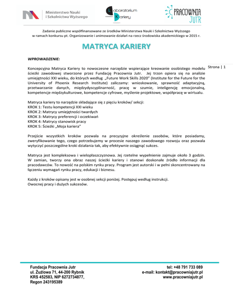 Zadanie publiczne współfinansowane ze środków Ministerstwa Nauki i Szkolnictwa Wyższego w ramach konkursu pt. Organizowanie i animowanie działań na rzecz środowiska akademickiego w 2015 r. MATRYCA KARIERY WPROWADZENIE: Koncepcyjna Matryca Kariery to nowoczesne narzędzie wspierające kreowanie osobistego modelu Strona | 1 ścieżki zawodowej stworzone przez Fundację Pracownia Jutr. Jej trzon opiera się na analizie umiejętności XXI wieku, do których według „Future Work Skills 2020” (Institute for the Future for the University of Phoenix Research Institute) zaliczamy: wnioskowanie, sprawność adaptacyjną, przetwarzanie danych, międzydyscyplinarność, pracę w szumie, inteligencję emocjonalną, kompetencje międzykulturowe, kompetencje cyfrowe, myślenie projektowe, współpracę w wirtualu. Matryca kariery to narzędzie składające się z pięciu kroków/ sekcji: KROK 1: Testu kompetencji XXI wieku KROK 2: Matrycy umiejętności twardych KROK 3: Matrycy preferencji i oczekiwań KROK 4: Matrycy stanowisk pracy KROK 5: Ścieżki „Moja kariera” Przejście wszystkich kroków pozwala na precyzyjne określenie zasobów, które posiadamy, zweryfikowanie tego, czego potrzebujemy w procesie naszego zawodowego rozwoju oraz pozwala wytyczyć poszczególne kroki działania tak, aby efektywnie osiągnąć sukces. Matryca jest kompleksowa i wielopłaszczyznowa. Jej rzetelne wypełnienie zajmuje około 3 godzin. W zamian, tworzy ona obraz naszej ścieżki kariery i stanowi doskonałe źródło informacji dla pracodawców. To nowość na polskim rynku pracy. Program jest autorski i w pełni skoncentrowany na łączeniu wymagań rynku pracy, edukacji i biznesu. Każdy z kroków opisany jest w osobnej sekcji poniżej. Postępuj według instrukcji. Owocnej pracy i dużych sukcesów. Fundacja Pracownia Jutr ul. Żużlowa 71, 44-200 Rybnik KRS 452583, NIP 6272734877, Regon 243195389 tel: +48 791 733 089 e-mail: [email protected] www.pracowniajutr.pl Zadanie publiczne współfinansowane ze środków Ministerstwa Nauki i Szkolnictwa Wyższego w ramach konkursu pt. Organizowanie i animowanie działań na rzecz środowiska akademickiego w 2015 r. SEKCJA 1: TEST KOMPETENCJI XXI WIEKU Sekcja 1 to test weryfikujący Twoje umiejętności i kompetencje niezbędne w XXI wieku. Test składa się z 10 części (bada 10 kompetencji). Postępuj zgodnie z instrukcją do każdej części testu. Po uzupełnieniu każdej części, przejdź do posumowania wyników i stwórz diagram swoich umiejętności XXI wieku. Strona | 2 CZĘŚĆ I. WNIOSKOWANIE: Test na wnioskowanie ma wymiar praktyczny. Poniżej znajduje się 5 twierdzeń oraz do każdego z nich dołączone są dwie konkluzje. Twoim zadaniem jest ocenić, która z konkluzji w odniesieniu do danego twierdzenia jest poprawna (wybierz najbardziej pasującą odpowiedź od a do f). Za każdą prawidłową odpowiedź otrzymujesz 20%. Wyniki na końcu testu w części I (w przypisie). Po wypełnieniu testu podlicz wynik za całe zadanie - część I. I. TWIERDZENIE 1: W maratonie wzięło udział 200 biegaczy. 160 z nich to nauczyciele. KONKLUZJE: 1) 80% nauczycieli to maratończycy. 2) Otwierający maraton to biegacz. WYBIERZ JEDNĄ POPRAWNĄ ODPOWIEDŹ: a) tylko konkluzja nr 1 jest prawdziwa b) tylko konkluzja nr 2 jest prawdziwa c) tylko konkluzja nr 1 jest fałszywa d) tylko konkluzja nr 2 jest fałszywa e) konkluzje nr 1 i 2 są prawdziwe f) konkluzje nr 1 i 2 są fałszywe II. TWIERDZENIE 2: Stary porządek kształtuje nowy ład. KONKLUZJE: 1) Zmiana to prawo natury. 2) Stare zasady należy odrzucić na rzecz nowych idei. WYBIERZ JEDNĄ POPRAWNĄ ODPOWIEDŹ: a) tylko konkluzja nr 1 jest prawdziwa b) tylko konkluzja nr 2 jest prawdziwa c) tylko konkluzja nr 1 jest fałszywa d) tylko konkluzja nr 2 jest fałszywa e) konkluzje nr 1 i 2 są prawdziwe f) konkluzje nr 1 i 2 są fałszywe III. TWIERDZENIE 3: Przyrost liczby ludności w połączeniu z faktem wyczerpywania się zasobów naturalnych sprzyja scenariuszowi wedle, którego coraz większe znaczenie będą miały kraje rozwijające się. KONKLUZJE: a) Przyrost naturalny w krajach rozwijających będzie malał. b) Rządy wielu krajów rozwijających się będą się borykać z problemem zapewnienia ludności dobrych jakościowo warunków życia. Fundacja Pracownia Jutr ul. Żużlowa 71, 44-200 Rybnik KRS 452583, NIP 6272734877, Regon 243195389 tel: +48 791 733 089 e-mail: [email protected] www.pracowniajutr.pl Zadanie publiczne współfinansowane ze środków Ministerstwa Nauki i Szkolnictwa Wyższego w ramach konkursu pt. Organizowanie i animowanie działań na rzecz środowiska akademickiego w 2015 r. WYBIERZ JEDNĄ POPRAWNĄ ODPOWIEDŹ: a) tylko konkluzja nr 1 jest prawdziwa b) tylko konkluzja nr 2 jest prawdziwa c) tylko konkluzja nr 1 jest fałszywa d) tylko konkluzja nr 2 jest fałszywa Strona | 3 e) konkluzje nr 1 i 2 są prawdziwe f) konkluzje nr 1 i 2 są fałszywe IV. TWIERDZENIE 4: W Japonii tempo wzrostu zachorowań na raka żołądka jest wysokie, przy jednoczesnej niskiej liczbie zachorowań na raka jelita grubego. Na Hawajach tendencja jest odwrotna - tempo wzrostu raka jelita jest wysokie, a stopa raka żołądka zmniejsza się. Duży wpływ na ten stan rzeczy ma sposób odżywiania. KONKLUZJE: a) W celu ograniczenia liczby zachorowań na raka żołądka w Japonii konieczne jest wprowadzenie diety Hawajczyków w żywieniu zbiorowym Japończyków. b) Rak jelita grubego jest mniej dokuczliwy niż rak żołądka. WYBIERZ JEDNĄ POPRAWNĄ ODPOWIEDŹ: a) tylko konkluzja nr 1 jest prawdziwa b) tylko konkluzja nr 2 jest prawdziwa c) tylko konkluzja nr 1 jest fałszywa d) tylko konkluzja nr 2 jest fałszywa e) konkluzje nr 1 i 2 są prawdziwe f) konkluzje nr 1 i 2 są fałszywe V. TWIERDZENIE 5: Szef poniżył Tomka w obecności innych pracowników. KONKLUZJE: a) Szef nie lubi Tomka. b) Tomek nie jest lubiany przez pracowników. WYBIERZ JEDNĄ POPRAWNĄ ODPOWIEDŹ: a) tylko konkluzja nr 