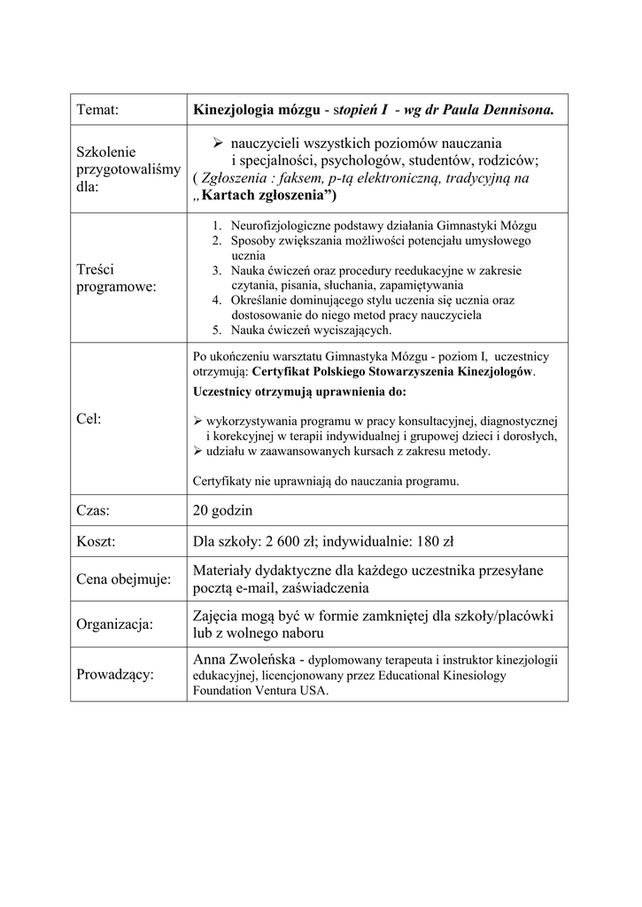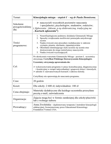 Temat: Kinezjologia mózgu - stopień I - wg dr Paula Dennisona. nauczycieli wszystkich poziomów nauczania Szkolenie i specjalności, psychologów, studentów, rodziców; przygotowaliśmy ( Zgłoszenia : faksem, p-tą elektroniczną, tradycyjną na dla: „Kartach zgłoszenia”) Treści programowe: 1. Neurofizjologiczne podstawy działania Gimnastyki Mózgu 2. Sposoby zwiększania możliwości potencjału umysłowego ucznia 3. Nauka ćwiczeń oraz procedury reedukacyjne w zakresie czytania, pisania, słuchania, zapamiętywania 4. Określanie dominującego stylu uczenia się ucznia oraz dostosowanie do niego metod pracy nauczyciela 5. Nauka ćwiczeń wyciszających. Po ukończeniu warsztatu Gimnastyka Mózgu - poziom I, uczestnicy otrzymują: Certyfikat Polskiego Stowarzyszenia Kinezjologów. Uczestnicy otrzymują uprawnienia do: Cel: wykorzystywania programu w pracy konsultacyjnej, diagnostycznej i korekcyjnej w terapii indywidualnej i grupowej dzieci i dorosłych, udziału w zaawansowanych kursach z zakresu metody. Certyfikaty nie uprawniają do nauczania programu. Czas: 20 godzin Koszt: Dla szkoły: 2 600 zł; indywidualnie: 180 zł Cena obejmuje: Materiały dydaktyczne dla każdego uczestnika przesyłane pocztą e-mail, zaświadczenia Organizacja: Zajęcia mogą być w formie zamkniętej dla szkoły/placówki lub z wolnego naboru Prowadzący: Anna Zwoleńska - dyplomowany terapeuta i instruktor kinezjologii edukacyjnej, licencjonowany przez Educational Kinesiology Foundation Ventura USA.