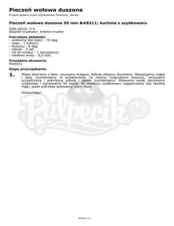 Pieczeń wołowa duszona Przepis dodany przez użytkownika Tytanowy_Janusz Pieczeń wołowa duszona 50 min – kuchnia z szybkowaru Ilość porcji: 3-4 Stopień trudności: średnio trudne Potrzebne składniki: - wołowiny bez kości - 70 dag - mąki - 1 łyżka(i) - tłuszczu - 6 dag - cebule - 2 szt. - sól do smaku - 1 szczypta(y) - szklanki wody - 0,5 szkl. Przydatne akcesoria: tłuszczu Etapy przyrządzania: 1. Mięso obieramy z błon, usuwamy ścięgna, dobrze zbijamy tłuczkiem. Obsypujemy mąką i solą, zrumieniamy w szybkowarze na mocno rozgrzanym tłuszczu, wrzucamy oczyszczoną i pokrojoną cebulę i razem zrumieniamy. Wlewamy wodę zamykamy szybkowar i ogrzewamy 50 minut. Po otwarciu szybkowaru zagęszczamy sos resztką mąki, jeżeli potrzeba dolewamy nieco wody. Smacznego! Strona 1/1