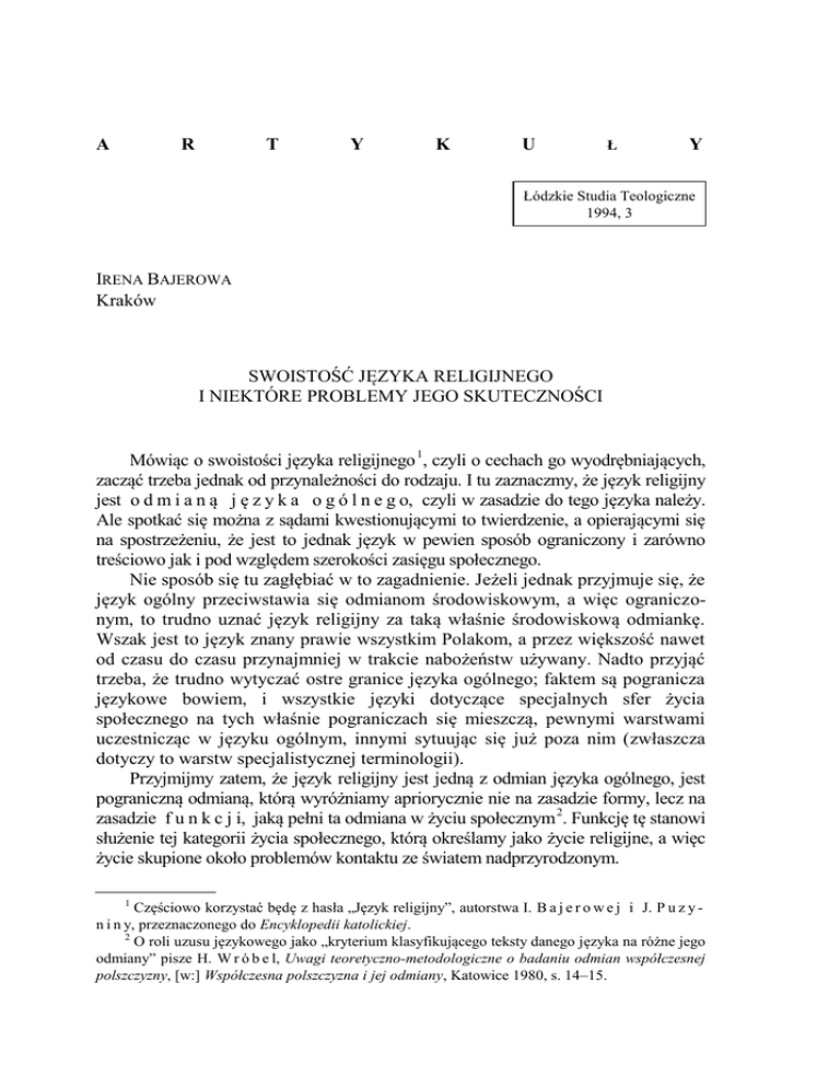A R T Y K U Y Kraków SWOISTOŚĆ JĘZYKA RELIGIJNEGO I