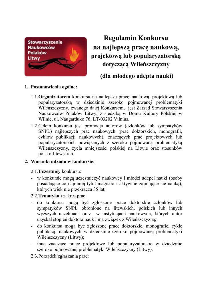 Regulamin Konkursu na najlepszą pracę naukową, projektową lub popularyzatorską dotyczącą Wileńszczyzny (dla młodego adepta nauki) 1. Postanowienia ogólne: 1.1. Organizatorem konkursu na najlepszą pracę naukową, projektową lub popularyzatorską w dziedzinie szeroko pojmowanej problematyki Wileńszczyzny, zwanego dalej Konkursem, jest Zarząd Stowarzyszenia Naukowców Polaków Litwy, z siedzibą w Domu Kultury Polskiej w Wilnie, ul. Naugarduko 76, LT-03202 Vilnius. 1.2. Celem konkursu jest promocja autorów (członków lub sympatyków SNPL) najlepszych prac naukowych (prac doktorskich, monografii, cyklów publikacji naukowych), znaczących prac projektowych lub popularyzatorskich powiązanych z szeroko pojmowaną problematyką Wileńszczyzny, życia mniejszości polskiej na Litwie oraz stosunków polsko-litewskich. 2. Warunki udziału w konkursie: 2.1. Uczestnicy konkursu: - w konkursie mogą uczestniczyć naukowcy i młodzi adepci nauki (osoby posiadające co najmniej tytuł magistra i aktywnie zajmujące się nauką), których wiek nie przekracza 35 lat; 2.2. Tematyka i zakres prac: - do konkursu mogą być zgłoszone prace doktorskie członków lub sympatyków SNPL obronione na litewskich, polskich lub innych wyższych uczelniach oraz w instytucjach naukowych, których autor uzyskał stopień doktora nauk i ma związek z Wileńszczyzną; - do konkursu mogą być zgłoszone prace doktorskie, monografie, cykle publikacji naukowych w dziedzinie szeroko pojmowanej problematyki Wileńszczyzny (Litwy); - inne znaczące prace projektowe lub popularyzatorskie w dziedzinie szeroko pojmowanej problematyki Wileńszczyzny (Litwy). 2.3. Porządek zgłaszania prac: - prace mogą być zgłaszane przez autorów, promotorów lub dziekanów wydziałów i dyrektorów instytutów; - warunkiem uczestnictwa w konkursie jest obrona pracy doktorskiej lub publikacja innej znaczącej pracy naukowej wymienionej w ust. 2.2. i dotycząca wymienionej problematyki; - pisemne zgłoszenie udziału wraz z kompletem dokumentów, obejmującym 1 egzemplarz rozprawy doktorskiej, monografii lub innej wyżej wymienionej pracy wraz z recenzjami, należy kierować do sekretarza naukowego Zarządu Stowarzyszenia Naukowców Polaków Litwy pod adresem: ul. Naugarduko 76, LT-03202 Wilno, Republika Litewska (w kopercie z dopiskiem: „Konkurs na najlepszą pracę naukową”) lub przynieść osobiście za potwierdzeniem odbioru na recepcję Domu Kultury Polskiej w Wilnie w nieprzekraczalnym terminie do 30 grudnia 2016 roku; - na konkurs mogą być zgłaszane prace obronione lub wydane w okresie ostatnich 3 lat kalendarzowych (np. do 30 grudnia 2016 r. można zgłaszać tylko prace obronione lub wydane w latach 2014-2016); - każda praca naukowa może być zgłaszana tylko na jeden konkurs. 3. Ocena prac: - ocenia prace i przyznaje nagrody Komisja Konkursowa; - skład Komisji Konkursowej na każdy konkurs zatwierdza Zarząd SNPL. Powinna ona liczyć co najmniej 7 osób, a przewodniczyć jej będzie Prezes Stowarzyszenia Naukowców Polaków Litwy; - w składzie Komisji Konkursowej ma być co najmniej: 2/3 znanych naukowców reprezentujących uniwersytety i placówki naukowobadawcze Litwy, Polski i ewentualnie innych krajów, a także mogą być przedstawiciele organizacji pozarządowych, samorządowych, polskich organizacji lub placówek na Litwie; - podstawowymi kryteriami oceny prac będą ich walory naukowe, w tym głównie poznawcze i aplikacyjne znaczenie uzyskanych wyników dla rozwoju Wileńszczyzny (Litwy); - szczegółowe wymagania dotyczące problematyki prac konkursowych i ich oceny przygotowuje Komisja Konkursowa, a zatwierdza Zarząd SNPL. 4. Nagrody: - w zależności od ilości uczestniczących w konkursie prac oraz ich jakości Komisja Konkursowa ustala ilość nagród i wyróżnień oraz ich wysokość lub formę; - nagrody mogą być ufundowane przez instytucje państwowe, organizacje pozarządowe oraz indywidualnych fundatorów; - w każdej edycji konkursu można przyznać jedną nagrodę pierwszego i dwie nagrody drugiego stopnia lub jedną nagrodę i dwa wyróżnienia; - w szczególnych przypadkach Komisja zastrzega sobie prawo do odstąpienia od przyznania nagród i/lub przyznania dodatkowych wyróżnień; - zwycięzcy konkursu i autorzy wyróżnionych prac otrzymują dyplom honorowy SNPL; - nagrody pieniężne lub nagrody rzeczowe (dla prac wyróżnionych) oraz listy gratulacyjne dla promotorów i jednostek, w których te prace zostały wykonane, będą wręczane uroczyście podczas dorocznych zebrań walnych Stowarzyszenia Naukowców Polaków Litwy; - wyniki każdego konkursu będą publikowane w Roczniku SNPL i na stronie internetowej SNPL. 5. Harmonogram 5.1. Konkurs przeprowadzany jest zgodnie z następującym harmonogramem: - Ogłoszenie konkursu – 21 września 2016 roku. - Nadsyłanie prac – od 1 października do 30 grudnia 2016 roku. - Komisja Konkursowa może zakwalifikować do Konkursu prace nieodbytego Konkursu SNPL na najlepszą pracę naukową, projektową lub popularyzatorską w dziedzinie szeroko pojmowanej problematyki Wileńszczyzny za rok 2015. - Ogłoszenie wyników i wręczanie nagród – w czasie zebrania walnego SNPL w kwietniu 2017 roku. 5.2. Ujawnienie danych Autorów prac nastąpi po zakończeniu posiedzenia Komisji Konkursowej, podczas którego zostaną wyłonieni laureaci Konkursu. 6. Postanowienia końcowe 6.1. Niniejszy Regulamin oraz wszystkie potrzebne informacje dotyczące konkursu będą umieszczane na stronie internetowej – www.SNPL.lt 6.2. Organizator zastrzega sobie prawo do zmiany Regulaminu. Zmiany obowiązują od chwili umieszczenia ich na stronie internetowej SNPL. 6.3. W kwestiach nieuregulowanych niniejszym Regulaminem zastosowanie mają przepisy powszechnie obowiązującego prawa, w tym w szczególności przepisy Kodeksu cywilnego Republiki Litewskiej. 6.4. Uczestnik Konkursu oświadcza, że nadesłana praca nie narusza praw osób trzecich, w szczegó