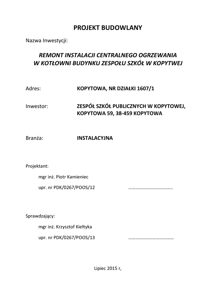 PROJEKT BUDOWLANY Nazwa Inwestycji: REMONT INSTALACJI CENTRALNEGO OGRZEWANIA W KOTŁOWNI BUDYNKU ZESPOŁU SZKÓŁ W KOPYTWEJ Adres: KOPYTOWA, NR DZIAŁKI 1607/1 Inwestor: ZESPÓŁ SZKÓŁ PUBLICZNYCH W KOPYTOWEJ, KOPYTOWA 59, 38-459 KOPYTOWA Branża: INSTALACYJNA Projektant: mgr inż. Piotr Kamieniec upr. nr PDK/0267/POOS/12 ……………………………….. Sprawdzający: mgr inż. Krzysztof Kiełtyka upr. nr PDK/0267/POOS/13 Lipiec 2015 r, ………………………………… Spis treści 1. Przedmiot opracowania...........................................................................................................3 2. Podstawa opracowania ...........................................................................................................3 3. Dane ogólne ............................................................................................................................3 4. Instalacja centralnego ogrzewania...........................................................................................3 4.1. Stan istniejący .....................................................................................................................3 4.2. Roboty demontażowe .........................................................................................................4 4.3. Stan projektowany ..............................................................................................................4 4.4. Roboty towarzyszące ...........................................................................................................7 4.5. Uwagi ..................................................................................................................................7 5. Zestawienie rysunków .............................................................................................................8 2 1. Przedmiot opracowania Przedmiotem opracowania jest projekt budowlany obejmujący w swym zakresie wykonanie remontu wewnętrznej instalacji centralnego ogrzewania w pomieszczeniu kotłowni budynku Zespołu Szkół w Kopytowej. 2. Podstawa opracowania Projekt powstał na podstawie: - zlecenia inwestora, - norm budowlanych, - właściwych Rozporządzeń, - katalogów branżowych, literatury fachowej - wizji lokalnej. 3. Dane ogólne Istniejąca kotłownia gazowa wyposażona jest w dwa kotły, które zasilają w ciepło cały budynek szkoły w Kopytowej. Budynek jest konstrukcją typową, nieocieplony, wyposażony w instalację centralnego ogrzewania, która będzie podlegać remontowi w zakresie pomieszczenia kotłowni. 4. Instalacja centralnego ogrzewania 4.1. Stan istniejący Pomieszczenie kotłowni znajduje się w suterenach budynku szkoły z wejściem od strony północnej. Jego powierzchnia to 25,93 m2 (5,80x4,47 m), wysokość 2,77 m. Na cokole betonowym wyłożonym płytkami ustawione są dwa kotły stalowe o średnicach zewnętrznych 0,8m zasilane paliwem gazowym z instalacji gazowej z kurkiem głównym na ścianie zewnętrznej budynku. W pomieszczeniu zabudowane są również: - rozdzielacz zasilania z pompami obiegowymi i zaworami, - trzy linie zasilające szkołę w ciepło, - zespół urządzeń i armatury zabudowanych na instalacji powrotu, - naczynie wzbiorcze. Pomieszczenie kotłowni posiada trzy kanały wentylacji grawitacyjnej wywiewnej o przekroju 20x15 cm każda oraz kanał nawiewny. Pomieszczenie kotłowni wyposażone jest również w instalację wody wraz z wodomierzem, baterią czerpalną, instalację kanalizacji sanitarnej odprowadzającą ścieki z umywalki i wpust podłogowy. 3 4.2. Roboty demontażowe W celu przystosowania kotłowni i instalacji do pracy nowych kotłów gazowych, wymagane jest wykonanie demontażu części instalacji i urządzeń obecnie zabudowanych w pomieszczeniu. Przewiduje się do demontażu: - odcinki instalacji gazowej, - odcinki przewodów spalinowych pomiędzy kotłami a ścianą, - obydwa kotły gazowe wraz z oprzyrządowaniem, - rozdzielacze zasilania i powrotu umieszczone z tyłu kotłów wraz częścią instalacji, - naczynie wzbiorcze, - filtroodmulnik z prostką. Zakres prac do demontażu precyzuje schemat będący załącznikiem do dokumentacji. 4.3. Stan projektowany Projektuje się zabudowę trzech kotłów gazowych, kondensacyjnych DeDietrich MCA65 o maksymalnej mocy cieplnej 65 kW każdy. Powietrze do spalania pobierane będzie z pomieszczenia kotłowni. Kotły zabudować należy w systemie kaskadowym, w zestawie „LW” – w rzędzie, wiszące na ścianie. Zewnętrzne wymiary kotłów – 500 x 750 x 500mm, wyposażone będą w palnik ze stali nierdzewnej, modulujący w zakresie 18-100% mocy. Każdy z kotłów wyposażony będzie w zasyfonowane odprowadzenie skroplin. Sprawność kotła może osiągnąć 108,9% przy obciążeniu 30% i temperaturze na powrocie 30oC. Nominalna moc elektryczna 88W. Kotły gazowe należy umiejscowić na tylnej ścianie kotłowni (zgodnie z rysunkiem) za pomocą wsporników montażowych przeznaczonych dla systemu kaskadowego. Odprowadzenie spalin nastąpi do istniejącego przewodu spalinowego w ścianie budynku. Projektuje się odprowadzenie spalin 2+1, tj. dwa kotły gazowe spięte kolektorem i odprowadzone do pierwszego przewodu kominowego rurą Ø180 oraz jeden kocioł z przewodem spalinowym Ø150 wpięty do drugiego istniejącego komina spalinowego. Podłączenie przewodów odprowadzających spaliny wykonać ściśle według zaleceń producenta. Wraz z kotłami gazowymi projektuje się zabudowę systemu kaskadowego dla układu trzech kotłów MCA65 w wersji wiszącej-szeregowej. System kaskadowy składać się będzie z: - rozdzielacza hydraulicznego (sprzęgła) ze średnicami przyłączy DN65, i długością zabudowy 279 mm (karta katalogowa w załączeniu), - kolektora podłączenia kotłów zawierającego przewody połączeniowe zasilania i powrotu z C.O.-DN65, przewód połączeniowy gazowy DN50, - pomp kotłowych obiegu pierwotnego, - zestawu podłączenio