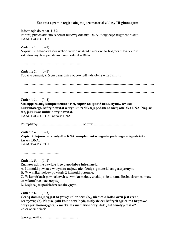 Zadania egzaminacyjne obejmujące materiał z klasy III gimnazjum Informacje do zadań 1. i 2. Poniżej przedstawiono schemat budowy odcinka DNA kodującego fragment białka. TAAGTAGCGCCA Zadanie 1. (0–1) Napisz, ile aminokwasów wchodzących w skład określonego fragmentu białka jest zakodowanych w przedstawionym odcinku DNA. ...................................................................... Zadanie 2. (0–1) Podaj argument, którym uzasadnisz odpowiedź udzieloną w zadaniu 1. ....................................................................................................................................................... ....................................................................................................................................................... Zadanie 3. (0–2) Stosując zasadę komplementarności, zapisz kolejność nukleotydów kwasu nukleinowego, który powstał w wyniku replikacji podanego niżej odcinka DNA. Napisz też, jaki kwas nukleinowy powstał. TAAGTAGCGCCA nazwa: DNA Po replikacji: ............................................... nazwa: ............................................ Zadanie 4. (0–1) Zapisz kolejność nukleotydów RNA komplementarnego do podanego niżej odcinka kwasu DNA. TAAGTAGCGCCA ............................................ Zadanie 5. (0–1) Zaznacz zdanie zawierające prawdziwe informacje. A. Komórki powstałe w wyniku mejozy nie różnią się materiałem genetycznym. B. W wyniku mejozy powstają 2 komórki potomne. C. W komórkach powstających w wyniku mejozy znajduje się ta sama liczba chromosomów, co w komórce macierzystej. D. Mejoza jest podziałem redukcyjnym. Zadanie 6. (0–2) Cechą dominującą jest brązowy kolor oczu (A), niebieski kolor oczu jest cechą recesywną (a). Napisz, jaki kolor oczu będą miały dzieci, których ojciec ma brązowe oczy i jest homozygotą, a matka ma niebieskie oczy. Jaki jest genotyp matki? kolor oczu dzieci: ......................................... genotyp matki: ........................................ Zadanie 7. (0–1) Na podstawie wykresu napisz, w jakim wieku matki ryzyko urodzenia dziecka z zespołem Downa wynosi 1%. .................................................. Informacje do zadań 8., 9. i 10. Woda z opadów, wsiąkając do gleby, przyczynia się do wzrostu roślin i odnawia zasoby wód podziemnych. Wody opadowe spływają również po powierzchni i zasilają rzeki oraz jeziora. W poniższej tabeli przedstawiono wpływ urbanizacji (powstawanie osiedli miejskich) na udział poszczególnych elementów w bilansie wód opadowych. Elementy bilansu wodnego parowanie spływ powierzchniowy odpływ podziemny Udział poszczególnych Udział poszczególnych elementów w bilansie elementów w bilansie wodnym przed urbanizacją wodnym po urbanizacji 40% 25% 10% 43% 50% 32% Zadanie 8. (0–2) Dane liczbowe z tabeli przedstaw w formie wykresu słupkowego. Zadanie 9. (0–2) Napisz, jakiego rodzaju wody zwiększyły swoją objętość w związku z urbanizacją. Podaj w procentach ilość tych wód przed i po procesie urbanizacji. ....................................................................................................................................................... ....................................................................................................................................................... Opisz, jakie mogą być skutki gwałtownych opadów deszczu i szybkiego topnienia dużych ilości śniegu dla miejscowości położonych nad brzegami niewielkich rzek. ....................................................................................................................................................... ....................................................................................................................................................... Zadanie 10. (0–1) Napisz, co może być powodem zmniejszenia się ilości wód podziemnych po urbanizacji. ....................................................................................................................................................... ...................................................................................................................................................... Zadanie 11. (0–2) Źródła zanieczyszczenia wody w rzekach mogą być różne. W dużym stopniu, bo aż w 64%, przyczynia się do tego rolnictwo, w mniejszym stopniu ścieki miejskie (5%) i wydobywanie surowców (9%), najmniejszy udział, bo tylko 2%, ma budownictwo. Pozostałe źródła obejmują 20% wszystkich przyczyn zanieczyszczenia rzek. Przedstawione w tekście dane dotyczące źródeł zanieczyszczenia, przedstaw w formie tabeli. Zadanie 12. (0–1) Zaznacz zdanie zawierające prawdziwe informacje. A. W ekosystemie zachodzi nieustający przepływ energii i krążenie materii. B. Rośliny nie konkurują ze sobą. C. Destruenci zwiększają masę substancji organicznych w ekosystemie. D. Przykładem producentów są grzyby, a przykładem konsumentów I rzędu – zwierzęta żywiące się nimi. Zadanie 13. (0–1) Zaznacz zdanie zawierające prawdziwe informacje. A. Drapieżnictwo nie występuje u roślin. B. W sprzyjających warunkach ilość młodych osobników w populacji nie będzie miała w przyszłości wpływu na liczebność tej populacji. C. Liczebność osobników występujących na określonym terenie zwiększa się na skutek imigracji. D. Sezonowe wędrówki zwierząt nie mają wpływu na liczebność populacji. Zadanie 14. (0–2) Uzupełnij schemat obiegu materii, dorysowując groty strzałek. Korzystając z podanych określeń, napisz, co oznaczają poszczególne litery na tym schemacie. producenci, destruenci, konsumenci I rzędu, konsumenci II rzędu , konsumenci III rzędu A ............................................................................................. B ................................................................................
