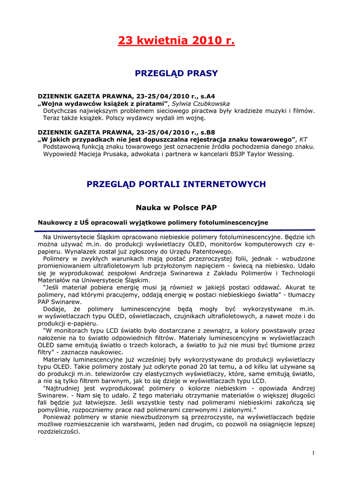 23 kwietnia 2010 r. PRZEGLĄD PRASY DZIENNIK GAZETA PRAWNA, 23-25/04/2010 r., s.A4 „Wojna wydawców książek z piratami”, Sylwia Czubkowska Dotychczas największym problemem sieciowego piractwa były kradzieże muzyki i filmów. Teraz także książek. Polscy wydawcy wydali im wojnę. DZIENNIK GAZETA PRAWNA, 23-25/04/2010 r., s.B8 „W jakich przypadkach nie jest dopuszczalna rejestracja znaku towarowego”, KT Podstawową funkcją znaku towarowego jest oznaczenie źródła pochodzenia danego znaku. Wypowiedź Macieja Prusaka, adwokata i partnera w kancelarii BSJP Taylor Wessing. PRZEGLĄD PORTALI INTERNETOWYCH Nauka w Polsce PAP Naukowcy z UŚ opracowali wyjątkowe polimery fotoluminescencyjne Na Uniwersytecie Śląskim opracowano niebieskie polimery fotoluminescencyjne. Będzie ich można używać m.in. do produkcji wyświetlaczy OLED, monitorów komputerowych czy epapieru. Wynalazek został już zgłoszony do Urzędu Patentowego. Polimery w zwykłych warunkach mają postać przezroczystej folii, jednak - wzbudzone promieniowaniem ultrafioletowym lub przyłożonym napięciem - świecą na niebiesko. Udało się je wyprodukować zespołowi Andrzeja Swinarewa z Zakładu Polimerów i Technologii Materiałów na Uniwersytecie Śląskim. "Jeśli materiał pobiera energię musi ją również w jakiejś postaci oddawać. Akurat te polimery, nad którymi pracujemy, oddają energię w postaci niebieskiego światła" - tłumaczy PAP Swinarew. Dodaje, że polimery luminescencyjne będą mogły być wykorzystywane m.in. w wyświetlaczach typu OLED, oświetlaczach, czujnikach ultrafioletowych, a nawet może i do produkcji e-papieru. "W monitorach typu LCD światło było dostarczane z zewnątrz, a kolory powstawały przez nałożenie na to światło odpowiednich filtrów. Materiały luminescencyjne w wyświetlaczach OLED same emitują światło o trzech kolorach, a światło to już nie musi być tłumione przez filtry" - zaznacza naukowiec. Materiały luminescencyjne już wcześniej były wykorzystywane do produkcji wyświetlaczy typu OLED. Takie polimery zostały już odkryte ponad 20 lat temu, a od kilku lat używane są do produkcji m.in. telewizorów czy elastycznych wyświetlaczy, które, same emitują światło, a nie są tylko filtrem barwnym, jak to się dzieje w wyświetlaczach typu LCD. "Najtrudniej jest wyprodukować polimery o kolorze niebieskim - opowiada Andrzej Swinarew. - Nam się to udało. Z tego materiału otrzymanie materiałów o większej długości fali będzie już łatwiejsze. Jeśli wszystkie testy nad polimerami niebieskimi zakończą się pomyślnie, rozpoczniemy prace nad polimerami czerwonymi i zielonymi." Ponieważ polimery w stanie niewzbudzonym są przezroczyste, na wyświetlaczach będzie możliwe rozmieszczenie ich warstwami, jeden nad drugim, co pozwoli na osiągnięcie lepszej rozdzielczości. 1 "Na razie wzbudzamy polimery przez promieniowanie ultrafioletowe. Następuje tu zjawisko fotoluminescencji - wzbudzenie w polimerze światła następuje przez jego oświetlenie. Ale przy produkcji wyświetlaczy będzie wykorzystywane zjawisko elektroluminescencji polimerów - światło będzie powstawało dzięki przyłożeniu napięcia elektrycznego" - tłumaczy Swinarew pracownik UŚ. Przypomina, że w wyświetlaczach OLED problemem było to, że materiały luminescencyjne zwykle szybko się zużywały. Dawniej mogły świecić około 5 tys. godzin, czyli nieustannie przez niecałe 7 miesięcy. Współczesne polimery mają wytrzymałość niemal 40 razy dłuższą. Czy materiał, nad którym pracuje zespół z Uniwersytetu Śląskiego będzie świecić równie długo? "Jeszcze tego nie wiemy - przyznaje naukowiec. - Nad trwałością naszych materiałów są prowadzone badania, które są dosyć czasochłonne. Trzeba je będzie wykonać na setkach próbek i wielokrotnie powtórzyć, żeby mieć pewność, co do ich wytrzymałości. Wyniki powinny być znane w połowie roku." Prace nad polimerami fotoluminescencyjnymi trwają już na Uniwersytecie Śląskim 3 lata. Konkurs na esej o komercjalizacji nauki Organizatorzy Letnich Praktyk Badawczych we współpracy z Ambasadą Brytyjską organizują konkurs dla studentów na najlepszy esej na temat komercjalizacji nauki w Polsce. Prace - napisane w języku angielskim i nie przekraczające 2 stron znormalizowanego maszynopisu - można przesyłać do 3 maja. Temat eseju brzmi: "Polish approach to science commercialization as opposed to growth of industrial mathematics in the United Kingdom". Celem konkursu - jak informują organizatorzy - jest zbadanie i opisanie czynników sprawiających, że komercjalizacja badań naukowych w Polsce rozwija się inaczej niż w krajach Zachodu. Organizatorzy zwracają uwagę na Wielką Brytanię, gdzie współpraca między firmami a środowiskiem akademickim w obszarze szeroko pojętych zastosowań matematyki trwa już od ponad 50 lat. Rozwój europejskiej Doliny Krzemowej oraz tzw. fenomen Cambridge sprawiają, że naturalnym jest poszukiwanie wzorców dla polskiej nauki w tym obszarze. Autorzy najlepszych prac będą mogli wziąć udział w pierwszych polskich ESGI (European Study Groups with Industry), czyli warsztatach dotyczących komercjalizacji odkryć matematycznych. ESGI odbędą się na przełomie września i października w Warszawie. Laureaci konkursu będą też mieli możliwość dostania się na VI Letnie Praktyki Badawcze z pominięciem procesu rekrutacji. Czekają na nich również upominki ufundowane m.in. przez Ambasadę Brytyjską. Więcej informacji o konkursie można znaleźć na stronie: http://www.praktyki.ibspan.waw.pl/konkurs/. *** LPB są organizowane przez Instytut Badań Systemowych Polskiej Akademii Nauk, Centrum Zastosowań Matematyki Instytutu Matematycznego Polskiej Akademii Nauk oraz Wyższą Szkołę Informatyki Stosowanej i Zarządzania. Wp.pl ACTA: wymiana plików nielegalna Ujawniona ostatnio robocza wersja umowy o ochronie praw autorskich ACTA zak