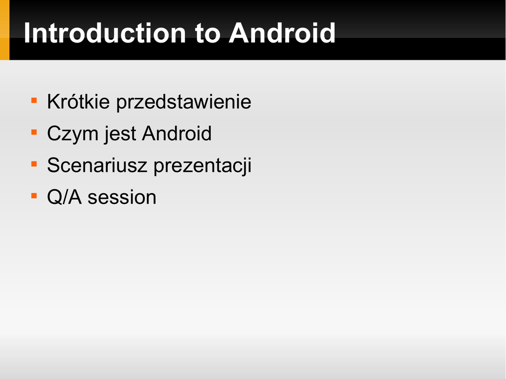 Introduction to Android Krótkie przedstawienie Czym jest Android Scenariusz prezentacji Q/A session Krótkie przedstawienie Kim jestem? Zainteresowania Dlaczego Android? Czym jest Android Bazuje na Linuxie Języki w jakich możecie pisać (Java, Groovy, Scala, C i pochodne, Java script(phonegap)) Market share, Gartner - ”do 2012 Android stanie się drugim najpopularniejszym systemem dla smartphonów.” MIC - ”w 2013, 31.8 millionów telefonów na Androidzie i 126 million urządzeń na Androidzie (tablety etc.). Scenariusz prezetacji Komponenty aplikacji Androida Cykl życia Activity Cykl życia Service (usługi) Narzędzia do feedback'owania użytkownika Przechowywanie danych Budowa View Q/A Komponenty aplikacji Activities Services Broadcast i Intent Receivers Content Providers Cykl życia Activity onCreate onStart onResume onPause onStop onDestroy Cykl życia Service Różnice między onCreate i onStart onResume, onPause, onStop nie są wymagane onBind onDestroy Narzędzia do feedback'owania użytkownika Toast messages AlertBoxes Notification Toasts i Alert notifications Toasts: Tylko informowanie użytkownika bez możliwości interakcji Któtki czas trwania Nie przerywają przepływu aplikacji (nieinwazyjny UX) Alerty Możliwość (konieczność!) ingerencji użytkownika Możliwość dodania obrazków/tytułu etc. Trwają aż użytkownik podejmie akcję Przerywają przepływ aplikacji (inwazyjny UX) Przykłady Toast'a i Alert Box'a Notyfikacje Z reguły startowane z Services Możliwość dodania własnej grafiki, dzwięku, pracy diody Dwa typy ongoing i isntant Przechowywanie danych SQLite Content Providers Różnice w kontekstach użycia O czym należy pamiętać gdy korzystamy z SQLite zamiast Content Provider'ów SQLite Self-contained (serwer nie jest wymagany) Transactional engine Unikalny dla konkretnej aplikacji Content Provider Implementacja content providera kroki: Rozszerzenie ContentProvider class Zdefiniowainie CONTENT_URI Zdefiniowanie przestrzeni do trzymania danych (przeważnie baza danych) Stworzenie nazw kolumn dla komunikacji z klientem Definicja procesu za pomocą którego dane binarne są zwracane do klienta Deklaracja public static String której klient użyje aby odnaleźć kolumny Implelemntacja metod CRUD Kursora Update AndroidManifest.xml z deklaracją <provider> Definicja typów MIME dla nowych typów danych Budowa View Nowy system do zarządzania GUI dla Java ecosphere Model-View-Controller Model – guts aplikacji View – feedback aplikacji skierowany do użytkownika Controller – część aplikacji która odpowiada na akcje użytkownika Przykładowy View z hierarchią Hierarchia widoków: LinearLayout (horizontal) Button(width:wrap_content) TextView (width:fill_parent) EditText(width:fill_parent) TextView(width:fill_parent) EditText(width:fill_parent)/E ditText(height:fill_parent) Sesja Q/A i podziękowania