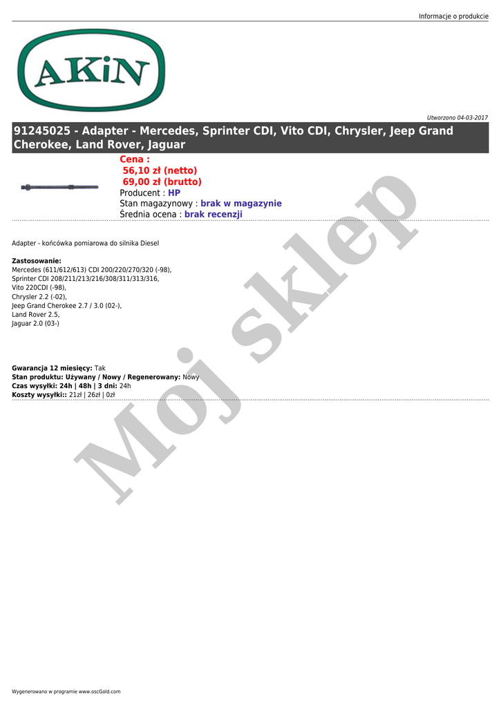 Informacje o produkcie Utworzono 04-03-2017 91245025 - Adapter - Mercedes, Sprinter CDI, Vito CDI, Chrysler, Jeep Grand Cherokee, Land Rover, Jaguar Cena : 56,10 zł (netto) 69,00 zł (brutto) ep Producent : HP Stan magazynowy : brak w magazynie Średnia ocena : brak recenzji Zastosowanie: Mercedes (611/612/613) CDI 200/220/270/320 (-98), Sprinter CDI 208/211/213/216/308/311/313/316, Vito 220CDI (-98), Chrysler 2.2 (-02), Jeep Grand Cherokee 2.7 / 3.0 (02-), Land Rover 2.5, Jaguar 2.0 (03-) sk l Adapter - końcówka pomiarowa do silnika Diesel koncowka, koncówka, końcowka, Diesla 2,0 2,2 2,7 3,0 2,5 M oj Gwarancja 12 miesięcy: Tak Stan produktu: Używany / Nowy / Regenerowany: Nowy Czas wysyłki: 24h | 48h | 3 dni: 24h Koszty wysyłki:: 21zł | 26zł | 0zł Wygenerowano w programie www.oscGold.com