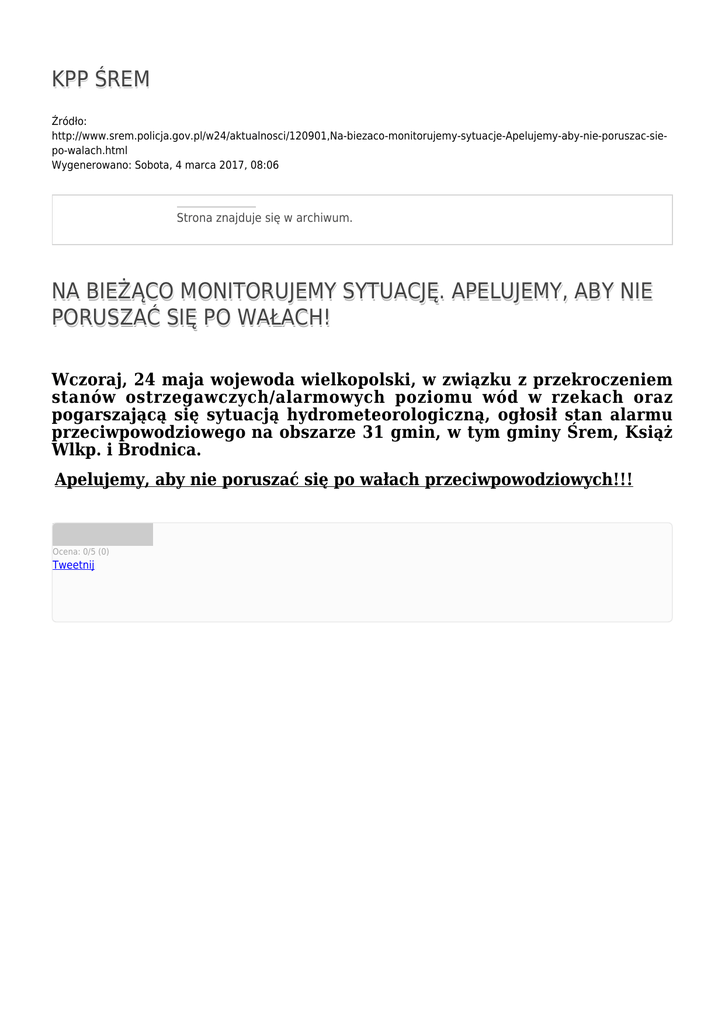 KPP ŚREM Źródło: http://www.srem.policja.gov.pl/w24/aktualnosci/120901,Na-biezaco-monitorujemy-sytuacje-Apelujemy-aby-nie-poruszac-siepo-walach.html Wygenerowano: Sobota, 4 marca 2017, 08:06 Strona znajduje się w archiwum. NA BIEŻĄCO MONITORUJEMY SYTUACJĘ. APELUJEMY, ABY NIE PORUSZAĆ SIĘ PO WAŁACH! Wczoraj, 24 maja wojewoda wielkopolski, w związku z przekroczeniem stanów ostrzegawczych/alarmowych poziomu wód w rzekach oraz pogarszającą się sytuacją hydrometeorologiczną, ogłosił stan alarmu przeciwpowodziowego na obszarze 31 gmin, w tym gminy Śrem, Książ Wlkp. i Brodnica. Apelujemy, aby nie poruszać się po wałach przeciwpowodziowych!!! Ocena: 0/5 (0) Tweetnij