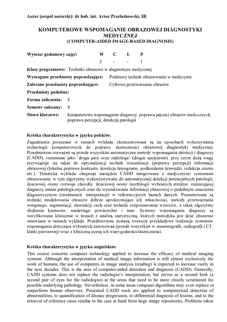 KOMPUTEROWE WSPOMAGANIE OBRAZOWEJ DIAGNOSTYKI MEDYCZNEJ (COMPUTER-AIDED IMAGE-BASED DIAGNOSIS) ! " # W C L P 2 - - 1 Klasy programowe: Techniki obrazowe w diagnostyce medycznej ! $ % Podstawy technik obrazowania w medycynie & % ! $ % Cyfrowe przetwarzanie obrazów Przedmioty podobne: Forma zaliczenia: E Semestr zalecany: 8 ' % komputerowe wspomaganie diagnozy( poprawa percepcji, detekcja patologii ) * ) +,- , . ,/ * 012 *3 +,4 5- 6 78 9 14 : 9 1; ( < % ! " = ,> , 8 : 27 : 2, ) * +? @4 , : 7 - +,6 ,1; - 9 /A,8? @/ * : 17:B+*- ,: 7 B 7 1 ; : * D* > 22 / * 6 )? B7+*- 9 1; 8* ) * ) +,- 9 @/ ? B7 1 4 : E + 4 7 8 6 2* B 7 6 + * 4 - , F , G @ C ) + 4 7 8 7 - @4 9 @B / 26 , ? B * 6 , B 9 1 4 HI J K K L ( + * 4 ? 6 2 , : 7 . , / * M8 +? > , ) , + , * 1 4 ? + , 8 2 * D* > , N * 012 @C :, * 3 + , zowej @) * @* 3 , 1 ; - 9 / * + 4 9 @B , : 2 , diagnostyki medycznej. : 7 6 7 B * 8 9 - @) * 6 , > , : 2 , 8 7 B 7 / 1. 2 2 8 2 , > : * 4 9 H L 8 +? > 27 @) *. +4 7 : 27 ( ) +4 9 1 4 9 6 8 ? F C - , > O ) + 4 9 - 2 C 4 ? . 7 @ 2 O B , / F 7 8 * * ) B 9 6 , D 2 4 , 1 . 2 B 7 1 hnik wizualizacji (poprawy percepcji) informacji H * 3 + , 4 * - 7. D * / , D : , ) * ) + , - , / * : B + , @B ? ( / * + 7 / 1. , ; 2 @ B * > + , 6 ? ( ) * 8 / + 7 0 D 7 : 2 7 / + , - O 8 4 2 ( + 7 8 ? / 1. , @ 4 ? 6 ? L I J K K 7 B 1 P P Q 7 6 , B 9 / , - 9 / A , 8 ? * 3 7. 6 ? . 7 : , + 4 O 8 4 2 , 2: B 7 > + * - , : 7 4 6 7 8 9 1 4 : 9 6 2 @9 @B 7 6 , 6 2 obrazowania, w tym algorytmy wykorzystywane do automatycznej detekcji potencjalnych patologii, 2 D* 0 1 2* - 7. * 1 7 : 9 + * 4 - *. ? 1 ; * + * 3 9 ( 2D* 0 1 2* - 7. * 1 7 : 9 6 * + R* D* > 22 - 9 3 + , : 9 1 ; @B +? / B? + ( + 5 F : 21 ? . C 1 7. diagnozy zmian patologicznych oraz do wyszukiwania informacji obrazowej o podobnym znaczeniu H L E 8 2, > : * @B9 1 4 : 9 6 B 7 1 ; : 2/ 2 @B +? / B? + , 1 ; ( 6 * 8 7 D* - , : 2, 2 : B 7 + ) + 7 B , 1. 2 *3 +,45- 8 *3 +4 7 - +7R7+7: 19. : 9 1; , ) +* / @9 6 ?. C 1 7 21 ; 3 ,4,1; 8,:9 1; P - A , 0 1 2- * 0 1 2( +747:B*- ,: 7 6 7B* 89 @C ) +4 7B- , +4 , : 2, - @B O ) : 7 > * ( @ 7 > 6 7 : B , 1. 2( 7 / @B + , / 1. 2 1 7 1 ; * + , 4 B 7 1 ; : 2/ 2 + * 4 ) * 4 : , - , : 2 , - 4 * + 1 5 - ( , B , / F 7 , D> * +9 B 6 9 0D7 8 4 7 : 2, / * : B? +5 - ( + 7 : 8 7 + 2: > ? ) * - 27 +4 1 ; : 2 2 2: : 7 P S 9 @B 7 6 9 - @) * 6 , > , : 2, 8 2, > : * 4 9 @C - 7 +9 R2/ * - , : 7 / D2: 21 4 : 27 - B 7 @B , 1 ; 4 , : , D24 C @B , B9 @B 9 1 4 : C ( / B 5 +9 1 ; 6 7 B * 8 9 / , . 7 @B 8 * 0 T * 3 @4 7 + : 27 E + 4 7 8 @B , - 2* : 7 4 * @B , : C - + 7 @4 1 2 7 ) + 4 9 / A , 8 * - 7 + 7 , D24 , 1. 7 @9 @B 7 6 5 H I - @) * 6 , > , : 2 , 8 * B9 1 4 C 1 7 - 9 3 + , : 9 1 ; 4 , @B * @ * - , G ) + 4 7 8 7 - @4 9 @B / 26 - 6 , 6 6 * > + , R22 ( + , 8 2* > + , R22 2 Q L / D , B / 2 ) 2 7 + @ 2 * - 7. - + , 4 4 / D 2 : 2 1 4 : C * 1 7 : C 2 1 ; - 2 , + 9 > * 8 : * 0 1 2U @ / ? B 7 1 4 : * 0 1 2 P * 6 ,- 2, : , - +,6 ,1; - 9 /A,8? P < % ! " This course concerns computer technology applied to increase the efficacy of medical imaging systems. Although the interpretation of medical image information is still almost exclusively the work of humans, the use of computers in image analysis (reading) is expected to increase vastly in the next decades. This is the area of computer-aided detection and diagnosis (CADD). Generally, CADD systems does not replace the radiologist’s interpretation, but serves as a second look (a second pair of eyes for the radiologist) at the areas that need to be more closely scrutinized for possible underlying pathology. Nevertheless, in some areas computer algorithms may even replace or outperform human observers. Presented CADD tools are applied to computerized detection of abnormalities, to quantification of disease progression, to differential diagnosis of lesions, and to the retrieval of reference cases similar to the case at hand from large image repositories. Problems taken into consideration focus on image modeling, segmentation and feature extraction using statistical models of shape and appearance and techniques from pattern recognition. Moreover, the course fixes on methods of subjective interpretation of image features those are important for diagnosis (shape and contour of structures, texture, local contrast, context of appearance) and clinical verification in experiments with statistical analysis of scores given in diagnostic and even therapy terms. Given examples concern CADD systems for various applications (mammography, chest, both plain radiography and CT), evaluate their performance in clinical practice and to promote their use in the clinic (statistical hypothesis tests). V W# - Wprowadzenie (2h): schemat systemów wspomagania decyzji diagnostycznych, podstawowe d 7 R 2 : 2 1 . 7 2 1 7 D 7 X ) + 4 7 > D C 8 6 7 B * 8 6 * 8 7 D * - , : 2 , * 3 + , 4 5 - Y -statystycznych (analiza korelacyjna, L HE I J + * 4 / A, 8 9 A C 1 4 : 7 2 3 + 4 7 > * - 7 ( Z + 5 8 A, [ , +/ * - , ( ? / +9 B 7 ) * D, [ , +/ * - , ( B+ , : @R* + 6 , 1 9 . : 9 1 ; ( L H ) + 4 7 / @ 4 B , A 1 7 : 2 , R , D / * - 7 ( > 7 : 7 + , 1 . 2 6 * 8 7 D * - , : 2 7 ) + * 1 7 @ ? , / - 2 4 9 1 .–2 ) + 4 9 / A ad mammografii); - Falkowa charakterystyka 1 ; , + , / B 7 + 9 @B 9 1 4 : 9 1 ; obrazów *3 +,4? 4, )*6 *1C (6h): opis, uwydatnienie i R , D/ * - 9 1 ; + 5 F : 7. ) +4 7 / @4 B,A1 7 G ekstrakcja ) * @B , 1 2 H cech 3 ,49 ortogonalne, biortogonalne, pakiety falek, nadmiarowe, 2W, wedgelets etc.); - Poprawa percepcji informacji obrazowej (3h): semantyczna definicja informacji, odszumianie, - - ,F:9 1; X ] %! " \ + 7 8 ? / 1. , : , 8 6 2 , + * - * 0 1 2( ) * ) + , - , D* / , D: 7 > * / * : B + , @B? ( 7 / @) * : * - , : 27 @B +? / B? + 8 2, > : * @B 9 1 4 : 27 ^ Y 1 7 1 ; 9 . , / * 0 1 2 2 diagnostycznej H - 2, + 9 > * 8 : * 0 1 2 * 3 + , 4 5 - X @? 3 27 / B 9 - : 7 6 7 B * 8 9 * 1 7 : 9 . , / * 0 1 2 2 - 2, + 9 > * 8 : * 0 1 2 - 9 / * + 4 9 @B? . C 1 7 I L 6 P2 : P / + 4 9 - 7 _ ` ( , : , D 2 4 O @ B , B 9 @ B 9 1 4 : C - 9 : 2 / 5 - ( / D 2 : 2 1 4 : 7 - , + ? 