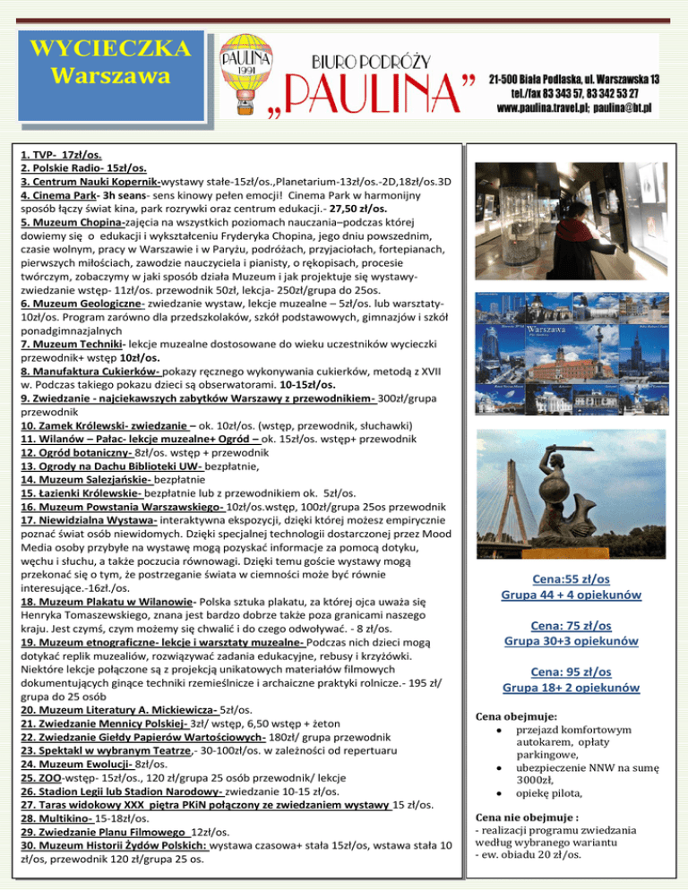 WYCIECZKA WYCIECZKA Warszawa DO PARYŻA 6 dni 1. TVP- 17zł/os. 2. Polskie Radio- 15zł/os. 3. Centrum Nauki Kopernik-wystawy stałe-15zł/os.,Planetarium-13zł/os.-2D,18zł/os.3D 4. Cinema Park- 3h seans- sens kinowy pełen emocji! Cinema Park w harmonijny sposób łączy świat kina, park rozrywki oraz centrum edukacji.- 27,50 zł/os. 5. Muzeum Chopina-zajęcia na wszystkich poziomach nauczania–podczas której dowiemy się o edukacji i wykształceniu Fryderyka Chopina, jego dniu powszednim, czasie wolnym, pracy w Warszawie i w Paryżu, podróżach, przyjaciołach, fortepianach, pierwszych miłościach, zawodzie nauczyciela i pianisty, o rękopisach, procesie twórczym, zobaczymy w jaki sposób działa Muzeum i jak projektuje się wystawyzwiedzanie wstęp- 11zł/os. przewodnik 50zł, lekcja- 250zł/grupa do 25os. 6. Muzeum Geologiczne- zwiedzanie wystaw, lekcje muzealne – 5zł/os. lub warsztaty10zł/os. Program zarówno dla przedszkolaków, szkół podstawowych, gimnazjów i szkół ponadgimnazjalnych 7. Muzeum Techniki- lekcje muzealne dostosowane do wieku uczestników wycieczki przewodnik+ wstęp 10zł/os. 8. Manufaktura Cukierków- pokazy ręcznego wykonywania cukierków, metodą z XVII w. Podczas takiego pokazu dzieci są obserwatorami. 10-15zł/os. 9. Zwiedzanie - najciekawszych zabytków Warszawy z przewodnikiem- 300zł/grupa przewodnik 10. Zamek Królewski- zwiedzanie – ok. 10zł/os. (wstęp, przewodnik, słuchawki) 11. Wilanów – Pałac- lekcje muzealne+ Ogród – ok. 15zł/os. wstęp+ przewodnik 12. Ogród botaniczny- 8zł/os. wstęp + przewodnik 13. Ogrody na Dachu Biblioteki UW- bezpłatnie, 14. Muzeum Salezjańskie- bezpłatnie 15. Łazienki Królewskie- bezpłatnie lub z przewodnikiem ok. 5zł/os. 16. Muzeum Powstania Warszawskiego- 10zł/os.wstęp, 100zł/grupa 25os przewodnik 17. Niewidzialna Wystawa- interaktywna ekspozycji, dzięki której możesz empirycznie poznać świat osób niewidomych. Dzięki specjalnej technologii dostarczonej przez Mood Media osoby przybyłe na wystawę mogą pozyskać informacje za pomocą dotyku, węchu i słuchu, a także poczucia równowagi. Dzięki temu goście wystawy mogą przekonać się o tym, że postrzeganie świata w ciemności może być równie interesujące.-16zł./os. 18. Muzeum Plakatu w Wilanowie- Polska sztuka plakatu, za której ojca uważa się Henryka Tomaszewskiego, znana jest bardzo dobrze także poza granicami naszego kraju. Jest czymś, czym możemy się chwalić i do czego odwoływać. - 8 zł/os. 19. Muzeum etnograficzne- lekcje i warsztaty muzealne- Podczas nich dzieci mogą dotykać replik muzealiów, rozwiązywać zadania edukacyjne, rebusy i krzyżówki. Niektóre lekcje połączone są z projekcją unikatowych materiałów filmowych dokumentujących ginące techniki rzemieślnicze i archaiczne praktyki rolnicze.- 195 zł/ grupa do 25 osób 20. Muzeum Literatury A. Mickiewicza- 5zł/os. 21. Zwiedzanie Mennicy Polskiej- 3zł/ wstęp, 6,50 wstęp + żeton 22. Zwiedzanie Giełdy Papierów Wartościowych- 180zł/ grupa przewodnik 23. Spektakl w wybranym Teatrze,- 30-100zł/os. w zależności od repertuaru 24. Muzeum Ewolucji- 8zł/os. 25. ZOO-wstęp- 15zł/os., 120 zł/grupa 25 osób przewodnik/ lekcje 26. Stadion Legii lub Stadion Narodowy- zwiedzanie 10-15 zł/os. 27. Taras widokowy XXX piętra PKiN połączony ze zwiedzaniem wystawy 15 zł/os. 28. Multikino- 15-18zł/os. 29. Zwiedzanie Planu Filmowego 12zł/os. 30. Muzeum Historii Żydów Polskich: wystawa czasowa+ stała 15zł/os, wstawa stała 10 zł/os, przewodnik 120 zł/grupa 25 os. Cena:55 zł/os Grupa 44 + 4 opiekunów Cena: 75 zł/os Grupa 30+3 opiekunów Cena: 95 zł/os Grupa 18+ 2 opiekunów Cena obejmuje: przejazd komfortowym autokarem, opłaty parkingowe, ubezpieczenie NNW na sumę 3000zł, opiekę pilota, Cena nie obejmuje : - realizacji programu zwiedzania według wybranego wariantu - ew. obiadu 20 zł/os.