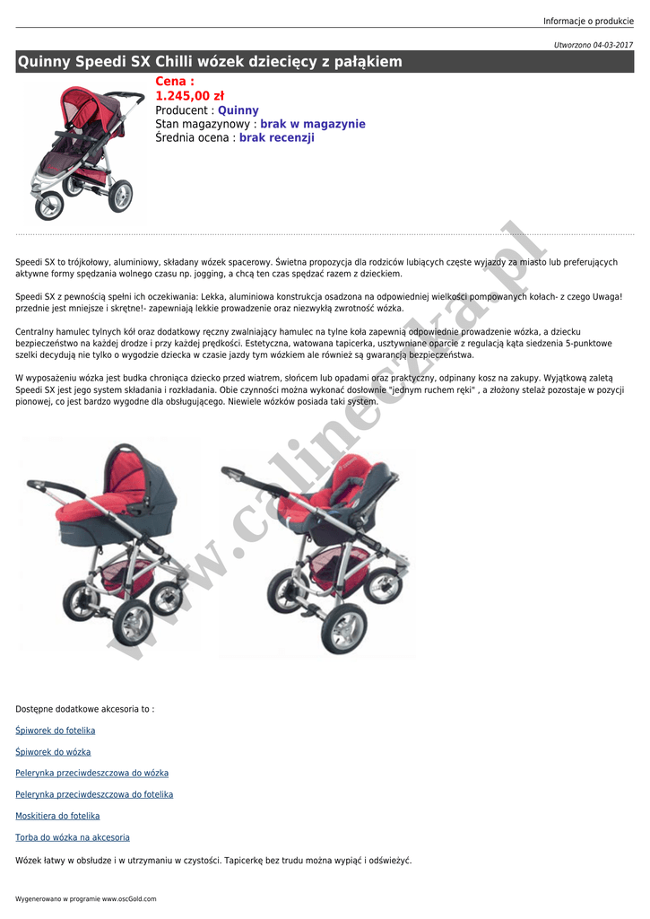 Informacje o produkcie Utworzono 04-03-2017 Quinny Speedi SX Chilli wózek dziecięcy z pałąkiem Cena : 1.245,00 zł pl Producent : Quinny Stan magazynowy : brak w magazynie Średnia ocena : brak recenzji Speedi SX to trójkołowy, aluminiowy, składany wózek spacerowy. Świetna propozycja dla rodziców lubiących częste wyjazdy za miasto lub preferujących aktywne formy spędzania wolnego czasu np. jogging, a chcą ten czas spędzać razem z dzieckiem. zk a. Speedi SX z pewnością spełni ich oczekiwania: Lekka, aluminiowa konstrukcja osadzona na odpowiedniej wielkości pompowanych kołach- z czego Uwaga! przednie jest mniejsze i skrętne!- zapewniają lekkie prowadzenie oraz niezwykłą zwrotność wózka. Centralny hamulec tylnych kół oraz dodatkowy ręczny zwalniający hamulec na tylne koła zapewnią odpowiednie prowadzenie wózka, a dziecku bezpieczeństwo na każdej drodze i przy każdej prędkości. Estetyczna, watowana tapicerka, usztywniane oparcie z regulacją kąta siedzenia 5-punktowe szelki decydują nie tylko o wygodzie dziecka w czasie jazdy tym wózkiem ale również są gwarancją bezpieczeństwa. w w w .c al in ec W wyposażeniu wózka jest budka chroniąca dziecko przed wiatrem, słońcem lub opadami oraz praktyczny, odpinany kosz na zakupy. Wyjątkową zaletą Speedi SX jest jego system składania i rozkładania. Obie czynności można wykonać dosłownie "jednym ruchem ręki" , a złożony stelaż pozostaje w pozycji pionowej, co jest bardzo wygodne dla obsługującego. Niewiele wózków posiada taki system. Dostępne dodatkowe akcesoria to : Śpiworek do fotelika Śpiworek do wózka Pelerynka przeciwdeszczowa do wózka Pelerynka przeciwdeszczowa do fotelika Moskitiera do fotelika Torba do wózka na akcesoria Wózek łatwy w obsłudze i w utrzymaniu w czystości. Tapicerkę bez trudu można wypiąć i odświeżyć. Wygenerowano w programie www.oscGold.com Wymiary w w w .c al in Masz pytania? Napisz [email protected] lub zadzwoń 022-61003 ec zk a. pl Szerokość wew. 36 cm Głębokość siedziska 21 cm Wysokość oparcia 46 cm Złożony 83x53x34cm (dł,szer,wys) Rozłożony 106x65x102cm (dł,szer,wys) Na bazie tego wózka można tworzyć tzw. zestawy "3w1" tzn. po wypięciu tapicerki z wózka spacerowego, do stelaża można wpinać foteliki samochodowe Maxi-Cosi (do 13 kg) lub Maxi-Dreami - gondolę głębokiego wózka.