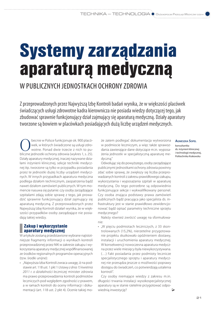 TECHNIKA – TECHNOLOGIA OGÓLNOPOLSKI PRZEGLĄD MEDYCZNY 3/2014 Systemy zarządzania aparaturą medyczną W PUBLICZNYCH JEDNOSTKACH OCHRONY ZDROWIA Z przeprowadzonych przez Najwyższą Izbę Kontroli badań wynika, że w większości placówek świadczących usługi zdrowotne kadra kierownicza nie posiada wiedzy dotyczącej tego, jak zbudować sprawnie funkcjonujący dział zajmujący się aparaturą medyczną. Działy aparatury tworzone są bowiem w placówkach posiadających dużą liczbę urządzeń medycznych. O becnie w Polsce funkcjonuje ok. 900 placówek, w których świadczone są usługi zdrowotne. Ponad dwie trzecie z nich to publiczne jednostki ochrony zdrowia (wykres 1, s. 25). Działy aparatury medycznej, inaczej nazywane działami inżynierii klinicznej, sekcje techniki medycznej itp. tworzone są tylko w przypadku posiadania przez te jednostki dużej liczby urządzeń medycznych. W innych przypadkach aparatura medyczna podlega działom technicznym, zaopatrzenia bądź nawet działom zamówień publicznych. W tym momencie nasuwa się pytanie: czy osoby zarządzające szpitalami zdają sobie sprawę z tego, jak prowadzić sprawnie funkcjonujący dział zajmujący się aparaturą medyczną. Z przeprowadzonych przez Najwyższą Izbę Kontroli działań wynika, że w większości przypadków osoby zarządzające nie posiadają takiej wiedzy. Zakup i wykorzystanie aparatury medycznej W artykule zostaną przedstawione wybrane najistotniejsze fragmenty informacji o wynikach kontroli przeprowadzonej przez NIK w zakresie zakupu i wykorzystania aparatury medycznej współfinansowanej ze środków regionalnych programów operacyjnych (tzw. środki unijne): • „Najwyższa Izba Kontroli zwraca uwagę, iż na podstawie art. 118 ust. 1 pkt 1 Ustawy z dnia 15 kwietnia 2011 r. o działalności leczniczej minister zdrowia ma prawo przeprowadzenia kontroli podmiotów leczniczych pod względem zgodności z prawem, a w ramach kontroli do oceny informacji i dokumentacji (art. 118 ust. 2 pkt 4). Ocenie takiej mo- że zatem podlegać dokumentacja wytworzona w podmiocie leczniczym, a więc także sprawozdania zawierające dane dotyczące m.in. wyposażenia jednostki w specjalistyczną aparaturę medyczną.” Odwołując się do powyższego, osoby zarządzające publicznymi jednostkami ochrony zdrowia powinny zdać sobie sprawę, że zwiększy się liczba przeprowadzanych kontroli z zakresu prawidłowego zakupu, wykorzystania i wyposażania szpitali w aparaturę medyczną. Do tego potrzebne są odpowiednio funkcjonujące sekcje i wykwalifikowany personel. Czy osoba znająca podstawy prawa zamówień publicznych bądź pracująca jako specjalista ds. infrastruktury jest w stanie prawidłowo zewidencjonować bądź opisać parametry techniczne sprzętu medycznego? Należy również zwrócić uwagę na sformułowanie: • „W pięciu podmiotach leczniczych, z 33 skontrolowanych (15,2%), nierzetelne przygotowanie projektu skutkowało opóźnieniem dostawy, instalacji i uruchomienia aparatury medycznej. W konsekwencji nowoczesna aparatura medyczna przez wiele miesięcy była niewykorzystywana. (…) Fakt posiadania przez podmioty lecznicze specjalistycznego sprzętu i aparatury medycznej nie przesądza jeszcze o możliwości poprawy dostępu do świadczeń, co potwierdzają ustalenia kontroli”. Czy osoby niemające wiedzy z zakresu m.in. długości trwania instalacji wysokospecjalistycznej aparatury są w stanie rzetelnie przygotować odpowiednią inwestycję? AGNIESZKA SOPEL konsultantka ds. inżynierii klinicznej i technologii medycznej, Politechnika Krakowska 21 OGÓLNOPOLSKI PRZEGLĄD MEDYCZNY 3/2014 TECHNIKA – TECHNOLOGIA Stanowisko ministra zdrowia 1 2 3 Fot. 1, 2, 3. Interfejs oprogramowania Medex. Źródło: www.medex.pl 22 W wyniku kontroli przeczytać można: • „Minister zdrowia nie dysponował również aktualnymi analizami nasycenia aparaturą medyczną w jednostkach ochrony zdrowia. Tymczasem z raportów cząstkowych konsultantów wojewódzkich, poprzez których konsultanci krajowi wypełniają swoje funkcje kontrolne, wynika, iż aparatura medyczna została wprawdzie w ostatnich latach znacząco zmodernizowana, jednak w wielu przypadkach nie jest właściwie wykorzystywana, a jej rozmieszczenie nie zawsze odpowiada potrzebom i możliwościom poszczególnych jednostek. Wątpliwości konsultantów budzi m.in. umieszczenie aparatury o bardzo wysokich parametrach technologicznych w szpitalach o przeciętnym profilu specjalistycznym. Czas pracy i efektywne wykorzystanie drogiego sprzętu diagnostycznego w tych placówkach są niewystarczające. Z drugiej strony w niektórych ośrodkach wyspecjalizowanych aparatura medyczna jest wyeksploatowana i posiada przestarzałe oprogramowanie, co zmusza te ośrodki do korzystania z usług podmiotów zewnętrznych”. W wystąpieniu pokontrolnym skierowanym do ministra zdrowia wnioskowano o: 1) przeprowadzenie analizy nasycenia jednostek ochrony zdrowia aparaturą wysokospecjalistyczną służącą do diagnostyki obrazowej i w oparciu o jej wyniki podjęcie działań wspierających proporcjonalne i odpowiednie do potrzeb rozmieszczenie tej aparatury; 2) podjęcie działań w celu wyegzekwowania terminowego dostarczania sprawozdań statystycznych przez podmioty do tego zobowiązane. Obowiązki podmiotów tworzących SP ZOZ Wnioski pokontrolne dotyczące aparatury medycznej kierowane do jednostek samorządu terytorialnego – podmiotów tworzących SPZOZ – dotyczyły m.in.: 1) dokonania analiz dotyczących wyposażenia podległych jednostek ochrony zdrowia w specjalistyczną aparaturę diagnostyczną, jej stanu technicznego i stopnia wykorzystania oraz dostępności badań diagnostycznych; 2) zapewnienia systematycznego uzyskiwania informacji o wyposażeniu szpitali w specjalistyczną aparaturę diagnostyczną; 3) podjęcia działań organizacyjnych w celu zapewnienia nadzoru nad podmiotami leczniczymi w zakresie zakupu i wykorzystania specjal