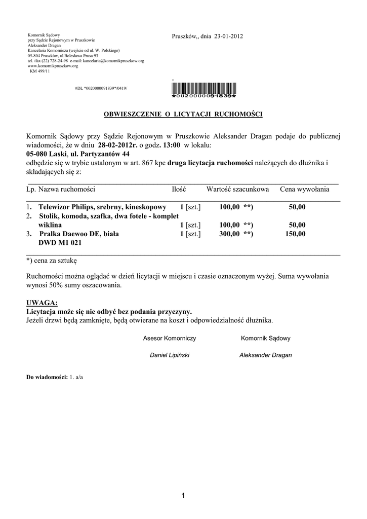 Komornik Sądowy przy Sądzie Rejonowym w Pruszkowie Aleksander Dragan Kancelaria Komornicza (wejście od ul. W. Polskiego) 05-804 Pruszków, ul.Bolesława Prusa 93 tel. /fax (22) 728-24-98 e-mail: [email protected] www.komornikpruszkow.org KM 499/11 Pruszków,, dnia 23-01-2012 #DL *0020000091839*/0419/ *0020000091839* OBWIESZCZENIE O LICYTACJI RUCHOMOŚCI Komornik Sądowy przy Sądzie Rejonowym w Pruszkowie Aleksander Dragan podaje do publicznej wiadomości, że w dniu 28-02-2012r. o godz. 13:00 w lokalu: 05-080 Laski, ul. Partyzantów 44 odbędzie się w trybie ustalonym w art. 867 kpc druga licytacja ruchomości należących do dłużnika i składających się z: ____________________________________________________________________________________ Lp. Nazwa ruchomości Ilość Wartość szacunkowa Cena wywołania _____________________________________________________________________________________ 1. Telewizor Philips, srebrny, kineskopowy 1 [szt.] 100,00 **) 50,00 2. Stolik, komoda, szafka, dwa fotele - komplet wiklina 1 [szt.] 100,00 **) 50,00 3. Pralka Daewoo DE, biała 1 [szt.] 300,00 **) 150,00 DWD M1 021 _____________________________________________________________________________________ *) cena za sztukę Ruchomości można oglądać w dzień licytacji w miejscu i czasie oznaczonym wyżej. Suma wywołania wynosi 50% sumy oszacowania. UWAGA: Licytacja może się nie odbyć bez podania przyczyny. Jeżeli drzwi będą zamknięte, będą otwierane na koszt i odpowiedzialność dłużnika. Asesor Komorniczy Komornik Sądowy Daniel Lipiński Aleksander Dragan Do wiadomości: 1. a/a 1