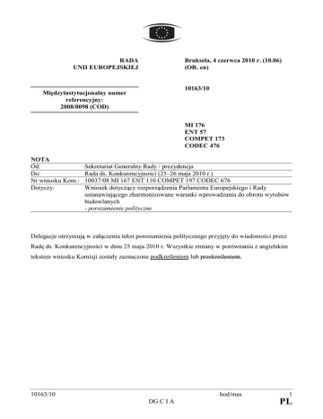 RADA UNII EUROPEJSKIEJ Bruksela, 4 czerwca 2010 r. (10.06) (OR. en) 10163/10 Międzyinstytucjonalny numer referencyjny: 2008/0098 (COD) MI 176 ENT 57 COMPET 173 CODEC 476 NOTA Od: Do: Nr wniosku Kom.: Dotyczy: Sekretariat Generalny Rady / prezydencja Rada ds. Konkurencyjności (25–26 maja 2010 r.) 10037/08 MI 167 ENT 110 COMPET 197 CODEC 676 Wniosek dotyczący rozporządzenia Parlamentu Europejskiego i Rady ustanawiającego zharmonizowane warunki wprowadzania do obrotu wyrobów budowlanych - porozumienie polityczne Delegacje otrzymują w załączeniu tekst porozumienia politycznego przyjęty do wiadomości przez Radę ds. Konkurencyjności w dniu 25 maja 2010 r. Wszystkie zmiany w porównaniu z angielskim tekstem wniosku Komisji zostały zaznaczone podkreśleniem lub przekreśleniem. 10163/10 hod/mas DG C I A 1 PL ZAŁĄCZNIK 2008/0098 (COD) Wniosek ROZPORZĄDZENIE PARLAMENTU EUROPEJSKIEGO I RADY USTANAWIAJĄCE ZHARMONIZOWANE WARUNKI WPROWADZANIA DO OBROTU WYROBÓW BUDOWLANYCH (Tekst mający znaczenie dla EOG) PARLAMENT EUROPEJSKI I RADA UNII EUROPEJSKIEJ, uwzględniając Traktat o funkcjonowaniu Unii Europejskiej, w szczególności jego art. 114, uwzględniając wniosek Komisji1, uwzględniając opinię Europejskiego Komitetu Ekonomiczno-Społecznego2, stanowiąc zgodnie ze zwykłą procedurą ustawodawczą, a takŜe mając na uwadze, co następuje: (1) Przepisy państw członkowskich wymagają, by obiekty budowlane były projektowane i wykonywane w sposób niezagraŜający bezpieczeństwu ludzi, zwierząt domowych ani mienia. 1 2 Dz.U. C z , s. . Dz.U. C z , s. . 10163/10 ZAŁĄCZNIK hod/mas DG C I A 2 PL (2) Przepisy te mają bezpośredni wpływ na wymagania w odniesieniu do wyrobów budowlanych. W konsekwencji wymogi te znajdują odzwierciedlenie w krajowych normach dotyczących takich wyrobów, krajowych aprobatach technicznych i innych krajowych specyfikacjach i regulacjach technicznych związanych z wyrobami budowlanymi. Wszelkie rozbieŜności takich wymagań stanowią przeszkodę w handlu na terytorium Unii. (2aa) Niniejsze rozporządzenie nie ma wpływu na prawo państw członkowskich do uszczegółowienia wymogów, które uznają za konieczne, by zagwarantować ochronę zdrowia, środowiska i pracowników podczas stosowania wyrobów. (2a) Państwa członkowskie dysponują przepisami, w tym wymogami, odnoszącymi się nie tylko do bezpieczeństwa obiektów budowlanych, lecz takŜe do zdrowia, trwałości, oszczędności energii, ochrony środowiska, aspektów gospodarczych i innych aspektów istotnych z punktu widzenia interesu publicznego. Obowiązujące na szczeblu Unii lub na szczeblu krajowym przepisy ustawowe i wykonawcze, środki administracyjne oraz orzecznictwo dotyczące obiektów budowlanych mogą mieć wpływ na wymogi dotyczące wyrobów budowlanych. Ze względu na to, Ŝe ich wpływ na funkcjonowanie rynku wewnętrznego prawdopodobnie będzie bardzo zbliŜony, właściwe jest uznanie tych przepisów ustawowych i wykonawczych, środków administracyjnych oraz orzecznictwa do celów niniejszego rozporządzenia za „przepisy”. 10163/10 ZAŁĄCZNIK hod/mas DG C I A 3 PL (2b) W stosownych przypadkach przepisy odnoszące się do przeznaczenia wyrobu budowlanego w jednym z państw członkowskich, mające na celu spełnienie podstawowych wymogów dotyczących obiektów budowlanych, określają podstawowe cechy wyrobu, w odniesieniu do których deklarowane są właściwości uŜytkowe. (3) Dyrektywa Rady 89/106/EWG z dnia 21 grudnia 1988 r. w sprawie zbliŜenia przepisów ustawowych, wykonawczych i administracyjnych państw członkowskich odnoszących się do wyrobów budowlanych3 miała na celu usuwanie barier technicznych w handlu w dziedzinie wyrobów budowlanych, stojących na przeszkodzie urzeczywistnieniu swobodnego przepływu takich wyrobów na rynku wewnętrznym. (4) DąŜąc do realizacji tego celu, dyrektywa 89/106/EWG przewidywała ustanowienie norm zharmonizowanych dla wyrobów budowlanych oraz udzielanie europejskiej aprobaty technicznej. (5) Dyrektywę 89/106/EWG naleŜy zastąpić, zmierzając do uproszczenia obecnych ram prawnych i uczynienia ich jaśniejszymi, jak równieŜ do poprawy przejrzystości i skuteczności obecnie obowiązujących środków. (6) […] (7) Rozporządzenie Parlamentu Europejskiego i Rady (WE) nr 765/2008 z dnia 9 lipca 2008 r. ustanawiające wymagania w zakresie akredytacji i nadzoru rynku odnoszące się do warunków wprowadzania produktów do obrotu i uchylające rozporządzenie (EWG) nr 339/93 oraz decyzja Parlamentu Europejskiego i Rady nr 768/2008/WE z dnia 9 lipca 2008 r. w sprawie wspólnych ram dotyczących wprowadzania produktów do obrotu, uchylająca decyzję Rady 93/465/EWG, tworzą ogólne ramy prawne wprowadzania produktów na rynek wewnętrzny. Niniejsze rozporządzenie powinno zatem uwzględniać te ramy prawne. 3 Dz.U. L 40 z 11.2.1989, s. 12. Dyrektywa ostatnio zmieniona rozporządzeniem (WE) nr 1882/2003 Parlamentu Europejskiego i Rady (Dz.U. L 284 z 31.10.2003, s. 1). 10163/10 ZAŁĄCZNIK hod/mas DG C I A 4 PL (8) Usunięcie przeszkód technicznych w dziedzinie budownictwa moŜliwe jest wyłącznie poprzez ustanowienie zharmonizowanych specyfikacji technicznych słuŜących do oceny właściwości uŜytkowych wyrobów budowlanych. (9) Do takich zharmonizowanych specyfikacji technicznych powinny się zaliczać badania, obliczenia i inne środki zdefiniowane w normach zharmonizowanych oraz w europejskich dokumentach oceny (EDO) do celów oceny właściwości uŜytkowych w odniesieniu do podstawowych cech wyrobów budowlanych. (10) Metody zastosowane przez państwa członkowskie w przyjętych przez nie wymaganiach dotyczących obiektów budowlanych, jak równieŜ inne przepisy krajowe odnoszące się do podstawowych cech wyrobów budowlanych, powinny być zgodne ze zharmonizowanymi specyfikacjami technicznymi. (11) […] (11a) W stosownych przypadkach naleŜy zachęcać do stosowania klas właściwości uŜytko