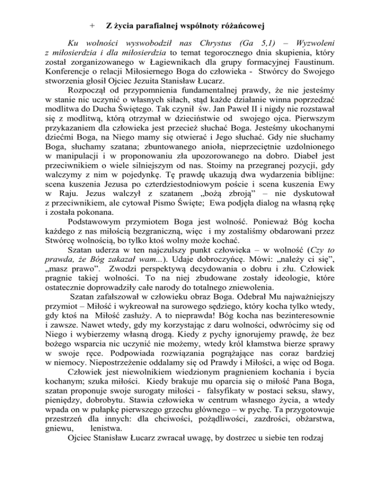 + Z życia parafialnej wspólnoty różańcowej Ku wolności wyswobodził nas Chrystus (Ga 5,1) – Wyzwoleni z miłosierdzia i dla miłosierdzia to temat tegorocznego dnia skupienia, który został zorganizowanego w Łagiewnikach dla grupy formacyjnej Faustinum. Konferencje o relacji Miłosiernego Boga do człowieka - Stwórcy do Swojego stworzenia głosił Ojciec Jezuita Stanisław Łucarz. Rozpoczął od przypomnienia fundamentalnej prawdy, że nie jesteśmy w stanie nic uczynić o własnych siłach, stąd każde działanie winna poprzedzać modlitwa do Ducha Świętego. Tak czynił św. Jan Paweł II i nigdy nie rozstawał się z modlitwą, którą otrzymał w dzieciństwie od swojego ojca. Pierwszym przykazaniem dla człowieka jest przecież słuchać Boga. Jesteśmy ukochanymi dziećmi Boga, na Niego mamy się otwierać i Jego słuchać. Gdy nie słuchamy Boga, słuchamy szatana; zbuntowanego anioła, nieprzeciętnie uzdolnionego w manipulacji i w proponowaniu zła upozorowanego na dobro. Diabeł jest przeciwnikiem o wiele silniejszym od nas. Stoimy na przegranej pozycji, gdy walczymy z nim w pojedynkę. Tę prawdę ukazują dwa wydarzenia biblijne: scena kuszenia Jezusa po czterdziestodniowym poście i scena kuszenia Ewy w Raju. Jezus walczył z szatanem „bożą zbroją” – nie dyskutował z przeciwnikiem, ale cytował Pismo Święte; Ewa podjęła dialog na własną rękę i została pokonana. Podstawowym przymiotem Boga jest wolność. Ponieważ Bóg kocha każdego z nas miłością bezgraniczną, więc i my zostaliśmy obdarowani przez Stwórcę wolnością, bo tylko ktoś wolny może kochać. Szatan uderza w ten najczulszy punkt człowieka – w wolność (Czy to prawda, że Bóg zakazał wam...). Udaje dobroczyńcę. Mówi: „należy ci się”, „masz prawo”. Zwodzi perspektywą decydowania o dobru i złu. Człowiek pragnie takiej wolności. To na niej zbudowane zostały ideologie, które ostatecznie doprowadziły całe narody do totalnego zniewolenia. Szatan zafałszował w człowieku obraz Boga. Odebrał Mu najważniejszy przymiot – Miłość i wykreował na surowego sędziego, który kocha tylko wtedy, gdy ktoś na Miłość zasłuży. A to nieprawda! Bóg kocha nas bezinteresownie i zawsze. Nawet wtedy, gdy my korzystając z daru wolności, odwrócimy się od Niego i wybierzemy własną drogą. Kiedy z pychy ignorujemy prawdę, że bez bożego wsparcia nic uczynić nie możemy, wtedy król kłamstwa bierze sprawy w swoje ręce. Podpowiada rozwiązania pogrążające nas coraz bardziej w niemocy. Niepostrzeżenie oddalamy się od Prawdy i Miłości, a więc od Boga. Człowiek jest niewolnikiem wiedzionym pragnieniem kochania i bycia kochanym; szuka miłości. Kiedy brakuje mu oparcia się o miłość Pana Boga, szatan proponuje swoje surogaty miłości - falsyfikaty w postaci seksu, sławy, pieniędzy, dobrobytu. Stawia człowieka w centrum własnego życia, a wtedy wpada on w pułapkę pierwszego grzechu głównego – w pychę. Ta przygotowuje przestrzeń dla innych: dla chciwości, pożądliwości, zazdrości, obżarstwa, gniewu, lenistwa. Ojciec Stanisław Łucarz zwracał uwagę, by dostrzec u siebie ten rodzaj zniewolenia, za pomocą którego zły duch konsekwentnie nas osacza. Często pokonuje nas za pomocą spraw, które robią wrażenie niepozornych, bo gdzie skarb wasz, tam serce wasze (Łk 12, 32-34). Tu właśnie z pomocą spieszy Duch Święty. Gdy zwrócimy się do Niego, pokieruje naszymi myślami, wolą; pomoże otworzyć się na Boże plany. Jednak, by Go usłyszeć, potrzebujemy ciszy. Pomocą w pielęgnowaniu wolności i w rozeznawaniu własnych zniewoleń mogą być np. rekolekcje, wysłuchane z uwagą kazanie, dobra lektura, mądry człowiek, szczera modlitwa. Dar wolności to połowa drogi. Strzeżenie jej jest naszym życiowym zadaniem. Wiemy, kto czyha na nią bezustannie, ale wiemy też, że Miłosierny Bóg pokonał zło i nie zapomina o nas. Czuwa i bardziej troszczy się niż karmiąca matka o swoje dziecko. Nasze imiona są przecież wytatuowane na bożych dłoniach, więc bez lęku możemy szukać u Niego pomocy. Gdy własne projekty życiowe pozostawią rozczarowanie i pustkę, poranią nas, zniszczą relacje, prośmy o uleczenie i przebaczenie. Ojciec Święty Franciszek powtarza, że Miłosierny Bóg nie jest znużony naszymi przeproszeniami, powrotami i postanowieniami poprawy. Jubileuszowy Rok Miłosierdzia jest dla nas wielkim darem. Od swego Mistrza uczmy się być miłosiernymi. Wanda Półtawska mówi, że nie ma miłości. Są tylko ludzie, którzy kochają. Takimi bądźmy. W tym miesiącu serdecznie zapraszam do włączenia się w czwartkową modlitwę różańcową osoby należące do następujących róż: 7 kwietnia – Róża Młodzieżowa 14 kwietnia – Róża 9 p. Maria Mielnik 21 kwietnia – Róża 10 p. Wiktoria Zimnol 28 kwietnia – Róża 11 p. Józef Fuchs W minionym czasie zmarły 3 osoby, które wiele lat modliły się w Żywym Różańcu. Są wolne miejsca u Przełożonej Anny Losko, u P. Marii Malarek i P. Grażyny Figołuszki. Chętnych do włączenia się we wspólnotową modlitwę zapraszam gorąco w imieniu Królowej Różańca Świętego. Swój udział można zgłosić wrzucając kartkę z imieniem i nazwiskiem oraz numerem kontaktowym do skrzynki z intencjami (pod chorem). Zapraszam też, by dalej wspierać modlitwą i złotówkami misjonarza Waldemara Potrapeluka oraz jego służbę w Zambii. Zachęcam do składania prywatnych intencji do skrzynki pod chórem, by je polecać Matce Najświętszej. W kwietniu modlimy się w następujących intencjach papieskich i misyjnych: aby rolnicy indywidualni otrzymywali należyte wynagrodzenie za swoją cenną pracę. aby chrześcijanie w Afryce dawali świadectwo miłości i wiary w Jezusa Chrystusa pośród konfliktów polityczno-religijnych Przypomnienie o zmianie Tajemnic Różańca Świętego – kolejną odmawiamy od 1 kwietnia, tj. od piątku.