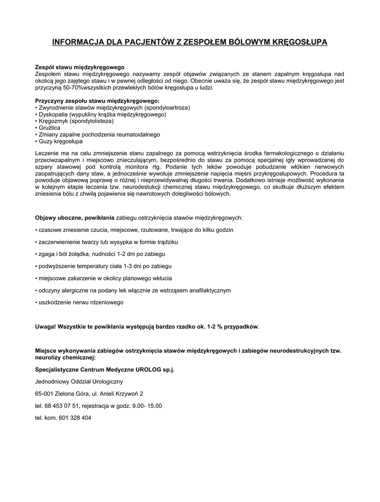 INFORMACJA DLA PACJENTÓW Z ZESPOŁEM BÓLOWYM KRĘGOSŁUPA Zespół stawu międzykręgowego Zespołem stawu międzykręgowego nazywamy zespół objawów związanych ze stanem zapalnym kręgosłupa nad okolicą jego zajętego stawu i w pewnej odległości od niego. Obecnie uważa się, że zespół stawu międzykręgowego jest przyczyną 50-70%wszystkich przewlekłych bólów kręgosłupa u ludzi. Przyczyny zespołu stawu międzykręgowego: • Zwyrodnienie stawów międzykręgowych (spondyloartroza) • Dyskopatia (wypukliny krążka międzykręgowego) • Kręgozmyk (spondylolisteza) • Grużlica • Zmiany zapalne pochodzenia reumatoidalnego • Guzy kręgosłupa Leczenie ma na celu zmniejszenie stanu zapalnego za pomocą wstrzyknięcia środka farmakologicznego o działaniu przeciwzapalnym i miejscowo znieczulającym, bezpośrednio do stawu za pomocą specjalnej igły wprowadzanej do szpary stawowej pod kontrolą monitora rtg. Podanie tych leków powoduje pobudzanie włókien nerwowych zaopatrujących dany staw, a jednocześnie wywołuje zmniejszenie napięcia mięśni przykręgosłupowych. Procedura ta powoduje objawową poprawę o różnej i nieprzewidywalnej długości trwania. Dodatkowo istnieje możliwość wykonania w kolejnym etapie leczenia tzw. neurodestukcji chemicznej stawu międzykręgowego, co skutkuje dłuższym efektem zniesienia bólu z chwilą pojawienia się nawrotowych dolegliwości bólowych. Objawy uboczne, powikłania zabiegu ostrzyknięcia stawów międzykręgowych: • czasowe zniesienie czucia, miejscowe, rzutowane, trwające do kilku godzin • zaczerwienienie twarzy lub wysypka w formie trądziku • zgaga i ból żołądka, nudności 1-2 dni po zabiegu • podwyższenie temperatury ciała 1-3 dni po zabiegu • miejscowe zakarzenie w okolicy planowego wkłucia • odczyny alergiczne na podany lek włącznie ze wstrząsem anafilaktycznym • uszkodzenie nerwu rdzeniowego Uwaga! Wszystkie te powikłania występują bardzo rzadko ok. 1-2 % przypadków. Miejsce wykonywania zabiegów ostrzyknięcia stawów międzykręgowych i zabiegów neurodestrukcyjnych tzw. neurolizy chemicznej: Specjalistyczne Centrum Medyczne UROLOG sp.j. Jednodniowy Oddział Urologiczny 65-001 Zielona Góra, ul. Anieli Krzywoń 2 tel. 68 453 07 51, rejestracja w godz. 9.00- 15.00 tel. kom. 601 328 404