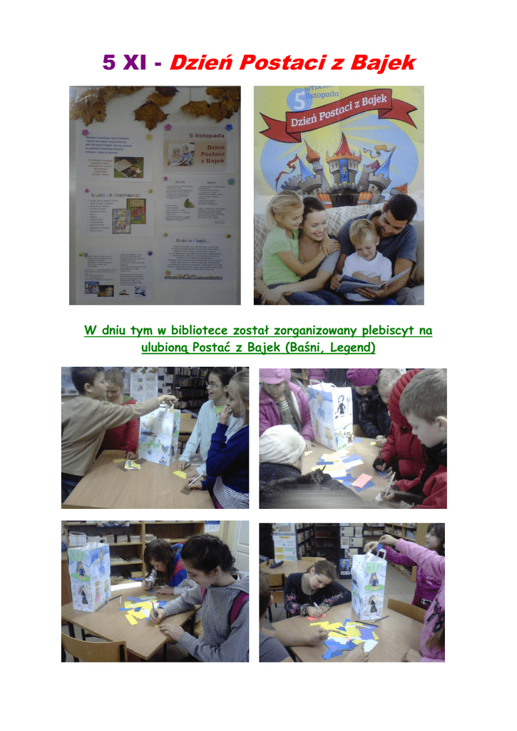 5 XI - Dzień Postaci z Bajek W dniu tym w bibliotece został zorganizowany plebiscyt na ulubioną Postać z Bajek (Baśni, Legend) Każdy mógł przyjść i zagłosować na tę, do której ma największy sentyment. W rankingu brali udział również nauczyciele i inni pracownicy szkoły. Bohaterowie bajek, baśni i legend zaprosili nas do wspólnej zabawy. Rozwiązywaliśmy zagadki, rebusy i łamigłówki. Z wielką uwagą wysłuchaliśmy baśni o przedziwnej historii Wiedźmy Winifredy. W świetny humor wprowadziła nas zabawa „Raz, dwa, trzy, baba Jaga patrzy”. Układaliśmy puzzle z ulubionymi postaciami z bajek. Wykonaliśmy prace plastyczne na temat „Moja ulubiona postać z bajki, baśni, legendy”. Prace ozdobiły urnę na głosy w rankingu. Rozstrzygnięcie plebiscytu nastąpiło 6 listopada. W rankingu na ulubioną Postać z Bajki (Baśni, Legendy) wzięło udział 138 osób. Po dokładnym przeliczeniu głosów udało się ustalić następujące miejsca w II kategoriach: I kategoria: uczniowie I miejsce - Kopciuszek II miejsce - Roszpunka III miejsce - Królik Bugs Na dalszych miejscach rankingu znaleźli się: Czerwony Kapturek, Smok Wawelski, Kot w butach, Dziewczynka z zapałkami, Brzydkie Kaczątko, Mulan, Shrek, Gargamel, Mała Syrenka, Smerfetka, Bolek i Lolek, Królowa Śniegu, Złotowłosa, Śnieżka. II kategoria: nauczyciele i inni pracownicy szkoły I miejsce - Kopciuszek II miejsce - Dziewczynka z zapałkami - Sierotka Marysia Na dalszych miejscach rankingu znaleźli się: Calineczka, Kot w butach, Kubuś Puchatek, Mała Syrenka, Śnieżka, Żwirek i Muchomorek, Shrek, Kajko i Kokosz, Bolek i Lolek, Piotruś z bajki „Zaczarowany ołówek”. Kopciuszek okazał się bezkonkurencyjny. Postać ta jest najbardziej lubiana zarówno przez uczniów jak i nauczycieli naszej szkoły. Nam również bardzo się podoba, więc z chęcią obejrzeliśmy tę baśń.