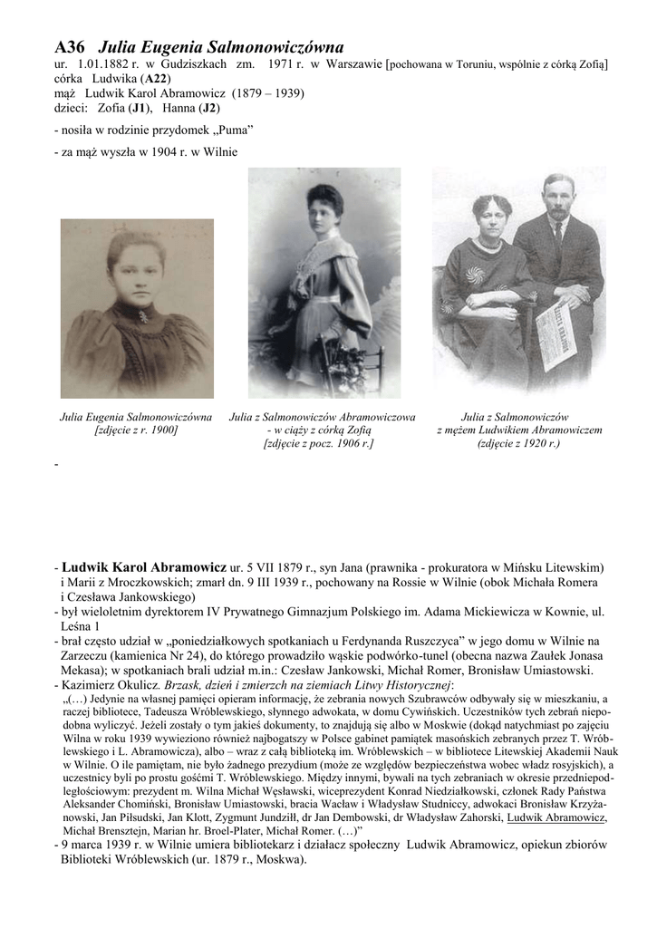 A36 Julia Eugenia Salmonowiczówna ur. 1.01.1882 r. w Gudziszkach zm. 1971 r. w Warszawie [pochowana w Toruniu, wspólnie z córką Zofią] córka Ludwika (A22) mąż Ludwik Karol Abramowicz (1879 – 1939) dzieci: Zofia (J1), Hanna (J2) - nosiła w rodzinie przydomek „Puma” - za mąż wyszła w 1904 r. w Wilnie Julia Eugenia Salmonowiczówna [zdjęcie z r. 1900] Julia z Salmonowiczów Abramowiczowa - w ciąży z córką Zofią [zdjęcie z pocz. 1906 r.] Julia z Salmonowiczów z mężem Ludwikiem Abramowiczem (zdjęcie z 1920 r.) - - Ludwik Karol Abramowicz ur. 5 VII 1879 r., syn Jana (prawnika - prokuratora w Mińsku Litewskim) i Marii z Mroczkowskich; zmarł dn. 9 III 1939 r., pochowany na Rossie w Wilnie (obok Michała Romera i Czesława Jankowskiego) - był wieloletnim dyrektorem IV Prywatnego Gimnazjum Polskiego im. Adama Mickiewicza w Kownie, ul. Leśna 1 - brał często udział w „poniedziałkowych spotkaniach u Ferdynanda Ruszczyca” w jego domu w Wilnie na Zarzeczu (kamienica Nr 24), do którego prowadziło wąskie podwórko-tunel (obecna nazwa Zaułek Jonasa Mekasa); w spotkaniach brali udział m.in.: Czesław Jankowski, Michał Romer, Bronisław Umiastowski. - Kazimierz Okulicz. Brzask, dzień i zmierzch na ziemiach Litwy Historycznej: „(…) Jedynie na własnej pamięci opieram informację, że zebrania nowych Szubrawców odbywały się w mieszkaniu, a raczej bibliotece, Tadeusza Wróblewskiego, słynnego adwokata, w domu Cywińskich. Uczestników tych zebrań niepodobna wyliczyć. Jeżeli zostały o tym jakieś dokumenty, to znajdują się albo w Moskwie (dokąd natychmiast po zajęciu Wilna w roku 1939 wywieziono również najbogatszy w Polsce gabinet pamiątek masońskich zebranych przez T. Wróblewskiego i L. Abramowicza), albo – wraz z całą biblioteką im. Wróblewskich – w bibliotece Litewskiej Akademii Nauk w Wilnie. O ile pamiętam, nie było żadnego prezydium (może ze względów bezpieczeństwa wobec władz rosyjskich), a uczestnicy byli po prostu gośćmi T. Wróblewskiego. Między innymi, bywali na tych zebraniach w okresie przedniepodległościowym: prezydent m. Wilna Michał Węsławski, wiceprezydent Konrad Niedziałkowski, członek Rady Państwa Aleksander Chomiński, Bronisław Umiastowski, bracia Wacław i Władysław Studniccy, adwokaci Bronisław Krzyżanowski, Jan Piłsudski, Jan Klott, Zygmunt Jundziłł, dr Jan Dembowski, dr Władysław Zahorski, Ludwik Abramowicz, Michał Brensztejn, Marian hr. Broel-Plater, Michał Romer. (…)” - 9 marca 1939 r. w Wilnie umiera bibliotekarz i działacz społeczny Ludwik Abramowicz, opiekun zbiorów Biblioteki Wróblewskich (ur. 1879 r., Moskwa). Członkowie redakcji "Kuriera Wileńskiego" (ok. 1930 r.) Siedzą od prawej: Kazimierz Okulicz, red. Ludwik Abramowicz, L. Strusiówna, M. Zdanowicz. Stoją od prawej: Józef Batorowicz, A. Budrys-Budrewicz, J. Jurkiewicz.