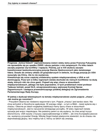Czy żyjemy w czasach chaosu? Prognoza „końca historii” zaprezentowana ćwierć wieku temu przez Francisa Fukuyamę nie sprawdziła się po upadku ZSRR i obozu państw z nim związanych. Po kilku latach zaczęły pojawiać się konflikty i napięcia. Później, już w XXI stuleciu zaczęto kwestionować bezkonkurencyjną pozycję Stanów Zjednoczonych jako światowego lidera. Doszło do zmiany układu sił gospodarczych w świecie, na drugą pozycję po USA wysunęły się Chiny. Ale to nie wystarcza. Kwestionuje się coraz częściej unilateralny system międzynarodowy z USA w roli dominującej. Poza tym w kilku regionach świata dochodzi do różnych konfliktów na dużą skalę, których nikt nie chce gasić. Pojawił się więc chaos w stosunkach międzynarodowych, jakiego nie było poprzednio. O tych problemach mówi profesor Tadeusz Iwiński, poseł SLD, wiceprzewodniczący sejmowej Komisji Spraw Zagranicznych i zastępca przewodniczącego polskiej delegacji do Zgromadzenia Parlamentarnego Rady Europy. W jednej z dyskusji telewizyjnych na tematy międzynarodowe użyłeś pojęcia „chaos”. Jak można go rozumieć? - Prezydent Obama też niedawno wspomniał o tym. Pojęcie „chaosu” jest bardzo stare. Nie chcę wchodzić w filozoficzne spekulacje. W szeregu religii – w tym w Biblii – świat wyłania się z chaosu. Obecnie po latach względnej stabilizacji mamy spory chaos w stosunkach międzynarodowych. Jest to naruszenie istniejącego porządku. W wielu regionach świata sytuacja jest wręcz niepokojąca. Nie jesteśmy pewni co się wydarzy, bo trwa wciąż kryzys ekonomiczny. USA wyszły z kryzysu zapoczątkowanego w 2008 r., ale Unia Europejska jeszcze nie, wystarczy przywołać Grecję. Mikołaj Gogol kiedyś plastycznie stwierdził, że do chaosu nie doprowadzają głupcy, lecz mędrcy lub ci, którzy za takich się uważają. 1/9 Czy żyjemy w czasach chaosu? Czy chaos jest konsekwencją „wycofania się” USA z interwencji w każdym regionie świata? - Niekoniecznie. Stany Zjednoczone tylko częściowo wycofały się z dotychczasowej roli „żandarma” światowego. USA generalnie już nie chcą się angażować w kolejne wojny, ale do niektórych operacji wydają się swoiście przymuszone. Tak naprawdę dopiero teraz wyciągnęły wnioski z klęski w Wietnamie, które sprowadzają się do formuły, że „piechota morska może zdobyć fabryki, ale nie będzie w nich pracować”. Już później nałożył się na to efekt porażek źle zaprogramowanych lub przeprowadzonych akcji, czy dyskusyjnych działań politycznych w różnych krajach. Bowiem 7,5 miliardowy świat, z ponad 200 państwami, niezwykle się skomplikował. Typowym przykładem może być Libia, kraj niedemokratyczny, który miał kiedyś dość oryginalne koncepcje teoretyczne tzw. dżamahiriyi, zapisane w „Zielonej Książeczce”. Akcje zbrojne w tym kraju zainicjowali Anglicy i Francuzi, wsparli ich Amerykanie i całe NATO. Wcześniej Muammar Kaddafi trzymał wszystkich, także siły islamistyczne, „za twarz”. Libia paradoksalnie zapewniała stabilność w otaczającym regionie. Po jego obaleniu w końcu 2011 r. dotychczasowe struktury się rozpadły. Doszło do powstania niebezpiecznych ruchów dżihadystowskich, również w Mali, w Afryce Centralnej., aż po północną Nigerię, gdzie rosną wpływy ekstremistycznego ugrupowania Boko Haram. Sama Libia stała się państwem upadłym. Tam zabito ambasadora USA. Obecnie w tym sześciokrotnie większym od Polski państwie funkcjonują dwa rywalizujące ze sobą rządy i parlamenty (w Trypolisie i Bengazi), a ostatnio lotnictwo blisko 90-milionowego Egiptu bombardowało pozycje islamistów, po ścięciu głów 21 obywatelom egipskim (chrześcijańskim Koptom) pracującym w tym kraju. Rząd Włoch od dłuższego czasu uważa, iż bez międzynarodowej akcji w Libii (najlepiej w postaci misji pod auspicjami ONZ) chaos pogłębi się. Wpływa to w wielkiej mierze na destabilizację sytuacji na południu Europy, a chodzi zwłaszcza o lawinowo rosnącą liczbę nielegalnych emigrantów, co wiąże się z jednej strony z dramatami humanitarnymi (masowy przemyt Afrykanów organizują grupy przestępcze) a z drugiej, z kwestią bezpieczeństwa, gdyż wśród migrantów i uchodźców mogą być zdeklarowani islamiści, gotowi do aktów terrorystycznych na naszym kontynencie. A jak na tym tle wygląda cały świat arabski, czy nawet szerzej, świat islamu? - W Afryce Północnej i na Bliskim Wschodzie doszło przed kilku laty do tzw. wiosny arabskiej, zapoczątkowanej w Tunezji, gdzie obalono rząd Ben Alego (przez kilka lat był on zresztą ambasadorem w Warszawie). W samej Tunezji miały miejsce pozytywne zmiany, odbyły się demokratyczne wybory itd. Jakiś czas temu miałem, z ramienia Rady Europy, kontakty z władzami, w tym z królami Jordanii i Maroka, którzy także, mimo licznych wyzwań wewnętrznych, doprowadzili do pozytywnych przemian w swoich krajach. Przeprowadzono referenda, zmieniono konstytucje, znacznie wzrosła rola parlamentów. Maroko mieści się dziś w grupie państw spełniających standardy demokratyczne. Blisko przy tym współpracuje właśnie z Radą Europy. Ale na tym koniec. Niemal nic nie zmieniło się w krajach Zatoki Perskiej (Arabskiej), zwłaszcza Arabii Saudyjskiej i innych państwach regionu (Bahrajnie, Kuwejcie, Katarze). W Algierii i Egipcie rządzą siły wojskowe. W Arabii Saudyjskiej kobieta nadal nie może 2/9 Czy żyjemy w czasach chaosu? prowadzić samochodu i nie sądzę, aby nowy monarcha, który dopiero co objął władzę, zmienił tę sytuację. Tam wiosna arabska okazała się niewypałem, a w niektórych przypadkach chaos nawet się wzmógł. Tak jest choćby w Jemenie, gdzie od września ubiegłego roku dominuje milicja szyicka, wspierana de facto przez Iran. Pomijam w tym miejscu historyczno-religijną konfrontację sunnicko-szyicką, obiektywnie sprzyjającą destabilizacji sytuacji. Jedn