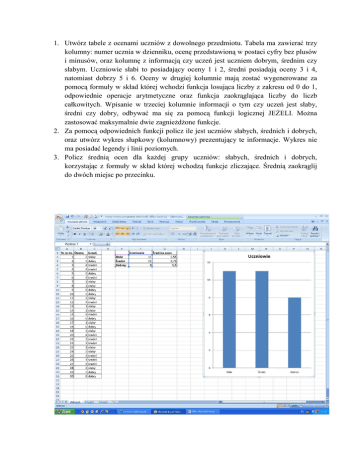1. Utwórz tabele z ocenami uczniów z dowolnego przedmiotu. Tabela ma zawierać trzy kolumny: numer ucznia w dzienniku, ocenę przedstawioną w postaci cyfry bez plusów i minusów, oraz kolumnę z informacją czy uczeń jest uczniem dobrym, średnim czy słabym. Uczniowie słabi to posiadający oceny 1 i 2, średni posiadają oceny 3 i 4, natomiast dobrzy 5 i 6. Oceny w drugiej kolumnie mają zostać wygenerowane za pomocą formuły w skład której wchodzi funkcja losująca liczby z zakresu od 0 do 1, odpowiednie operacje arytmetyczne oraz funkcja zaokrąglająca liczby do liczb całkowitych. Wpisanie w trzeciej kolumnie informacji o tym czy uczeń jest słaby, średni czy dobry, odbywać ma się za pomocą funkcji logicznej JEŻELI. Można zastosować maksymalnie dwie zagnieżdżone funkcje. 2. Za pomocą odpowiednich funkcji policz ile jest uczniów słabych, średnich i dobrych, oraz utwórz wykres słupkowy (kolumnowy) prezentujący te informacje. Wykres nie ma posiadać legendy i linii poziomych. 3. Policz średnią ocen dla każdej grupy uczniów: słabych, średnich i dobrych, korzystając z formuły w skład której wchodzą funkcje zliczające. Średnią zaokrąglij do dwóch miejsc po przecinku.