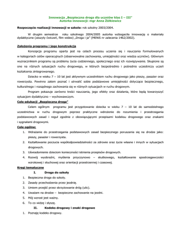 Innowacja „Bezpieczna droga dla uczniów klas I – III” Autorka innowacji: mgr Anna Żółkiewicz Rozpoczęcie realizacji innowacji w szkole: rok szkolny 2003/2004. W drugim semestrze roku szkolnego 2004/2005 autorka wzbogaciła innowację o materiały dydaktyczne (zeszyty ćwiczeń, film wideo) „Droga i ja” (MENiS nr zalecenia 1462/2002). Założenia programu i jego konstrukcja Koncepcja programu oparta jest na celach procesu uczenia się i nauczania formułowanych w kategoriach celów operacyjnych (obserwowalne zachowania, umiejętności oraz wiedza uczniów). Głównym wyznacznikiem programu są problemy życia codziennego, społecznego oraz ich rozwiązywanie. Skupione są one na różnych sytuacjach ruchu drogowego, w których bezpośrednio i pośrednio uczestniczy uczeń kształcenia zintegrowanego. Dziecko w wieku 7 – 10 lat jest aktywnym uczestnikiem ruchu drogowego jako pieszy, pasażer oraz rowerzysta. Powinno zatem poznać i utrwalić sobie podstawowe umiejętności dotyczące bezpiecznego, kulturalnego i rozsądnego zachowania się w różnych sytuacjach w ruchu drogowym. Program pokazuje zarówno treści nauczania, jego efekty oraz działania, które będą towarzyszyć sytuacjom dydaktyczno – wychowawczym. Cele edukacji „Bezpieczna droga” Celem ogólnym programu jest przygotowanie dziecka w wieku 7 – 10 lat do samodzielnego uczestnictwa w ruchu drogowym poprzez praktyczne wdrożenie do rozumienia i przestrzegania podstawowych zasad i reguł zgodnie z obowiązującymi przepisami kodeksu drogowego oraz znakami i sygnałami drogowymi. Cele ogólne: 1. Wdrażanie do przestrzegania podstawowych zasad bezpiecznego poruszania się na drodze jako: pieszy, pasażer i rowerzysta. 2. Kształtowanie poczucia współodpowiedzialności za zdrowie oraz życie własne i innych w sytuacjach drogowych. 3. Uświadomienie dzieciom konieczności istnienia przepisów drogowych. 4. Rozwój wyobraźni, myślenia przyczynowo – skutkowego, wzrokowej i słuchowej oraz orientacji przestrzennej i czasowej. Kręgi tematyczne I. Droga do szkoły 1. Bezpieczna droga do szkoły. 2. Zasady przechodzenia przez jezdnię. 3. Umiem przejść przez skrzyżowanie dróg (ulic). 4. Uważam na drodze – bezpieczne zachowanie na jezdni. 5. Mój wzrost jest ważny. 6. To co widzę i słyszę. II. Kodeks drogowy i znaki drogowe 1. Poznaję kodeks drogowy. kształtowanie spostrzegawczości 2 2. Znam znaki drogowe występujące w drodze do szkoły. 3. Znam znaki i sygnały drogowe obowiązujące pieszych i rowerzystów. III. Sposoby przemieszczania się 1. Poruszam się pieszo. 2. Jeżdżę na rowerze. 3. Wiem jak działa mój rower. 4. Jeżdżę na rolkach. 5. Wsiadam do samochodu. 6. Jeżdżę samochodem. 7. Korzystam z komunikacji miejskiej. 8. Umiem odróżniać pojazdy uprzywilejowane. 9. poznaję kierujących ruchem drogowym. IV. Otoczenie, w którym przebywam 1. Poruszam się po mieście 2. poruszam się na wsi.. 3. Poruszam się w nocy. 4. Poruszam się podczas złej pogody. V. Niebezpieczeństwa 1. Uczę się przewidywać niebezpieczeństwo. 2. Wiem, jak się zachować w razie wypadku. Formy edukacji Do podstawowych form edukacji uczniów przygotowujących ich do bezpiecznego i kulturalnego uczestnictwa w ruchu drogowym można zaliczyć: zabawy, gry, wycieczki, spacery, spotkania, zajęcia zintegrowane. Metody edukacji Podstawowymi metodami w realizacji programu „Bezpieczna droga” są te, które w czynny i świadomy sposób aktywizują uczniów do faktycznego i umiejętnego przestrzegania przepisów, a więc przyczyniają się do kształtowania u nich postaw bezpiecznego i kulturalnego zachowania się jako pieszy, pasażer i rowerzysta. Najistotniejsze wydają się tutaj elementy sprawnościowe oraz umiejętność przewidywania skutków określonych decyzji. Można tutaj określić między innymi takie metody wychowania, nauczania i uczenia się: a) metodę osobistego przykładu nauczyciela i innych dorosłych; b) metody obserwacji i pokazu; c) metody objaśnienia i instrukcji; d) metodę inscenizacji „drama”; e) metodę pracy z tekstem literackim; f) metodę ćwiczeń praktycznych.