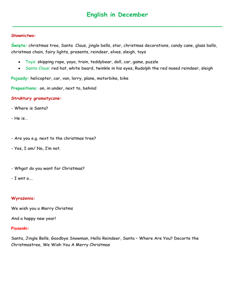 English in December _____________________________________________________ Słownictwo: Święta: christmas tree, Santa Claus, jingle bells, star, christmas decorations, candy cane, glass balls, christmas chain, fairy lights, presents, reindeer, elves, sleigh, toys Toys: skipping rope, yoyo, train, teddybear, doll, car, game, puzzle Santa Claus: red hat, white beard, twinkle in his eyes, Rudolph the red nosed reindeer, sleigh Pojazdy: helicopter, car, van, lorry, plane, motorbike, bike Prepositions: on, in under, next to, behind Struktury gramatyczne: - Where is Santa? - He is… - Are you e.g. next to the christmas tree? - Yes, I am/ No, I’m not. - Whgat do you want for Christmas? - I wnt a…. Wyrażenia: We wish you a Merry Christms And a happy new year! Piosenki: Santa, Jingle Bells, Goodbye Snowman, Hello Reindeer, Santa – Where Are You? Decorte the Christmastree, We Wish You A Merry Christmas