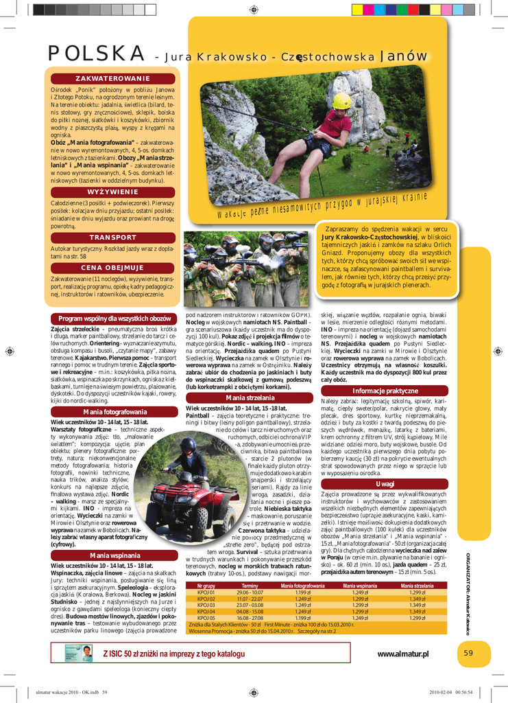 POLSKA - Jura Krakowsko - Częstochowska Janów Z A K WAT E R O WA N I E Ośrodek „Ponik” położony w pobliżu Janowa i Złotego Potoku, na ogrodzonym terenie leśnym. Na terenie obiektu: jadalnia, świetlica (bilard, tenis stołowy, gry zręcznościowe), sklepik, boiska do piłki nożnej, siatkówki i koszykówki, zbiornik wodny z piaszczystą plażą, wyspy z kręgami na ogniska. Obóz „Mania fotografowania” – zakwaterowanie w nowo wyremontowanych, 4, 5-os. domkach letniskowych z łazienkami. Obozy „Mania strzelania” i „Mania wspinania” - zakwaterowanie w nowo wyremontowanych, 4, 5-os. domkach letniskowych (łazienki w oddzielnym budynku). WYŻYWIENIE Całodzienne (3 posiłki + podwieczorek). Pierwszy posiłek: kolacja w dniu przyjazdu; ostatni posiłek: śniadanie w dniu wyjazdu oraz prowiant na drogę powrotną. jurajskiej krainie w d ó g y z r p h c y t esamowi Wa k a c j e p e ł n e n i Zapraszamy do spędzenia wakacji w sercu Jury Krakowsko-Częstochowskiej, w bliskości tajemniczych jaskiń i zamków na szlaku Orlich Gniazd. Proponujemy obozy dla wszystkich tych, którzy chcą spróbować swoich sił we wspinaczce, są zafascynowani paintballem i survivalem, jak również tych, którzy chcą przeżyć przygodę z fotografią w jurajskich plenerach. TRANSPORT Autokar turystyczny. Rozkład jazdy wraz z dopłatami na str. 58 CENA OBEJMUJE Zakwaterowanie (11 noclegów), wyżywienie, transport, realizację programu, opiekę kadry pedagogicznej, instruktorów i ratowników, ubezpieczenie. Program wspólny dla wszystkich obozów Zajęcia strzeleckie – pneumatyczna broń krótka i długa, marker paintballowy, strzelanie do tarcz i celów ruchomych. Orientering – wyznaczanie azymutu, obsługa kompasu i busoli, „czytanie mapy”, zabawy terenowe. Kajakarstwo. Pierwsza pomoc – transport rannego i pomoc w trudnym terenie. Zajęcia sportowe i rekreacyjne – m.in.: koszykówka, piłka nożna, siatkówka, wspinaczka po skrzynkach, ogniska z kiełbaskami, turnieje na świeżym powietrzu, plażowanie, dyskoteki. Do dyspozycji uczestników kajaki, rowery, kijki do nordic-walking. Mania fotografowania Wiek uczestników 10 - 14 lat, 15 - 18 lat. Warsztaty fotograficzne – techniczne niczne aspekty wykonywania zdjęć: tło, „malowanie malowanie światłem”; kompozycja: ujęcie, plan obiektu; plenery fotograficzne: portrety, natura; niekonwencjonalne ne metody fotografowania; historiaa fotografii, nowinki techniczne, nauka trików, analiza stylów; konkurs na najlepsze zdjęcie, finałowa wystawa zdjęć. Nordic – walking - marsz ze specjalnymi kijkami. INO - impreza na orientację. Wycieczki na zamki w Mirowie i Olsztynie oraz rowerowa wa wyprawa na zamek w Bobolicach. Należy zabrać własny aparat fotografi aficzny (cyfrowy). Wiek uczestników 10 - 14 lat, 15 - 18 lat. Wspinaczka, zajęcia linowe – zajęcia na skałkach Jury: techniki wspinania, posługiwanie się liną i sprzętem asekuracyjnym. Speleologia – eksploracja jaskiń (Koralowa, Berkowa). Nocleg w jaskini Studnisko – jednej z najsłynniejszych na Jurze i ognisko z gawędami speleologa (konieczny ciepły dres). Budowa mostów linowych, zjazdów i pokonywanie tras – testowanie wybudowanego przez uczestników parku linowego (zajęcia prowadzone Mania strzelania Wiek uczestników 10 - 14 lat, 15 -18 lat. Paintball – zajęcia teoretyczne i praktyczne: treningi i bitwy (leśny poligon paintballowy), strzelanie do celów i tarcz ta nieruchomych oraz ruchomych, ruchomych odbicie i ochrona VIP -a, zdobywanie umocnień przezdob ciwnika, bitwa paintballowa ciwni - starcie 2 plutonów (w st finale n każdy pluton otrzymuje m dodatkowo karabin snajperski i strzelający sn seriami). Rajdy za linie s wroga, zasadzki, dziaw łania nocne i piesze pała trole. tro Niebieska taktyka – maskowanie, poruszanie m się i przetrwanie w wodzie. Czerwona taktyka – udzielaCzerw nie pomocy pomo przedmedycznej w „strefie zero”, zero będącej pod ostrzałem wroga. wroga Survival Surviva – sztuka przetrwania w trudnych warunkach i pokonywanie przeszkód terenowych, nocleg w morskich tratwach ratunkowych (tratwy 10-os.), podstawy nawigacji mor- Informacje praktyczne Należy zabrać: legitymację szkolną, śpiwór, karimatę, ciepły sweter/polar, nakrycie głowy, mały plecak, dres sportowy, kurtkę nieprzemakalną, odzież i buty za kostki z twardą podeszwą do pieszych wędrówek, menażkę, latarkę z bateriami, krem ochronny z filtrem UV, strój kąpielowy. Mile widziane: odzież moro, buty wojskowe, busole. Od każdego uczestnika pierwszego dnia pobytu pobierzemy kaucję (30 zł) na pokrycie ewentualnych strat spowodowanych przez niego w sprzęcie lub w wyposażeniu ośrodka. Uwagi Zajęcia prowadzone są przez wykwalifikowanych instruktorów i wychowawców z zastosowaniem wszelkich niezbędnych elementów zapewniających bezpieczeństwo (uprzęże asekuracyjne, kaski, kamizelki). Istnieje możliwość dokupienia dodatkowych zajęć paintballowych (100 kulek) dla uczestników obozów „Mania strzelania” i „Mania wspinania” 15 zł, „Mania fotografowania” - 50 zł (organizacja całej gry). Dla chętnych całodzienna wycieczka nad zalew w Poraju (w cenie m.in. pływanie na bananie i ognisko) – ok. 60 zł (min. 10 os.), jazda quadem – 25 zł, przejażdżka autem terenowym – 15 zł (min. 5 os.). Nr grupy Terminy Mania fotografowania Mania wspinania KPOJ 01 29.06 - 10.07 1.199 zł 1.249 zł KPOJ 02 11.07 - 22.07 1.249 zł 1.299 zł KPOJ 03 23.07 - 03.08 1.249 zł 1.299 zł KPOJ 04 04.08 - 15.08 1.249 zł 1.299 zł KPOJ 05 16.08 - 27.08 1.199 zł 1.249 zł Zniżka dla Stałych Klientów - 50 zł First Minute - zniżka 100 zł do 15.03.2010 r. Wiosenna Promocja - zniżka 50 zł do 15.04.2010 r. Szczegóły na str.2 Z ISIC 50 zł zniżki na imprezy z tego katalogu almatur wakacje 2010 - OK.indb 59 skiej, wiązanie węzłów, rozpalanie ognia, biwaki w lesie, mierzenie odległości różnymi metod