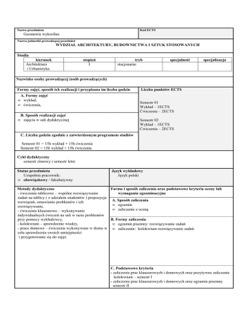 Nazwa przedmiotu Kod ECTS Geometria wykreślna Nazwa jednostki prowadzącej przedmiot WYDZIAŁ ARCHITEKTURY, BUDOWNICTWA I SZTUK STOSOWANYCH Studia kierunek Architektura i Urbanistyka stopień I tryb stacjonarne specjalność specjalizacja Nazwisko osoby prowadzącej (osób prowadzących) Formy zajęć, sposób ich realizacji i przypisana im liczba godzin A. Formy zajęć • wykład, • ćwiczenia, Liczba punktów ECTS Semestr 01 Wykład – 1ECTS Ćwiczenia – 2ECTS B. Sposób realizacji zajęć • zajęcia w sali dydaktycznej Semestr 02 Wykład – 1ECTS Ćwiczenia – 2ECTS C. Liczba godzin zgodnie z zatwierdzonym programem studiów Semestr 01 = 15h wykład + 15h ćwiczenia Semestr 02 = 15h wykład + 15h ćwiczenia Cykl dydaktyczny semestr zimowy i semestr letni Status przedmiotu Uzupełnia pracownik: • obowiązkowy / fakultatywny Język wykładowy Język polski Metody dydaktyczne Forma i sposób zaliczenia oraz podstawowe kryteria oceny lub - ćwiczenia tablicowe – wspólne rozwiązywanie wymagania egzaminacyjne zadań na tablicy ( z udziałem studentów ) propozycja A. Sposób zaliczenia rozwiązań, omawianie problemów i ich • egzamin rozwiązywanie, • zaliczenie z oceną - ćwiczenia klauzurowe – wykonywanie indywidualnych ćwiczeń na sali w razie problemów B. Formy zaliczenia: przy pomocy wykładowcy, - kolokwium – sprawdzenie wiedzy, • egzamin pisemny: rozwiązywanie zadań - prace domowe – ćwiczenia wykonywane w domu w • zaliczenie: kolokwium rozwiązywanie zadań celu sprawdzenia swoich umiejętności i przygotowanie się do zajęć. C. Podstawowe kryteria - zaliczenie prac klauzurowych i domowych oraz pozytywne zaliczenie kolokwium – semestr I - zaliczenie prac klauzurowych i domowych oraz egzamin pisemny semestr II Określenie przedmiotów wprowadzających wraz z wymogami wstępnymi Podstawowe wiadomości z zakresu geometrii euklidesowej, umiejętność sporządzania szkicu odręcznego. Cele przedmiotu Celem przedmiotu jest kształcenie u studentów umiejętności odwzorowywania brył przestrzennych na płaszczyźnie rysunku, przygotowanie geometrycznych podstaw świadomego kształtowania obiektu budowlanego, praktycznego korzystania z odwzorowań powierzchni terenu, nauczanie praktycznych, wykreślnych metod wizualizacji obiektów budowlanych, rozwijanie wyobraźni przestrzennej. Treści programowe wykłady - Niezmienniki rzutu równoległego. Rzut równoległy – aksonometria. - Metoda Monge’a – odwzorowanie i restytucja. Odwzorowanie podstawowych elementów. - Odwzorowanie wielokątów. Rzutnia boczna. - Przynależność elementów. Rzut równoległy. - Elementy wspólne. - Przynależność elementów. - Rzut równoległy ukośny (cienie). - Elementy prostopadłe. Obroty. - Transformacja układu rzutni. - Wielościany. Rozwinięcia wielościanów. - Dachy. Kład połaci dachowych. - Rzuty okręgu i sfery. - Powierzchnie stopnia drugiego. Rozwinięcia. Powierzchnia stożkowa. - Powierzchnie stopnia drugiego. Rozwinięcia. Powierzchnia walcowa. - Rzut cechowany. Odwzorowanie powierzchni terenu. ćwiczenia - Niezmienniki rzutu równoległego. Rzut równoległy – aksonometria. - Metoda Monge’a – odwzorowanie i restytucja. Odwzorowanie podstawowych elementów. - Odwzorowanie wielokątów. Rzutnia boczna. - Przynależność elementów. Rzut równoległy. - Elementy wspólne. - Przynależność elementów. - Rzut równoległy ukośny (cienie). - Elementy prostopadłe. Obroty. - Transformacja układu rzutni. - Wielościany. Rozwinięcia wielościanów. - Dachy. Kład połaci dachowych. - Rzuty okręgu i sfery. - Powierzchnie stopnia drugiego. Rozwinięcia. Powierzchnia stożkowa. - Powierzchnie stopnia drugiego. Rozwinięcia. Powierzchnia walcowa. - Rzut cechowany. Odwzorowanie powierzchni terenu. Wykaz literatury A. Literatura wymagana do ostatecznego zaliczenia zajęć (zdania egzaminu): BŁACH Anna : „Inżynierska geometria wykreślna podstawy i zastosowania”. Wyd. Pol. Śl. Gliwice BŁACH Anna, PAWLAK Anita: „Inżynierska geometria wykreślna – zbiór zadań”. Wyd. Pol. Śl. Gliwice BŁACH Anna, DUDZIK Piotr : „Wybrane definicje i konstrukcje geometryczne. Planimetria i stereometria.”. Wyd. Pol. Śl. Gliwice BOGACZYK Tomasz, ROMASZKIEWICZ – BIAŁAS Teresa : „13 wykładów z geometrii wykreślnej”, Oficyna Wydawnicza Pol. Wrocławskiej”. Oficyna Wydawnicza Pol. Wrocławskiej, Wrocław 2006 GROCHOWSKI Bogusław : „Geometria wykreślna z perspektywą stosowaną”. PWN Warszawa 1995 B. Literatura uzupełniająca JANKOWSKI Wiktor: „Geometria wykreślna”. PWN Warszawa 1971 OTTO Franciszek i Edward: „Podręcznik geometrii wykreślnej”. PWN Warszawa 1994 KANIA Andrzej: „Geometria wykreślna z grafiką inżynierską. Część II – Rzuty Monge’a”. Wyd. Pol. Śl. Gliwice PRZEWŁOCKI Stefan: „Geometria wykreślna w budownictwie”. Arkady 1997 WOJCIECHOWSKI Lech: „Rysunek budowlany” (seria dokumentacja budowlana – db 1)”. WSiP SA 1999 Efekty uczenia się - zna metody potrzebne do pracy z zawodzie inżyniera, - umie korzystać ze zdobytej wiedzy i stosować ją w praktyce, - zna zależności pomiędzy poszczególnymi naukami i potrafi swobodnie je łączyć, - ma świadomość swoich kompetencji oraz stale je podnosi Wiedza 1. Zna metody odwzorowań graficznych elementów przestrzennych stosowanych w praktyce inżynierskiej. 2. Zna związki i zależności wynikające z wzajemnych położeń elementów przestrzennych. 3. Ma uporządkowaną wiedzę w zakresie podstaw logiki, algebry liniowej i geometrii analitycznej, rachunku różniczkowego, całkowego i prawdopodobieństwa oraz ich zastosowań. Umiejętności 1. Umie odczytać rysunki architektoniczne, budowlane i geodezyjne oraz potrafi sporządzić dokumentację graficzną w środowisku wybranych programów CAD. 2. Potrafi przeprowadzić analizę geometryczną obiektów budowlanych na podstawie dokumentacji rysunkowej. 3. Potrafi rozwiązywać zada