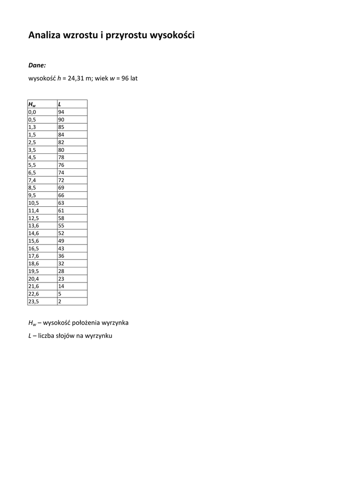 Analiza wzrostu i przyrostu wysokości Dane: wysokość h = 24,31 m; wiek w = 96 lat Hw L 0,0 0,5 1,3 1,5 2,5 3,5 4,5 5,5 6,5 7,4 8,5 9,5 10,5 11,4 12,5 13,6 14,6 15,6 16,5 17,6 18,6 19,5 20,4 21,6 22,6 23,5 94 90 85 84 82 80 78 76 74 72 69 66 63 61 58 55 52 49 43 36 32 28 23 14 5 2 Hw – wysokość położenia wyrzynka L – liczba słojów na wyrzynku Aby móc przeprowadzić analizę wzrostu i przyrostu wysokości musimy wyznaczyć wysokość drzewa w poszczególnych latach życia. Pierwszym krokiem jest określenie wieku „dorośnięcia” (Wd) do wysokości pobrania wyrzynków: Wd = w − L Hw L Wd 0,0 0,5 1,3 1,5 2,5 3,5 4,5 5,5 6,5 7,4 8,5 9,5 10,5 11,4 12,5 13,6 14,6 15,6 16,5 17,6 18,6 19,5 20,4 21,6 22,6 23,5 94 90 85 84 82 80 78 76 74 72 69 66 63 61 58 55 52 49 43 36 32 28 23 14 5 2 2 6 11 12 14 16 18 20 22 24 27 30 33 35 38 41 44 47 53 60 64 68 73 82 91 94 Ustalenie wysokości drzewa (h) w konkretnych latach jego życia (Rz) dokonujemy interpolując wysokość na podstawie danych z wyrzynków mających liczbę słojów większą i mniejszą od szukanego Rz. Należy też pamiętać o „potrąceniu” połowy rocznego przyrostu wysokości, co związane jest z potrzebą wyeliminowania błędu wynikającego z różnych usytuowania przekroju. Wysokość w wieku 73 lat interpolujemy na podstawie wyrzynków o Wd= 68 i 73 lata. Do wysokości wyrzynka o Wd= 68 lat musimy dodać 3 pełne przyrosty roczne (71-68=3) oraz odjąć połówkę tego przyrostu. różnica wieku: 73-68 = 5 lat różnica wysokości: 20,4-19,5 = 0,9 m średni przyrost roczny w okresie od 68-do 73 roku życia: 0,9/5 = 0,18 m/rok Zatem wysokość w Rz=71 będzie się równać: h71=19,5+3*0,18-0,5*0,18=19,5+0,54-0,09=19,95 m Ilustracją zmiany wysokości drzewa w ciągu jego życia jest krzywa wzrostu wysokości (rys. 1). 25 wysokość [m] 20 15 10 5 0 0 10 20 30 40 50 60 70 80 90 100 wiek Rys. 1. Krzywa wzrostu wysokości Przyrost przeciętny wysokości (zhp) drzewa w wybranych latach jego życia określamy ze wzoru: zhp = h Rz Przyrost przeciętny wysokości w wieku 71 lat to iloraz wysokości drzewa w tym wieku oraz wieku drzewa zhp71 = h 19,95 = = 0,28 Rz 71 Rz h zhp 96 91 86 81 76 71 66 61 56 51 46 41 36 31 26 21 16 11 6 24,31 22,54 21,99 21,37 20,72 19,95 18,93 17,73 16,90 16,13 15,10 13,42 11,58 9,66 7,96 6,25 3,25 1,26 0,43 0,25 0,25 0,26 0,26 0,27 0,28 0,29 0,29 0,30 0,32 0,33 0,33 0,32 0,31 0,31 0,30 0,20 0,11 0,07 Bieżący okresowy przyrost wysokości (zhbo) oraz bieżący przyrost roczny w tym okresie (zhbr) wyznaczamy znając długość okresu oraz wysokość drzewa na początku i końcu tego okresu. Najczęściej badamy okresy 5- lub 10-letnie. Bieżący okresowy przyrost wysokości drzewa w poszczególnych okresach jego życia określamy ze wzoru: zhbo = hkoniecokresu − h począoczątresu a bieżący przyrost roczny w tym okresie (zhbr) ze wzoru: zhbr = zhbo n Należy pamiętać o pierwszym okresie, który może mieć różną długość w sytuacji, gdy okresy życia drzewa „odkładamy” od końca. Między 66. a 71. rokiem życia analizowane drzewo zmieniło swoją wysokość z 18,93 m na 19,95 m, czyli zhbo w tym okresie wynosi zhbo = 19,95-18,93 = 1,02 m. Z kolei średnio rocznie (zhbr) przyrastało ono: 1,02/5 = 0,20 m/rok okres zhbo zhbr 92-96 87-91 82-86 77-81 72-76 67-71 62-66 57-61 52-56 47-51 42-46 37-41 32-36 27-31 22-26 17-21 12-16 7-11 1-6 !!! 1,77 0,55 0,62 0,65 0,78 1,02 1,20 0,83 0,77 1,03 1,68 1,84 1,92 1,70 1,71 3,00 1,99 0,83 0,43 0,35 0,11 0,12 0,13 0,16 0,20 0,24 0,17 0,15 0,21 0,34 0,37 0,38 0,34 0,34 0,60 0,40 0,17 0,07 Wzajemne relacje między przyrostem przeciętnym (zhp) i przyrostem bieżącym (zhbr) pozwalają na wyznaczenie we wzroście drzewa fazy juwenilnej (wzrostu młodocianego), fazy pędzenia (wzmożonego wzrostu) i fazy senilnej (wzrostu starczego) (ryc. 2). Faza juwenilna trwa od początku życia drzewa do momentu aż zhbr osiągnie wartość odpowiadającą kulminacji zhp. Faza pędzenia kończy się w momencie kulminacji zhp i zrównania wartości przyrostu przeciętnego z wartością przyrostu bieżącego. W tej fazie następuje kulminacja zhbr. Faza senilna trwa do końca życia drzewa. FAZA JUWENILNA 0 ,7 0 0 ,6 0 0 ,5 0 Zh [m] 0 ,4 0 0 ,3 0 0 ,2 0 0 ,1 0 FAZA PĘDZENIA FAZA SENILNA 0 ,0 0 0 10 20 30 40 50 60 70 80 90 100 w ie k Zhbr Zhp Rys. 2. Zmiana z wiekiem przeciętnego (zhp) i bieżącego rocznego (zhbr) przyrostu wysokości Analizowane drzewo kulminację przyrostu bieżącego wysokości (zhbr) miało w 19. roku swojego życia. Najwyższą wartość przyrostu przeciętnego (zhp) osiągnęło w 45. roku życia. Faza juwenilna trwała 13 lat, faza pędzenia 32 lata, a faza senilna – 42 lata.