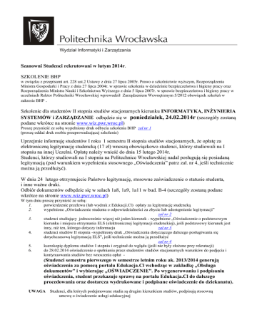 Szanowni Studenci rekrutowani w lutym 2014r. SZKOLENIE BHP w związku z przepisami art. 228 ust.2 Ustawy z dnia 27 lipca 2005r. Prawo o szkolnictwie wyższym, Rozporządzenia Ministra Gospodarki i Pracy z dnia 27 lipca 2004r. w sprawie szkolenia w dziedzinie bezpieczeństwa i higieny pracy oraz Rozporządzenia Ministra Nauki i Szkolnictwa Wyższego z dnia 5 lipca 2007r. w sprawie bezpieczeństwa i higieny pracy w uczelniach Rektor Politechniki Wrocławskiej wprowadził Zarządzeniem Wewnętrznym 5/2012 obowiązek szkoleń w zakresie BHP . Szkolenie dla studentów II stopnia studiów stacjonarnych kierunku INFORMATYKA, INŻYNIERIA SYSTEMÓW i ZARZĄDZANIE odbędzie się w poniedziałek, 24.02.2014r (szczegóły zostaną podane wkrótce na stronie www.wiz.pwr,wroc.pl) Proszę przynieść ze sobą wypełniony druk odbycia szkolenia BHP zał nr 1 (proszę oddać druk osobie przeprowadzającej szkolenie) Uprzejmie informuję studentów I roku 1 semestru II stopnia studiów stacjonarnych, że opłatę za elektroniczną legitymację studencką (17 zł) wnoszą obowiązkowo studenci, którzy studiowali na I stopniu na innej Uczelni. Opłatę należy wnieść do dnia 15 lutego 2014r. Studenci, którzy studiowali na I stopniu na Politechnice Wrocławskiej nadal posługują się posiadaną legitymacją (pod warunkiem wypełnienia stosownego „Oświadczenia” patrz zał. nr 4, jeśli technicznie można ją przedłużyć). W dniu 24 lutego otrzymujecie Państwo legitymację, stosowne zaświadczenie o statusie studenta, i inne ważne druki. Odbiór dokumentów odbędzie się w salach 1a8, 1a9, 1a11 w bud. B-4 (szczegóły zostaną podane wkrótce na stronie www.wiz.pwr,wroc.pl) W tym dniu proszę przynieść ze sobą: 1. potwierdzenie przelewu (lub wydruk z Edukacji.Cl) opłaty za legitymację studencką 2. wypełnione „Oświadczenie studenta o odpowiedzialności za zbycie lub udostępnienie legitymacji” zał nr 2 3. studenci studiujący jednocześnie więcej niż jeden kierunek - wypełnione „Oświadczenie o podstawowym kierunku i miejscu otrzymania ELS (elektronicznej legitymacji studenckiej), jeśli podstawowy kierunek jest inny, niż ten, którego dotyczy informacja zał nr 3 4. studenci studiów II stopnia -wypełniony druk „Oświadczenia dotyczącego dalszego posługiwania się dotychczasową legitymacją ELS”, jeśli technicznie można ją przedłużyć zał nr 4 5. kserokopię dyplomu studiów I stopnia i oryginał do wglądu (jeśli nie były złożone przy rekrutacji) 6. do 28.02.2014 oświadczenie o spełnianiu przez studentów studiów stacjonarnych warunków do podjęcia i kontynuowania studiów bez wnoszenia opłat (Studenci semestru pierwszego w semestrze letnim roku ak. 2013/2014 generują oświadczenia za pomocą portalu Edukacja.Cl wchodząc w zakładkę „Obsługa dokumentów” i wybierając „OŚWIADCZENIE”. Po wygenerowaniu i podpisaniu oświadczenia, student przekazuje sprawę na portalu Edukacja.Cl do dalszego procedowania oraz dostarcza wydrukowane i podpisane oświadczenie do dziekanatu). UWAGA Studenci, dla których podejmowane studia są drugim kierunkiem studiów, podpisują stosowną umowę o świadczenie usługi edukacyjnej UWAGA 1! Studenci studiów stacjonarnych II stopnia kierunku INFORMATYKA i na kierunku INŻYNIERA UWAGA UWAGA SYSTEMÓW realizują na 1 semestrze kursy z języków obcych: Język na poziomie B2+ (15 godz.) jako kontynuację języka obcego z I stopnia studiów (1ECTS). Język na poziomie min A1 (45 godz.) jako dowolny język (2ECTS). Proszę zapisać się na te kursy na zapisach ogólnouczelnianych 21-22.02.2014 (korekty 24-25.02.2014) Szczegółowa informacja http://www.akz.pwr.wroc.pl/ Informacja o zapisach będzie przekazana również za pomocą Edukacja. CL 2! W dniu 19.02.2014 nowoprzyjęci Studenci zapisują się obowiązkowo (samodzielnie przez internet) na kursy wydziałowe semestru pierwszego. Brak zapisów na wszystkie kursy (30 ECTS łącznie z językami obcymi) oznacza rezygnację ze studiów. Szczegóły zapisów zostaną podane wkrótce na stronie www.wiz.pwr.wroc.pl (zakładka Studenci/Organizacja toku studiów/Zapisy ) 3! Studenci mogą wnosić podania o włączenie kursów do dorobku (podanie składa się poprzez system Edukacja.Cl) zrealizowanych tylko na Studiach Jednolitych Magisterskich lub Studiach II stopnia. Termin dostarczenia podania do dziekanatu: do 10 marca 2014r. Kursy ze studiów I stopnia nie będą uznawane. Elżbieta Bator-Szczurowska Kierownik Dziekanatu