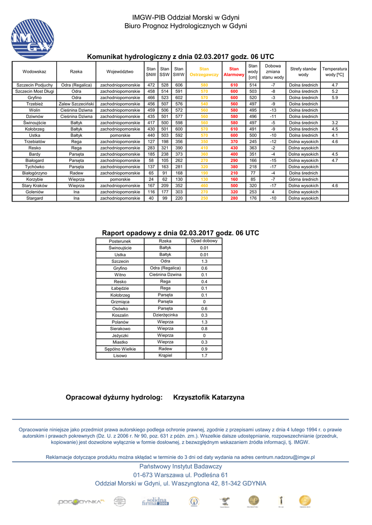 IMGW-PIB Oddział Morski w Gdyni Biuro Prognoz Hydrologicznych w Gdyni Komunikat hydrologiczny z dnia 02.03.2017 godz. 06 UTC Wodowskaz Rzeka Województwo Szczecin Podjuchy Szczecin Most Długi Gryfino Trzebież Wolin Dziwnów Świnoujście Kołobrzeg Ustka Trzebiatów Resko Bardy Białogard Tychówko Białogórzyno Korzybie Stary Kraków Goleniów Stargard Odra (Regalica) Odra Odra Zalew Szczeciński Cieśnina Dziwna Cieśnina Dziwna Bałtyk Bałtyk Bałtyk Rega Rega Parsęta Parsęta Parsęta Radew Wieprza Wieprza Ina Ina zachodniopomorskie zachodniopomorskie zachodniopomorskie zachodniopomorskie zachodniopomorskie zachodniopomorskie zachodniopomorskie zachodniopomorskie pomorskie zachodniopomorskie zachodniopomorskie zachodniopomorskie zachodniopomorskie zachodniopomorskie zachodniopomorskie pomorskie zachodniopomorskie zachodniopomorskie zachodniopomorskie Stan Stan Stan SNW SSW SWW 472 458 466 456 459 435 417 430 440 127 283 185 58 137 65 24 167 116 40 528 514 523 507 506 501 500 501 503 198 321 238 105 163 91 62 209 177 99 606 591 602 576 572 577 598 600 592 356 390 373 262 281 168 130 352 303 220 Stan Ostrzegawczy 580 570 570 540 560 560 560 570 570 350 410 360 270 320 190 130 460 270 250 Stan Dobowa Stan wody zmiana Alarmowy [cm] stanu wody 610 600 600 560 580 580 580 610 600 370 430 400 290 380 210 160 500 320 280 514 503 520 497 495 496 497 491 500 245 363 351 166 218 77 85 320 253 176 -7 -8 -3 -9 -13 -11 -5 -9 -10 -12 -2 -4 -15 -17 -4 -7 -17 4 -10 Strefy stanów wody Temperatura wody [ºC] Dolna średnich Dolna średnich Dolna średnich Dolna średnich Dolna średnich Dolna średnich Dolna średnich Dolna średnich Dolna średnich Dolna wysokich Dolna wysokich Dolna wysokich Dolna wysokich Dolna wysokich Dolna średnich Górna średnich Dolna wysokich Dolna wysokich Dolna wysokich 4.7 5.2 5.9 3.2 4.5 4.1 4.6 4.5 4.7 4.6 Raport opadowy z dnia 02.03.2017 godz. 06 UTC Posterunek Rzeka Świnoujście Bałtyk Opad dobowy [mm] 0.01 Ustka Bałtyk 0.01 Szczecin Odra 1.3 Gryfino Odra (Regalica) 0.6 Witno Cieśnina Dzwina 0.1 Resko Rega 0.4 Łabędzie Rega 0.1 Kołobrzeg Parsęta 0.1 Grzmiąca Parsęta 0 Osówko Parsęta 0.6 Koszalin Dzierżęcinka 0.3 Polanów Wieprza 1.3 Sierakowo Wieprza 0.8 Jeżyczki Wieprza 0 Miastko Wieprza 0.3 Sępólno Wielkie Radew 0.9 Lisowo Krąpiel 1.7 Opracował dyżurny hydrolog: Krzysztofik Katarzyna Opracowanie niniejsze jako przedmiot prawa autorskiego podlega ochronie prawnej, zgodnie z przepisami ustawy z dnia 4 lutego 1994 r. o prawie autorskim i prawach pokrewnych (Dz. U. z 2006 r. Nr 90, poz. 631 z późn. zm.). Wszelkie dalsze udostępnianie, rozpowszechnianie (przedruk, kopiowanie) jest dozwolone wyłącznie w formie dosłownej, z bezwzględnym wskazaniem źródła informacji, tj. IMGW. Reklamacje dotyczące produktu można skłądać w terminie do 3 dni od daty wydania na adres [email protected] Państwowy Instytut Badawczy 01-673 Warszawa ul. Podleśna 61 Oddział Morski w Gdyni, ul. Waszyngtona 42, 81-342 GDYNIA