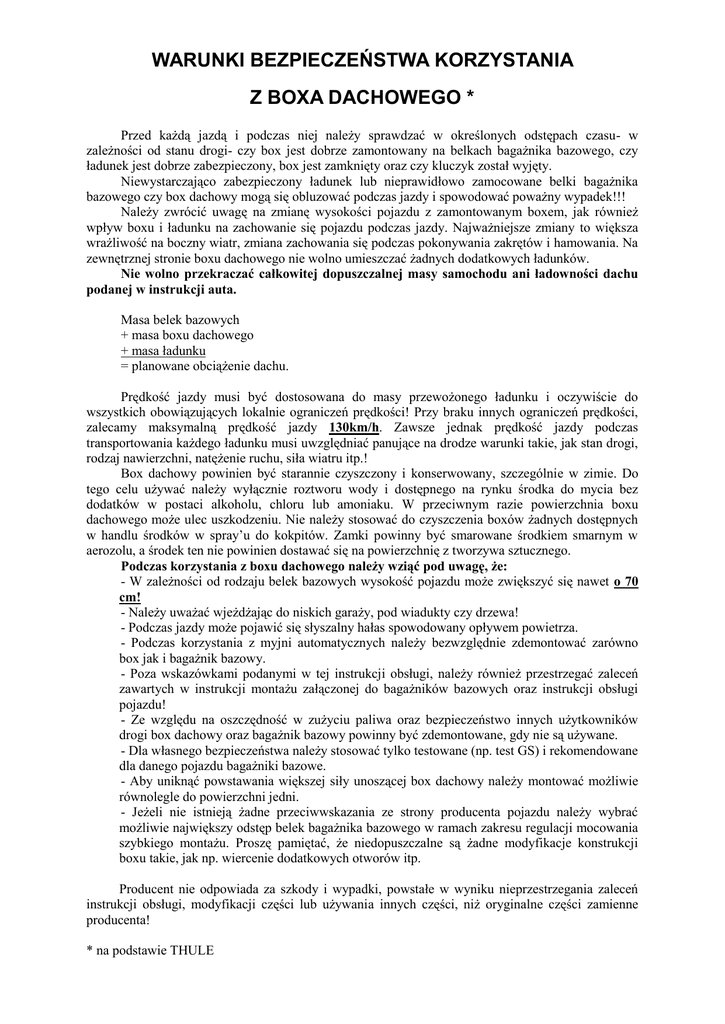 WARUNKI BEZPIECZEŃSTWA KORZYSTANIA Z BOXA DACHOWEGO * Przed każdą jazdą i podczas niej należy sprawdzać w określonych odstępach czasu- w zależności od stanu drogi- czy box jest dobrze zamontowany na belkach bagażnika bazowego, czy ładunek jest dobrze zabezpieczony, box jest zamknięty oraz czy kluczyk został wyjęty. Niewystarczająco zabezpieczony ładunek lub nieprawidłowo zamocowane belki bagażnika bazowego czy box dachowy mogą się obluzować podczas jazdy i spowodować poważny wypadek!!! Należy zwrócić uwagę na zmianę wysokości pojazdu z zamontowanym boxem, jak również wpływ boxu i ładunku na zachowanie się pojazdu podczas jazdy. Najważniejsze zmiany to większa wrażliwość na boczny wiatr, zmiana zachowania się podczas pokonywania zakrętów i hamowania. Na zewnętrznej stronie boxu dachowego nie wolno umieszczać żadnych dodatkowych ładunków. Nie wolno przekraczać całkowitej dopuszczalnej masy samochodu ani ładowności dachu podanej w instrukcji auta. Masa belek bazowych + masa boxu dachowego + masa ładunku = planowane obciążenie dachu. Prędkość jazdy musi być dostosowana do masy przewożonego ładunku i oczywiście do wszystkich obowiązujących lokalnie ograniczeń prędkości! Przy braku innych ograniczeń prędkości, zalecamy maksymalną prędkość jazdy 130km/h. Zawsze jednak prędkość jazdy podczas transportowania każdego ładunku musi uwzględniać panujące na drodze warunki takie, jak stan drogi, rodzaj nawierzchni, natężenie ruchu, siła wiatru itp.! Box dachowy powinien być starannie czyszczony i konserwowany, szczególnie w zimie. Do tego celu używać należy wyłącznie roztworu wody i dostępnego na rynku środka do mycia bez dodatków w postaci alkoholu, chloru lub amoniaku. W przeciwnym razie powierzchnia boxu dachowego może ulec uszkodzeniu. Nie należy stosować do czyszczenia boxów żadnych dostępnych w handlu środków w spray’u do kokpitów. Zamki powinny być smarowane środkiem smarnym w aerozolu, a środek ten nie powinien dostawać się na powierzchnię z tworzywa sztucznego. Podczas korzystania z boxu dachowego należy wziąć pod uwagę, że: - W zależności od rodzaju belek bazowych wysokość pojazdu może zwiększyć się nawet o 70 cm! - Należy uważać wjeżdżając do niskich garaży, pod wiadukty czy drzewa! - Podczas jazdy może pojawić się słyszalny hałas spowodowany opływem powietrza. - Podczas korzystania z myjni automatycznych należy bezwzględnie zdemontować zarówno box jak i bagażnik bazowy. - Poza wskazówkami podanymi w tej instrukcji obsługi, należy również przestrzegać zaleceń zawartych w instrukcji montażu załączonej do bagażników bazowych oraz instrukcji obsługi pojazdu! - Ze względu na oszczędność w zużyciu paliwa oraz bezpieczeństwo innych użytkowników drogi box dachowy oraz bagażnik bazowy powinny być zdemontowane, gdy nie są używane. - Dla własnego bezpieczeństwa należy stosować tylko testowane (np. test GS) i rekomendowane dla danego pojazdu bagażniki bazowe. - Aby uniknąć powstawania większej siły unoszącej box dachowy należy montować możliwie równolegle do powierzchni jedni. - Jeżeli nie istnieją żadne przeciwwskazania ze strony producenta pojazdu należy wybrać możliwie największy odstęp belek bagażnika bazowego w ramach zakresu regulacji mocowania szybkiego montażu. Proszę pamiętać, że niedopuszczalne są żadne modyfikacje konstrukcji boxu takie, jak np. wiercenie dodatkowych otworów itp. Producent nie odpowiada za szkody i wypadki, powstałe w wyniku nieprzestrzegania zaleceń instrukcji obsługi, modyfikacji części lub używania innych części, niż oryginalne części zamienne producenta! * na podstawie THULE