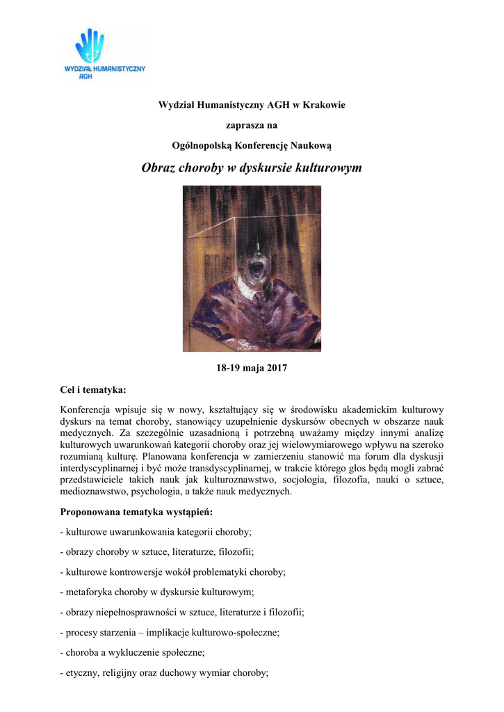 Wydział Humanistyczny AGH w Krakowie zaprasza na Ogólnopolską Konferencję Naukową Obraz choroby w dyskursie kulturowym 18-19 maja 2017 Cel i tematyka: Konferencja wpisuje się w nowy, kształtujący się w środowisku akademickim kulturowy dyskurs na temat choroby, stanowiący uzupełnienie dyskursów obecnych w obszarze nauk medycznych. Za szczególnie uzasadnioną i potrzebną uważamy między innymi analizę kulturowych uwarunkowań kategorii choroby oraz jej wielowymiarowego wpływu na szeroko rozumianą kulturę. Planowana konferencja w zamierzeniu stanowić ma forum dla dyskusji interdyscyplinarnej i być może transdyscyplinarnej, w trakcie którego głos będą mogli zabrać przedstawiciele takich nauk jak kulturoznawstwo, socjologia, filozofia, nauki o sztuce, medioznawstwo, psychologia, a także nauk medycznych. Proponowana tematyka wystąpień: - kulturowe uwarunkowania kategorii choroby; - obrazy choroby w sztuce, literaturze, filozofii; - kulturowe kontrowersje wokół problematyki choroby; - metaforyka choroby w dyskursie kulturowym; - obrazy niepełnosprawności w sztuce, literaturze i filozofii; - procesy starzenia – implikacje kulturowo-społeczne; - choroba a wykluczenie społeczne; - etyczny, religijny oraz duchowy wymiar choroby; - psychologiczno-kulturowe aspekty choroby; - obraz choroby w mediach; - obrazy choroby w dyskursie polityczno-społecznym; - obraz zdrowia i choroby w dyskursie ekologicznym; - kulturowe aspekty teorii zdrowego trybu życia i diety. Rejestracja i opłaty: Koszt uczestnictwa: 300 zł (obejmuje: obsługę konferencji, catering, koszty druku publikacji). Prosimy o przesłanie tytułu 20-minutowego wystąpienia oraz abstraktu zawierającego ok. 1000 znaków, podanie afiliacji oraz danych kontaktowych. Na zgłoszenia czekamy do dnia 31 marca 2017 roku na adres: [email protected] . W tytule maila prosimy napisać: Obraz choroby. Do dnia 15 kwietnia 2017 roku zawiadomimy o akceptacji referatów. Po uzyskaniu akceptacji zgłoszenia prosimy o uiszczenie opłaty konferencyjnej do dnia 30 kwietnia 2017 roku na podane w mailu akceptacyjnym konto. Osobom zakwalifikowanym prześlemy również informację o możliwości zakwaterowania w Miasteczku Studenckim AGH. Materiały z konferencji, po uzyskaniu pozytywnych recenzji, opublikowane zostaną w „Studiach Humanistycznych AGH” (10 punktów wg punktacji MNiSW). Komitet Naukowy Konferencji: Prof. Jacek Dębicki – Przewodniczący (Wydział Humanistyczny AGH) Prof. Barbara Gąciarz (Wydział Humanistyczny AGH) Prof.Barbara Gryglewska (Collegium Medicum UJ) Prof. Zbigniew Pasek (Wydział Humanistyczny AGH) Prof. Anna Siwik (Wydział Humanistyczny AGH) Komitet Organizacyjny Konferencji: dr Anna Małecka - Przewodnicząca dr Maria Katarzyna Grzegorzewska dr Jowita Guja dr Ewa Migaczewska dr Anna Olszewska mgr Marcin Wądołowski - Sekretarz Elżbieta Murias Wydział Humanistyczny AGH ul. Gramatyka 8a 30-071 Kraków