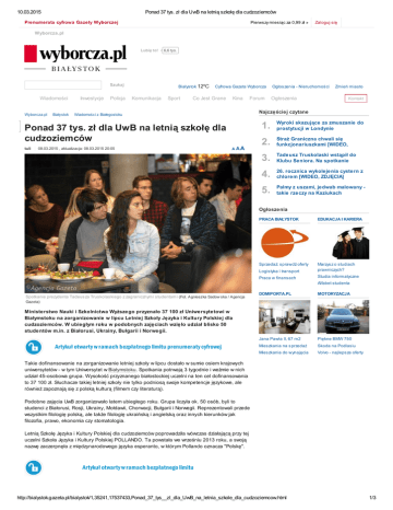 10.03.2015 Ponad 37 tys. zł dla UwB na letnią szkołę dla cudzoziemców Prenumerata cyfrowa Gazety Wyborczej Pierwszy miesiąc za 0,99 zł » Zaloguj się Wyborcza.pl Lubię to! Szukaj Wiadomości Wyborcza.pl Białystok Inwestycje Policja 6,6 tys. Białystok 12ºC Komunikacja Sport Cyfrowa Gazeta Wyborcza Co Jest Grane Kina Forum 08.03.2015 , aktualizacja: 08.03.2015 20:05 Ogłoszenia Zmień miasto Kontakt Najczęściej czytane Wiadomości z Białegostoku Ponad 37 tys. zł dla UwB na letnią szkołę dla cudzoziemców tuli Ogłoszenia - Nieruchomości A AA 1. Wyroki skazujące za zmuszanie do prostytucji w Londynie 2. 3. Straż Graniczna chwali się funkcjonariuszkami [WIDEO, ZDJĘCIA] Tadeusz Truskolaski wstąpił do Klubu Seniora. Na spotkanie 4. 26. rocznica wykolejenia cystern z chlorem [WIDEO, ZDJĘCIA] 5. Palmy z uszami, jedwab malowany takie rzeczy na Kaziukach [ZDJĘCIA] Ogłoszenia PRACA BIAŁYSTOK EDUKACJA I KARIERA Sprzedaż: sprawdź oferty Logistyka i transport Marzysz o studiach prawniczych? Praca w finansach Studia informatyczne Alfabet studenta Spotkanie prezydenta Tadeusza Truskolaskiego z zagranicznymi studentami (Fot. Agnieszka Sadow ska / Agencja DOMIPORTA.PL MOTORYZACJA Jana Pawła II, 67 m2 Piękne BMW 750 Mieszkania na sprzedaż Skoda na Podlasiu Mieszkania do wynajęcia Volvo - najlepsze oferty Gazeta) Ministerstwo Nauki i Szkolnictwa Wyższego przyznało 37 100 zł Uniwersytetowi w Białymstoku na zorganizowanie w lipcu Letniej Szkoły Języka i Kultury Polskiej dla cudzoziemców. W ubiegłym roku w podobnych zajęciach wzięło udział blisko 50 studentów m.in. z Białorusi, Ukrainy, Bułgarii i Norwegii. Artykuł otwarty w ramach bezpłatnego limitu prenumeraty cyfrowej Takie dofinansowanie na zorganizowanie letniej szkoły w lipcu dostało w sumie osiem krajowych uniwersytetów - w tym Uniwersytet w Białymstoku. Spotkania potrwają 3 tygodnie i weźmie w nich udział 45-osobowa grupa. Wysokość przyznanego białostockiej uczelni na ten cel dofinansowania to 37 100 zł. Słuchacze takiej letniej szkoły nie tylko podniosą swoje kompetencje językowe, ale również zapoznają się z polską kulturą (filmem czy literaturą). Podobne zajęcia UwB zorganizowało latem ubiegłego roku. Grupa liczyła ok. 50 osób, byli to studenci z Białorusi, Rosji, Ukrainy, Mołdawii, Chorwacji, Bułgarii i Norwegii. Reprezentowali przede wszystkim filologię polską, ale także filologię ukraińską i angielską oraz innych kierunków jak filozofia, prawo, ekonomia czy stomatologia. Letnią Szkołę Języka i Kultury Polskiej dla cudzoziemców poprowadziła wówczas działającą przy tej uczelni Szkoła Języka i Kultury Polskiej POLLANDO. Ta powstała we wrześniu 2013 roku, a swoją nazwę zaczerpnęła z międzynarodowego języka esperanto, w którym Pollando oznacza "Polskę". Artykuł otwarty w ramach bezpłatnego limitu http://bialystok.gazeta.pl/bialystok/1,35241,17537433,Ponad_37_tys__zl_dla_UwB_na_letnia_szkole_dla_cudzoziemcow.html 1/3 10.03.2015 Ponad 37 tys. zł dla UwB na letnią szkołę dla cudzoziemców Mamy 55 000 dowodów, że Polacy cenią dobre dziennikarstwo Dołącz do licznego grona prenumeratorów cyfrowej Wyborczej. Czytaj na komputerze, tablecie, telefonie i czytniku e-booków Wypróbuj teraz za 0,99 zł Zaloguj się / Informacje / Kontakt Zobacz także Najlepszy wynalazca z Uniwersytetu Medycznego w Białymstoku Studenci liczą na 200 tys. zł od miasta na juwenalia Jesteśmy w czołówce Imagine Cup. To studenci PB Do rozdania 11 mln zł na żłobki i klubiki na uczelniach Zobacz więcej na temat: wielokulturowość Uniwersytet w Białymstoku studenci Skomentuj: Skomentuj Zaloguj się MIEJSCA TEMATY CO JEST GRANE PRACA CENNIKI REKLAM KONTAKT Z REDAKCJĄ Akcent ZOO Galeria Arsenał Now e knajpki, sklepy Pałac Branickich Opera i Filharmonia Podlaska stadion miejski lotnisko Białystok Łomża Suw ałki Wiadomości z Białegostoku i regionu 23. finał WOŚP Studniów ka Białystok Odśnieżanie. Kto, gdzie Uczelnie w yższe Row ery Interw encje Gazety MPEC Białystok Z sądu: procesy, w yroki Kronika policyjna Historia Białegostoku Śmieci, segregow anie Słow nik mow y białostockiej Wojciech Koronkiew icz Andrzej Lechow ski Forum Białystok Forum Bielsk Podlaski Forum Gródek Forum Hajnów ka Forum Suw ałki Forum Augustów Forum Łomża Forum Siemiatycze Forum Czarna Średnia Forum Plutycze Zapow iedzi, recenzje Repertuar kin Recenzje filmow e Św iadectw o pracy List motyw acyjny CV, w zory CV Praca podlaskie Praca Suw ałki Praca Łomża Praca Kierow ca Białystok Praca Magazynier Białystok Praca Sprzedaw ca Białystok Praca w Ochronie Białystok Praca Sprzątanie Białystok Praca Kosmetyczka Białystok Cennik ogłoszeń w ymiarow ych Cennik ogłoszeń drobnych sprzedaż na odległość Cennik ogłoszeń drobnych sprzedaż bezpośrednia Cennik nekrologów Wszystko o reklamie w Gazecie Wyborczej ul. Branickiego 17A 15-085 Białystok tel. (85) 74 78 101 KOMUNIKACJA Remonty ulic Białostockie autobusy Trasa S8 Koleje BiKeR row er miejski Na skróty: Gazeta.pl Polecamy: Miasta Wiadomości Wpadki Sport.pl Wybory 2014 SPORT W BIAŁYMSTOKU Jagiellonia Piłka nożna Wigry Suw ałki Koszyków ka Siatków ka Ślepsk Suw ałki Kajakarstw o Lekkoatletyka Boks Biznes Program TV NIERUCHOMOŚCI Domy na sprzedaż Domy do w ynajęcia Działki na sprzedaż Nieruchomości na sprzedaż Nieruchomości do w ynajęcia FIRMY KRS Białystok Przetargi podlaskie Dyżurny dziennikarz: tel. 85 74 78 158 fax. (85) 74 78 138 [email protected] Dział sprzedaży: [email protected] tel. (85) 74 78 111 OGŁOSZENIA Ogłoszenia Białystok STUDIA Studia Białystok Szkolenia Białystok Matura Egzamin gimnazjalny Słow nik Gazeta Wyborcza Pogoda Praca Tematy Program TV Wideo Wyniki Lotto http://bialystok.gazeta.pl/bialystok/1,35241,17537433,Ponad_37_tys__zl_dla_UwB_na_letnia_szkole_dla_cudzoziemcow.html 2/3 10.03.2015 Ponad 37 tys. zł dla UwB na letnią szkołę dla cudzozie