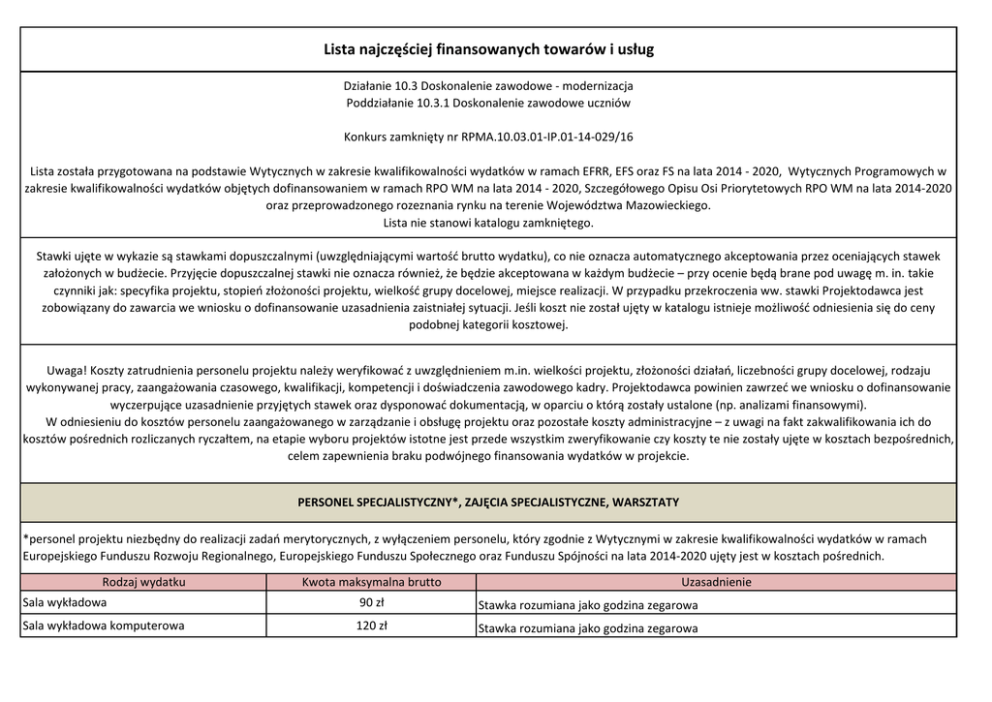 Lista najczęściej finansowanych towarów i usług Działanie 10.3 Doskonalenie zawodowe - modernizacja Poddziałanie 10.3.1 Doskonalenie zawodowe uczniów Konkurs zamknięty nr RPMA.10.03.01-IP.01-14-029/16 Lista została przygotowana na podstawie Wytycznych w zakresie kwalifikowalności wydatków w ramach EFRR, EFS oraz FS na lata 2014 - 2020, Wytycznych Programowych w zakresie kwalifikowalności wydatków objętych dofinansowaniem w ramach RPO WM na lata 2014 - 2020, Szczegółowego Opisu Osi Priorytetowych RPO WM na lata 2014-2020 oraz przeprowadzonego rozeznania rynku na terenie Województwa Mazowieckiego. Lista nie stanowi katalogu zamkniętego. Stawki ujęte w wykazie są stawkami dopuszczalnymi (uwzględniającymi wartość brutto wydatku), co nie oznacza automatycznego akceptowania przez oceniających stawek założonych w budżecie. Przyjęcie dopuszczalnej stawki nie oznacza również, że będzie akceptowana w każdym budżecie – przy ocenie będą brane pod uwagę m. in. takie czynniki jak: specyfika projektu, stopień złożoności projektu, wielkość grupy docelowej, miejsce realizacji. W przypadku przekroczenia ww. stawki Projektodawca jest zobowiązany do zawarcia we wniosku o dofinansowanie uzasadnienia zaistniałej sytuacji. Jeśli koszt nie został ujęty w katalogu istnieje możliwość odniesienia się do ceny podobnej kategorii kosztowej. Uwaga! Koszty zatrudnienia personelu projektu należy weryfikować z uwzględnieniem m.in. wielkości projektu, złożoności działań, liczebności grupy docelowej, rodzaju wykonywanej pracy, zaangażowania czasowego, kwalifikacji, kompetencji i doświadczenia zawodowego kadry. Projektodawca powinien zawrzeć we wniosku o dofinansowanie wyczerpujące uzasadnienie przyjętych stawek oraz dysponować dokumentacją, w oparciu o którą zostały ustalone (np. analizami finansowymi). W odniesieniu do kosztów personelu zaangażowanego w zarządzanie i obsługę projektu oraz pozostałe koszty administracyjne – z uwagi na fakt zakwalifikowania ich do kosztów pośrednich rozliczanych ryczałtem, na etapie wyboru projektów istotne jest przede wszystkim zweryfikowanie czy koszty te nie zostały ujęte w kosztach bezpośrednich, celem zapewnienia braku podwójnego finansowania wydatków w projekcie. PERSONEL SPECJALISTYCZNY*, ZAJĘCIA SPECJALISTYCZNE, WARSZTATY *personel projektu niezbędny do realizacji zadań merytorycznych, z wyłączeniem personelu, który zgodnie z Wytycznymi w zakresie kwalifikowalności wydatków w ramach Europejskiego Funduszu Rozwoju Regionalnego, Europejskiego Funduszu Społecznego oraz Funduszu Spójności na lata 2014-2020 ujęty jest w kosztach pośrednich. Rodzaj wydatku Kwota maksymalna brutto Uzasadnienie Sala wykładowa 90 zł Stawka rozumiana jako godzina zegarowa Sala wykładowa komputerowa 120 zł Stawka rozumiana jako godzina zegarowa Wynagrodzenie trenera/wykładowcy (umowa zlecenie) Zestaw szkoleniowy (np. teczka, notes, długopis, pendrive z materiałami szkoleniowymi) 200 zł Stawka rozumiana jako godzina zegarowa 50 zł/osoba STAŻE I PRAKTYKI ZAWODOWE Rodzaj wydatku Kwota maksymalna brutto Stypendium za odbytą praktykę zawodową/staż zawodowy W okresie odbywania stażu stazyscie przysługuje miesięczne stypendium w wysokości nie wiekszej niż połowa sredniego wynagrodzenia (brutto). Wysokość stypendium wyliczona na podstawie aktualnych danych GUS (wg stanu na dzień ogłoszenia konkursu), dotyczących średniego wynagrodzenia (brutto) za pracę w województwie mazowieckim. Koszty związane z odbywaniem staży i praktyk zawodowych 5 000 zł/ osoba Uzasadnienie Okres realizacji praktyki zawodowej lub stażu zawodowego wynosi minimum 150 godzin i nie więcej niż 970 godzin w odniesieniu do udziału jednego ucznia lub słuchacza w ww. formach wsparcia. Stypendium jest wypłacane za każde kolejne przepracowane 150 godzin. W przypadku realizacji praktyki zawodowej lub stażu zawodowego w wymiarze 970 h wysokość stypendium wliczana jest proporcjonalnie. Wydatki związane z odbywaniem praktyki zawodowej lub stażu zawodowego (np. koszty dojazdu, koszty zakupu odzieży roboczej, koszty eksploatacji materiałów i narzędzi, szkolenia BHP praktykanta lub stażysty itp.) w wysokości nieprzekraczającej 5 000 zł/osoba. Kwota może zostać zwiększona jedynie w sytuacji konieczności ponoszenia dodatkowych kosztów związanych z udziałem uczniów w praktyce zawodowej lub stażu zawodowym, wynikających ze zwiększonego wymiaru czasu trwania ww. form wsparcia. Na jednego opiekuna praktyki lub stażu nie może przypadać jednocześnie więcej niż 6 praktykantów lub stażystów. Opiekun praktykanta lub stażysty jest wyznaczany po stronie podmiotu przyjmującego ucznia na praktykę zawodową lub staż zawodowy. Koszty wynagrodzenia opiekuna praktykanta lub stażysty u pracodawcy powinny uwzględniać jedną z poniższych opcji: do 5 000 zł Opiekun staży i praktyk do 500 zł zgodnie z rozporządzeniem MEN Refundacja pracodawcy wynagrodzenia opiekuna praktykanta lub stażysty w zakresie odpowiadającym częściowemu lub całkowitemu zwolnieniu go od świadczenia pracy na rzecz realizacji zadań związanych z opieką nad grupą praktykantów lub stażystów, przez okres 150 godzin praktyki zawodowej lub stażu zawodowego, w wysokości obliczonej jak za urlop wypoczynkowy ale nie więcej niż 5 000 zł brutto. Wysokość wynagrodzenia nalicza się proporcjonalnie do liczby godzin praktyki zawodowej lub stażu zawodowego zrealizowanych przez uczniów. Refundacja pracodawcy dodatku do wynagrodzenia opiekuna praktykanta lub stażysty, w sytuacji, gdy nie został zwolniony od świadczenia pracy, w wysokości nieprzekraczającej 10% jego zasadniczego wynagrodzenia wraz ze wszystkimi składnikami wynagrodzenia wynikającego ze zwiększonego zakresu zadań (opieka nad grupą praktykantów lub stażystów ale nie więcej niz 500 zł brutto za realizacje 150 h praktyki zawodowej lub stazu zawodowe
