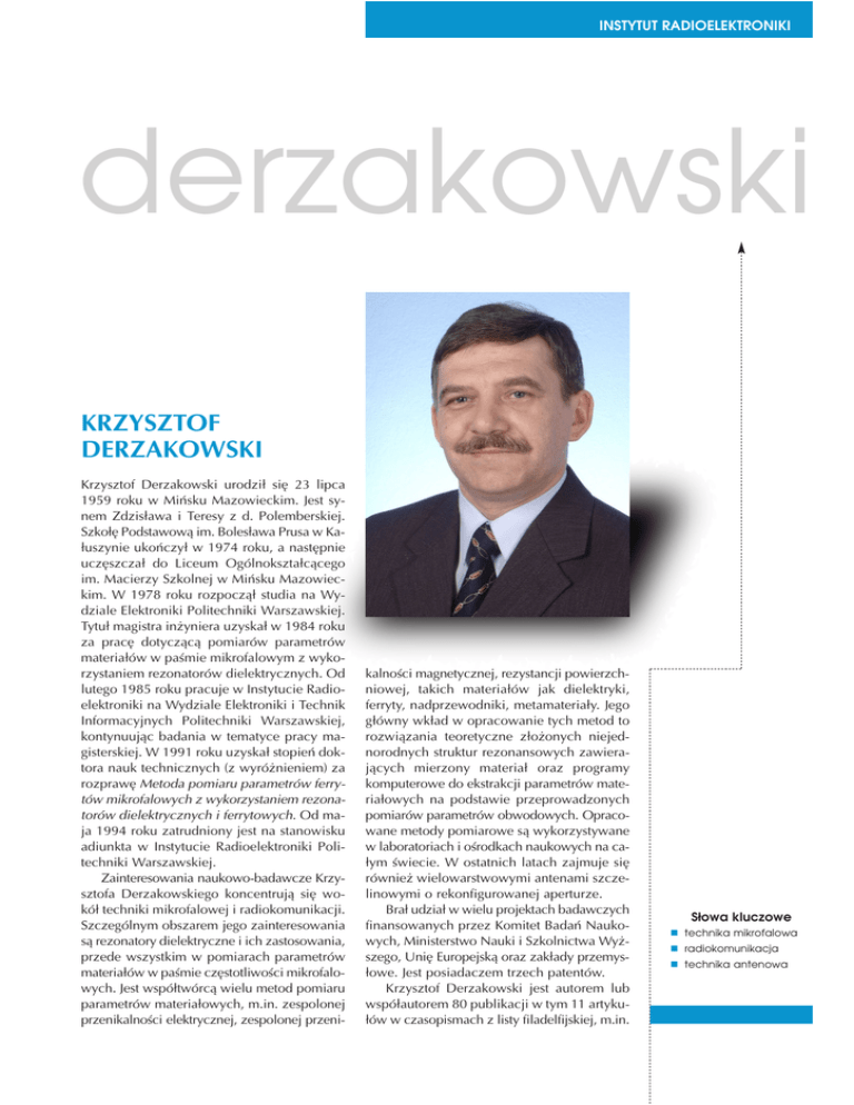 INSTYTUT RADIOELEKTRONIKI derzakowski KRZYSZTOF DERZAKOWSKI Krzysztof Derzakowski urodzi³ siê 23 lipca 1959 roku w Miñsku Mazowieckim. Jest synem Zdzis³awa i Teresy z d. Polemberskiej. Szko³ê Podstawow¹ im. Boles³awa Prusa w Ka³uszynie ukoñczy³ w 1974 roku, a nastêpnie uczêszcza³ do Liceum Ogólnokszta³c¹cego im. Macierzy Szkolnej w Miñsku Mazowieckim. W 1978 roku rozpocz¹³ studia na Wydziale Elektroniki Politechniki Warszawskiej. Tytu³ magistra in¿yniera uzyska³ w 1984 roku za pracê dotycz¹c¹ pomiarów parametrów materia³ów w paœmie mikrofalowym z wykorzystaniem rezonatorów dielektrycznych. Od lutego 1985 roku pracuje w Instytucie Radioelektroniki na Wydziale Elektroniki i Technik Informacyjnych Politechniki Warszawskiej, kontynuuj¹c badania w tematyce pracy magisterskiej. W 1991 roku uzyska³ stopieñ doktora nauk technicznych (z wyró¿nieniem) za rozprawê Metoda pomiaru parametrów ferrytów mikrofalowych z wykorzystaniem rezonatorów dielektrycznych i ferrytowych. Od maja 1994 roku zatrudniony jest na stanowisku adiunkta w Instytucie Radioelektroniki Politechniki Warszawskiej. Zainteresowania naukowo-badawcze Krzysztofa Derzakowskiego koncentruj¹ siê wokó³ techniki mikrofalowej i radiokomunikacji. Szczególnym obszarem jego zainteresowania s¹ rezonatory dielektryczne i ich zastosowania, przede wszystkim w pomiarach parametrów materia³ów w paœmie czêstotliwoœci mikrofalowych. Jest wspó³twórc¹ wielu metod pomiaru parametrów materia³owych, m.in. zespolonej przenikalnoœci elektrycznej, zespolonej przeni- kalnoœci magnetycznej, rezystancji powierzchniowej, takich materia³ów jak dielektryki, ferryty, nadprzewodniki, metamateria³y. Jego g³ówny wk³ad w opracowanie tych metod to rozwi¹zania teoretyczne z³o¿onych niejednorodnych struktur rezonansowych zawieraj¹cych mierzony materia³ oraz programy komputerowe do ekstrakcji parametrów materia³owych na podstawie przeprowadzonych pomiarów parametrów obwodowych. Opracowane metody pomiarowe s¹ wykorzystywane w laboratoriach i oœrodkach naukowych na ca³ym œwiecie. W ostatnich latach zajmuje siê równie¿ wielowarstwowymi antenami szczelinowymi o rekonfigurowanej aperturze. Bra³ udzia³ w wielu projektach badawczych finansowanych przez Komitet Badañ Naukowych, Ministerstwo Nauki i Szkolnictwa Wy¿szego, Uniê Europejsk¹ oraz zak³ady przemys³owe. Jest posiadaczem trzech patentów. Krzysztof Derzakowski jest autorem lub wspó³autorem 80 publikacji w tym 11 artyku³ów w czasopismach z listy filadelfijskiej, m.in. Słowa kluczowe n technika mikrofalowa n radiokomunikacja n technika antenowa INSTYTUT RADIOELEKTRONIKI D w: „IEEE Transactions on Microwave Theory and Techniques”, „IEEE Transactions on Antennas and Propagations”, „Measurement Science and Technology”. Za artyku³ w czasopiœmie „Measurement Science and Technology” pt. Complex Permittivity of Some Ultra-low Loss Dielectric Crystals at Cryogenic Temperature otrzyma³ nagrodê MST Best Paper Award w 1999 roku (wspólnie z J. Krupk¹, M. Tobar, J. Hartnett, R.G. Geyer). Za referat pt. Extending Functionalities of Waveguide Slot Antennas by Means of Reconfigurable Aperture otrzyma³ wspólnie z Yevhenem Yashchyshynem i Jerzym Modelskim nagrodê EuMC Mirowave Prize w 2008 roku w Amsterdamie. Jego publikacje s¹ czêsto cytowane przez innych autorów z ca³ego œwiata — œrednio 27 razy rocznie (wed³ug Science Citation Index). Za osi¹gniêcia naukowo-badawcze otrzymywa³ nagrody Ministra Edukacji Narodowej w 1991 i 1995 roku oraz Rektora Politechniki Warszawskiej w 1987 i 2009 roku. Otrzyma³ równie¿ nagrodê URSI Young Scientists Award w 1989 roku w Sztokholmie. Od 2010 roku jest recenzentem w presti¿owych czasopismach naukowych: „IEEE Transactions on Microwave Theory and Techniques” i „IEEE Microwave and Wireless Components Letters”. Jest cz³onkiem IEEE MTT Society. By³ opiekunem kilkudziesiêciu prac dyplomowych — magisterskich i in¿ynierskich. Jest kierownikiem Laboratorium Podstaw Techniki Mikroprocesorowej.