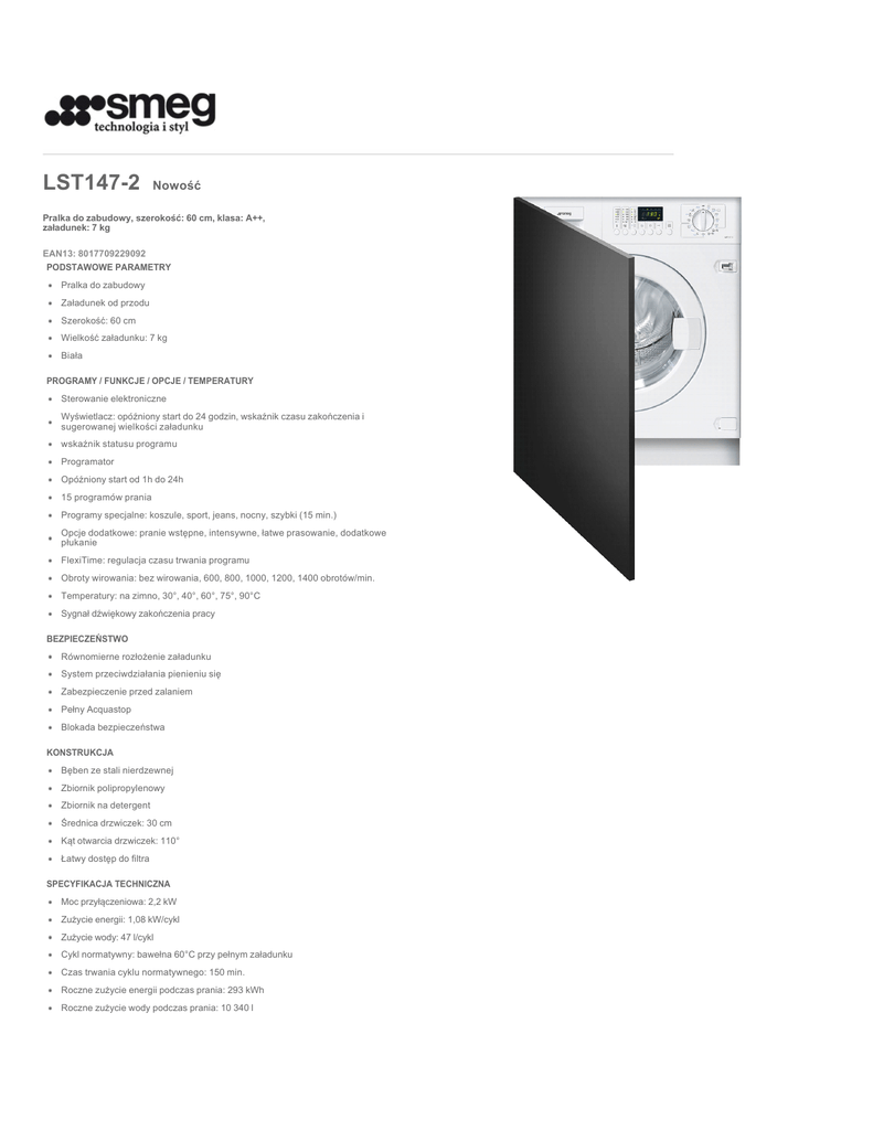 LST147-2 Nowość Pralka do zabudowy, szerokość: 60 cm, klasa: A++, załadunek: 7 kg EAN13: 8017709229092 PODSTAWOWE PARAMETRY Pralka do zabudowy Załadunek od przodu Szerokość: 60 cm Wielkość załadunku: 7 kg Biała PROGRAMY / FUNKCJE / OPCJE / TEMPERATURY Sterowanie elektroniczne Wyświetlacz: opóźniony start do 24 godzin, wskaźnik czasu zakończenia i sugerowanej wielkości załadunku wskaźnik statusu programu Programator Opóźniony start od 1h do 24h 15 programów prania Programy specjalne: koszule, sport, jeans, nocny, szybki (15 min.) Opcje dodatkowe: pranie wstępne, intensywne, łatwe prasowanie, dodatkowe płukanie FlexiTime: regulacja czasu trwania programu Obroty wirowania: bez wirowania, 600, 800, 1000, 1200, 1400 obrotów/min. Temperatury: na zimno, 30°, 40°, 60°, 75°, 90°C Sygnał dźwiękowy zakończenia pracy BEZPIECZEŃSTWO Równomierne rozłożenie załadunku System przeciwdziałania pienieniu się Zabezpieczenie przed zalaniem Pełny Acquastop Blokada bezpieczeństwa KONSTRUKCJA Bęben ze stali nierdzewnej Zbiornik polipropylenowy Zbiornik na detergent Średnica drzwiczek: 30 cm Kąt otwarcia drzwiczek: 110° Łatwy dostęp do filtra SPECYFIKACJA TECHNICZNA Moc przyłączeniowa: 2,2 kW Zużycie energii: 1,08 kW/cykl Zużycie wody: 47 l/cykl Cykl normatywny: bawełna 60°C przy pełnym załadunku Czas trwania cyklu normatywnego: 150 min. Roczne zużycie energii podczas prania: 293 kWh Roczne zużycie wody podczas prania: 10 340 l Poziom hałasu (pranie) 56 dB(A) Poziom hałasu (wirowanie) 72 dB(A) Napięcie: 220-240 V Częstotliwość: 50 Hz Functions Smeg Polska Sp. z o.o. ul. Cybernetyki 9 02-677 Warszawa Tel. +48 22 276 14 00 LST147-2 pralki do zabudowy ładowane od przodu A++: Zmywarki, chłodziarki, pralki w klasie A ++ zużywają do 20% mniej energii w stosunku do urządzeń należących do klasy A. Urządzenia tej klasy gwarantują zmniejszone zużycie energii, maksymalną efektywność energetyczną i poszanowanie dla środowiska naturalnego. Załadunek prania 7 kg: Ilość załadunku, która może zostać umieszczona w bębnie w celu uzyskania maksymalnej efektywności prania. Total acquastop: Total acquastop wyklucza możliwość zalania pomieszczenia, w którym znajduje się urządzenie poprzez zastosowanie specjalnego mikroprzełącznika. Sam mikroprzełącznik natychmiast blokuje dopływ wody do urządzenia w momencie ewentualnej awarii. Co więcej, dodatkowy zawór elektromagnetyczny, umieszczony na przewodzie doprowadzającym wodę, automatycznie odcina dopływ wody w przypadku nieszczelności samego przewodu. Wyświetlacz LED: Optymalizuje osiągi i ułatwia korzystanie z urządzenia. Średnica otworu bębna 30 cm: 30 cm średnica otworu bębna sprawia, że załadunek i wyładunek staje się łatwy oraz efektywny. Elastyczny czas pracy: Funkcja pozwala na skrócenie ustalonego czasu pracy wybranego programu. SYGNAŁ AKUSTYCZNY: Sygnał akustyczny informuje o zakończeniu suszenia, aby jak najszybciej wyjąć ubrania. BLOKADA BEZPIECZEŃSTWA: Blokady przeciwko dzieciom są stosowane w takich urządzeniach jak kuchenki, płyty grzewcze i zmywarki. Gdy opcja jest włączona wszystkie funkcje i programy są zablokowane, włącznie z funkcjami włączania i wyłączania urządzenia, co zapewnia pełne bezpieczeństwo dla dzieci. Smeg Polska Sp. z o.o. ul. Cybernetyki 9 02-677 Warszawa Tel. +48 22 276 14 00 LST147-2 pralki do zabudowy ładowane od przodu Smeg Polska Sp. z o.o. ul. Cybernetyki 9 02-677 Warszawa Tel. +48 22 276 14 00