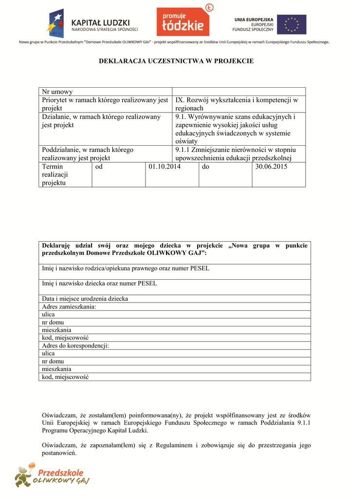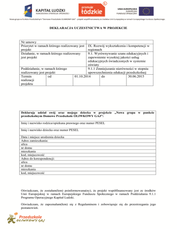 DEKLARACJA UCZESTNICTWA W PROJEKCIE Nr umowy Priorytet w ramach którego realizowany jest projekt Działanie, w ramach którego realizowany jest projekt Poddziałanie, w ramach którego realizowany jest projekt Termin od realizacji projektu IX. Rozwój wykształcenia i kompetencji w regionach 9.1. Wyrównywanie szans edukacyjnych i zapewnienie wysokiej jakości usług edukacyjnych świadczonych w systemie oświaty 9.1.1 Zmniejszanie nierówności w stopniu upowszechnienia edukacji przedszkolnej 01.10.2014 do 30.06.2015 Deklaruję udział swój oraz mojego dziecka w projekcie „Nowa grupa w punkcie przedszkolnym Domowe Przedszkole OLIWKOWY GAJ”: Imię i nazwisko rodzica/opiekuna prawnego oraz numer PESEL Imię i nazwisko dziecka oraz numer PESEL Data i miejsce urodzenia dziecka Adres zamieszkania: ulica nr domu mieszkania kod, miejscowość Adres do korespondencji: ulica nr domu mieszkania kod, miejscowość Oświadczam, że zostałam(łem) poinformowana(ny), że projekt współfinansowany jest ze środków Unii Europejskiej w ramach Europejskiego Funduszu Społecznego w ramach Poddziałania 9.1.1 Programu Operacyjnego Kapitał Ludzki. Oświadczam, że zapoznałam(łem) się z Regulaminem i zobowiązuje się do przestrzegania jego postanowień. Wyrażam zgodę na wykonywanie fotografii obejmujących wizerunek dziecka oraz mój własny i publikację zdjęć z realizacji Projektu na potrzeby projektu. Wyrażam zgodę na badania ewaluacyjne i ankietowe, których celem jest udoskonalenie oferowanej dotychczas pomocy i lepsze dostosowanie jej do potrzeb uczestników projektu. Oświadczam, że dziecko spełnia warunki kwalifikowalności w projekcie ujęte w Regulaminie projektu. Składając osobiście niniejszą deklarację oświadczam iż zostałam(łem) uprzedzony o odpowiedzialności karnej z art. 233 § 1 Kodeksu karnego, potwierdzam własnoręcznym podpisem prawdziwość danych zamieszczonych w deklaracji. Oświadczam, że zgodnie z przepisami ustawy z dnia 29 sierpnia 1997 r. o ochronie danych osobowych (jednolity tekst: Dz.U.Nr 101 poz. 926 z 2002 r.) wyrażam zgodę na przetwarzanie moich danych osobowych przez OLIWKOWY GAJ dla potrzeb procesu rekrutacji i realizacji projektu "Nowa grupa w punkcie przedszkolnym Domowe Przedszkole OLIWKOWY GAJ" współfinansowanego ze środków Unii Europejskiej w ramach Europejskiego Funduszu Społecznego. ………………………………………………….................... Miejscowość, data, czytelny podpis Wypełnia realizator projektu: Data wpłynięcia dokumentów: ……………………………………………………… Uczestnik/uczestniczka spełnia kryteria rekrutacyjne do wzięcia udziału w projekcie „Przedszkolak – to brzmi dumnie”: TAK NIE …………………………………………………………………………….. Data, podpis