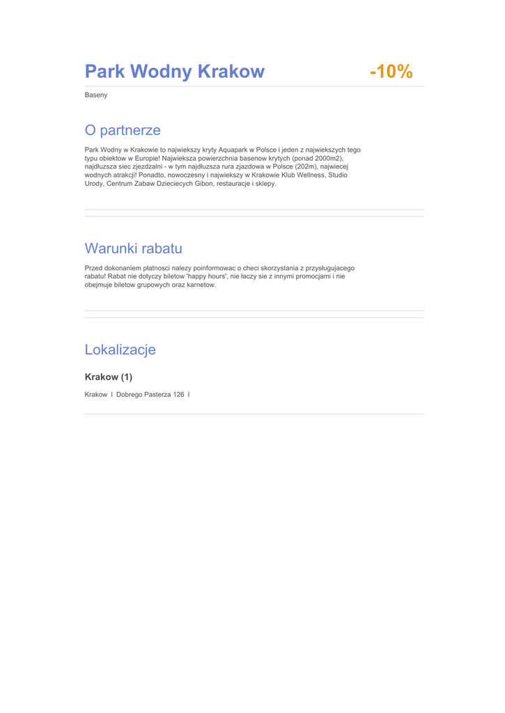 Park Wodny Krakow Baseny O partnerze Park Wodny w Krakowie to najwiekszy kryty Aquapark w Polsce i jeden z najwiekszych tego typu obiektow w Europie! Najwieksza powierzchnia basenow krytych (ponad 2000m2), najdłuzsza siec zjezdzalni - w tym najdłuzsza rura zjazdowa w Polsce (202m), najwiecej wodnych atrakcji! Ponadto, nowoczesny i najwiekszy w Krakowie Klub Wellness, Studio Urody, Centrum Zabaw Dzieciecych Gibon, restauracje i sklepy. Warunki rabatu Przed dokonaniem płatnosci nalezy poinformowac o checi skorzystania z przysługujacego rabatu! Rabat nie dotyczy biletow 'happy hours', nie łaczy sie z innymi promocjami i nie obejmuje biletow grupowych oraz karnetow. Lokalizacje Krakow (1) Krakow l Dobrego Pasterza 126 l -10%