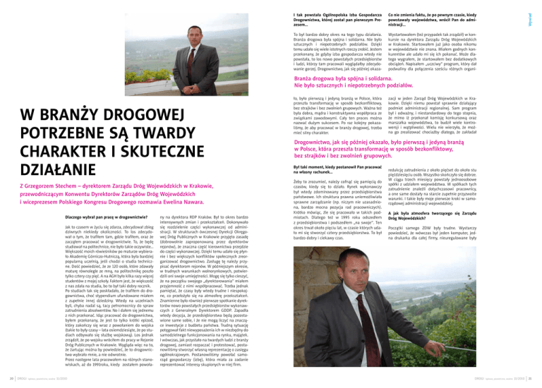 Co nie zmienia faktu, że po pewnym czasie, kiedy powstawały województwa, wrócił Pan do administracji… To był bardzo dobry okres na tego typu działania. Branża drogowa była spójna i solidarna. Nie było sztucznych i niepotrzebnych podziałów. Dzięki temu udało się wiele istotnych rzeczy zrobić. Jestem przekonany, że gdyby izba gospodarcza wtedy nie powstała, to los nowo powstałych przedsiębiorstw i ludzi, którzy tam pracowali wyglądałby zdecydowanie gorzej. Drogownictwo, jak się później okaza- Wystartowałem (też przypadek tak zrządził) w konkursie na dyrektora Zarządu Dróg Wojewódzkich w Krakowie. Startowałem już jako osoba nikomu w województwie nie znana. Miałem godnych konkurentów ale udało mi się ich pokonać. Może dlatego wygrałem, że startowałem bez dodatkowych obciążeń. Napisałem „uczciwy” program, który dał podwaliny dla połączenia sześciu różnych organi- Wywiad I tak powstała Ogólnopolska Izba Gospodarcza Drogownictwa, której został pan pierwszym Prezesem… Branża drogowa była spójna i solidarna. Nie było sztucznych i niepotrzebnych podziałów. W branży drogowej potrzebne są twardy charakter i skuteczne działanie Z Grzegorzem Stechem – dyrektorem Zarządu Dróg Wojewódzkich w Krakowie, przewodniczącym Konwentu Dyrektorów Zarządów Dróg Wojewódzkich i wiceprezesem Polskiego Kongresu Drogowego rozmawia Ewelina Nawara. Dlaczego wybrał pan pracę w drogownictwie? Jak to czasem w życiu się zdarza, zdecydował zbieg dziwnych niekiedy okoliczności. To los zdecydował o tym, że trafiłem tam, gdzie trafiłem, oraz że zacząłem pracować w drogownictwie. To, że będę studiował na politechnice, nie było takie oczywiste… Większość moich rówieśników po maturze wybierało Akademię Górniczo-Hutniczą, która była bardziej popularną uczelnią, jeśli chodzi o studia techniczne. Dość powiedzieć, że ze 120 osób, które zdawały maturę równolegle ze mną, na politechnikę poszło tylko cztery czy pięć. A na AGH było kilka razy więcej studentów z mojej szkoły. Faktem jest, że większość z nas zdała na studia, bo to był taki dobry rocznik. Po studiach tak się poskładało, że trafiłem do drogownictwa, choć stypendium ufundowane miałem z zupełnie innej dziedziny. Wtedy na uczelniach byli, chyba nadal są, tacy pełnomocnicy do spraw zatrudnienia absolwentów. No i dałem się jednemu z nich przekonać. Idąc pracować do drogownictwa, byłem przekonany, że jest to tylko krótki epizod, który zakończy się wraz z powołaniem do wojska (takie to były czasy – lata osiemdziesiąte, że po studiach odbywało się służbę wojskową). Los jednak zrządził, że po wojsku wróciłem do pracy w Rejonie Dróg Publicznych w Krakowie. Wygląda więc na to, że żartując można by powiedzieć, że to drogownictwo wybrało mnie, a nie odwrotnie. Przez następne lata pracowałem na różnych stanowiskach, aż do 1991roku, kiedy zostałem powoła20 DROGI lądowe, powietrzne, wodne 11/2010 ny na dyrektora RDP Kraków. Był to okres bardzo intensywnych zmian i przekształceń. Dokonywało się rozdzielenie części wykonawczej od administracji. W strukturach ówczesnej Dyrekcji Okręgowej Dróg Publicznych w Krakowie przyjęto zasadę (dobrowolnie zaproponowaną przez dyrektorów rejonów), że znaczna część kierownictwa przejdzie do części wykonawczej. Dzięki temu udało się płynnie i bez większych konfliktów społecznych zreorganizować drogownictwo. Zasługę tę należy przypisać dyrektorom rejonów. W późniejszym okresie, w trudnych warunkach wolnorynkowych, potwierdzili oni swoje umiejętności. Mogę się tylko cieszyć, że na początku swojego „dyrektorowania” miałem przyjemność z nimi współpracować. Trzeba jednak pamiętać, że czasy były wtedy trudne i niespokojne, co przełożyło się na atmosferę przekształceń. Znamienne było również pierwsze spotkanie dyrektorów nowo powstałych przedsiębiorstw wykonawczych z Generalnym Dyrektorem GDDP. Zapadła wtedy decyzja, że przedsiębiorstwa będą pozostawione same sobie, i że nie mogą liczyć na znaczące inwestycje z budżetu państwa. Trudną sytuację potęgował fakt niewyposażenia ich w niezbędny do samodzielnego funkcjonowania na rynku, majątek. I wówczas, jak przystało na twardych ludzi z branży drogowej, zamiast rozpaczać i protestować, postanowiliśmy stworzyć własną reprezentację o zasięgu ogólnokrajowym. Postanowiliśmy powołać samorząd gospodarczy (izbę), która miała za zadanie reprezentować interesy skupionych w niej firm. ło, było pierwszą i jedyną branżą w Polsce, która przeszła transformację w sposób bezkonfliktowy, bez strajków i bez zwolnień grupowych. Ważna też była dobra, mądra i konstruktywna współpraca ze związkami zawodowymi. Cały ten proces można nazwać dużym sukcesem. Po raz kolejny pokazaliśmy, że aby pracować w branży drogowej, trzeba mieć silny charakter. zacji w jeden Zarząd Dróg Wojewódzkich w Krakowie. Dzięki niemu powstał sprawnie działający podmiot administracji regionalnej. Sam program był i odważny, i niestandardowy do tego stopnia, że mimo iż przekonał komisję konkursową oraz marszałka województwa, to budził wiele kontrowersji i wątpliwości. Wielu nie wierzyło, że można go zrealizować chociażby dlatego, że zakładał Drogownictwo, jak się później okazało, było pierwszą i jedyną branżą w Polsce, która przeszła transformację w sposób bezkonfliktowy, bez strajków i bez zwolnień grupowych. Był taki moment, kiedy postanowił Pan pracować na własny rachunek… Żeby to zrozumieć, należy cofnąć się pamięcią do czasów, kiedy się to działo. Rynek wykonawczy był wtedy zdominowany przez przedsiębiorstwa państwowe. Ich struktura prawna uniemożliwiała sprawne zarządzanie (np. niczym nie uzasadniona, bardzo mocna pozycja rad pracowniczych). Krótko mówiąc, źle si