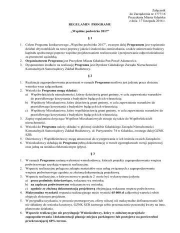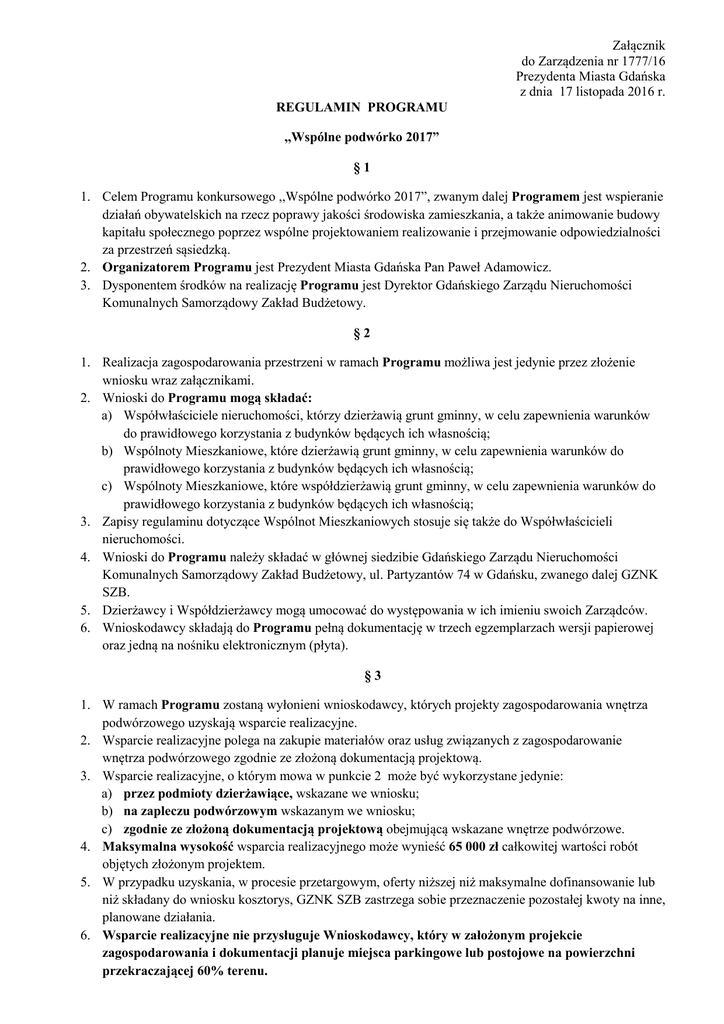 Załącznik do Zarządzenia nr 1777/16 Prezydenta Miasta Gdańska z dnia 17 listopada 2016 r. REGULAMIN PROGRAMU ,,Wspólne podwórko 2017” §1 1. Celem Programu konkursowego ,,Wspólne podwórko 2017”, zwanym dalej Programem jest wspieranie działań obywatelskich na rzecz poprawy jakości środowiska zamieszkania, a także animowanie budowy kapitału społecznego poprzez wspólne projektowaniem realizowanie i przejmowanie odpowiedzialności za przestrzeń sąsiedzką. 2. Organizatorem Programu jest Prezydent Miasta Gdańska Pan Paweł Adamowicz. 3. Dysponentem środków na realizację Programu jest Dyrektor Gdańskiego Zarządu Nieruchomości Komunalnych Samorządowy Zakład Budżetowy. §2 1. Realizacja zagospodarowania przestrzeni w ramach Programu możliwa jest jedynie przez złożenie wniosku wraz załącznikami. 2. Wnioski do Programu mogą składać: a) Współwłaściciele nieruchomości, którzy dzierżawią grunt gminny, w celu zapewnienia warunków do prawidłowego korzystania z budynków będących ich własnością; b) Wspólnoty Mieszkaniowe, które dzierżawią grunt gminny, w celu zapewnienia warunków do prawidłowego korzystania z budynków będących ich własnością; c) Wspólnoty Mieszkaniowe, które współdzierżawią grunt gminny, w celu zapewnienia warunków do prawidłowego korzystania z budynków będących ich własnością; 3. Zapisy regulaminu dotyczące Wspólnot Mieszkaniowych stosuje się także do Współwłaścicieli nieruchomości. 4. Wnioski do Programu należy składać w głównej siedzibie Gdańskiego Zarządu Nieruchomości Komunalnych Samorządowy Zakład Budżetowy, ul. Partyzantów 74 w Gdańsku, zwanego dalej GZNK SZB. 5. Dzierżawcy i Współdzierżawcy mogą umocować do występowania w ich imieniu swoich Zarządców. 6. Wnioskodawcy składają do Programu pełną dokumentację w trzech egzemplarzach wersji papierowej oraz jedną na nośniku elektronicznym (płyta). §3 1. W ramach Programu zostaną wyłonieni wnioskodawcy, których projekty zagospodarowania wnętrza podwórzowego uzyskają wsparcie realizacyjne. 2. Wsparcie realizacyjne polega na zakupie materiałów oraz usług związanych z zagospodarowanie wnętrza podwórzowego zgodnie ze złożoną dokumentacją projektową. 3. Wsparcie realizacyjne, o którym mowa w punkcie 2 może być wykorzystane jedynie: a) przez podmioty dzierżawiące, wskazane we wniosku; b) na zapleczu podwórzowym wskazanym we wniosku; c) zgodnie ze złożoną dokumentacją projektową obejmującą wskazane wnętrze podwórzowe. 4. Maksymalna wysokość wsparcia realizacyjnego może wynieść 65 000 zł całkowitej wartości robót objętych złożonym projektem. 5. W przypadku uzyskania, w procesie przetargowym, oferty niższej niż maksymalne dofinansowanie lub niż składany do wniosku kosztorys, GZNK SZB zastrzega sobie przeznaczenie pozostałej kwoty na inne, planowane działania. 6. Wsparcie realizacyjne nie przysługuje Wnioskodawcy, który w założonym projekcie zagospodarowania i dokumentacji planuje miejsca parkingowe lub postojowe na powierzchni przekraczającej 60% terenu. 7. Z finansowanego wsparcia wykluczone są ogrodzenia, które wcześniej nie stanowiły rodzimego, zintegrowanego terenowo elementu infrastruktury terenu, tj. takie, które nie były przewidziane w pierwotnym projekcie urbanistycznym, którego składową jest budynek Wspólnoty. 8. Wspólnota Mieszkaniowa składająca wniosek do konkursu zobowiązana jest do podjęcia uchwały pokrycia kosztów inwestycji przekraczających wartość maksymalnego dofinansowania. 9. Wszelkie dodatkowo zlecone prace, wykonywane na terenie dzierżawionym, a zlecone Wykonawcy poza realizowanym projektem zagospodarowania wnętrza podwórzowego wymagają akceptacji właściciela gruntu, czyli GZNK SZB. 10. Całkowity koszt inwestycji zostanie określony na podstawie ofert złożonych przez Wykonawców w procedurze przetargu publicznego. 11. Wnioskodawcy zobowiązani są wnieść wkład własny do konkursu w postaci profesjonalnie przygotowane i opracowanej dokumentacji projektowej, zawierającej projekt zagospodarowania wnętrza podwórzowego, kosztorys, przedmiar oraz specyfikację techniczną wykonania i odbioru robót. 12. Dokumentacja musi być opatrzona pieczątka i podpisem osoby sporządzającej, legitymującej się odpowiednimi uprawnieniami. 13. Wnioskodawca zobowiązany jest dołączyć do wniosku oświadczenie woli o samodzielnym rozwiązywaniu ewentualnych konfliktów sąsiedzkich wynikających przy realizacji zagospodarowania wnętrza podwórzowego oraz w późniejszym czasie. 14. W przypadku otrzymania przez GZNK SZB pierwszej korespondencji wskazującej na pojawienie się konfliktu wsparcie realizacyjne zostanie bezwarunkowo wstrzymane, a kosztami takiego postępowania zostanie obciążony Wnioskodawca. W dalszej kolejności zostanie dopuszczony do realizacji kolejny wniosek zakwalifikowany, a posiadający mniejszą ilość punktów. 15. Wsparcie realizacyjne nie będzie obejmowało zakupu i montażu obiektów, takich jak: złożone urządzenia zabawowe wymagające atestów i dozoru, posągi, wodotryski i fontanny, kapliczki i inne symbole kultu religijnego, itp. 16. Zakup i montaż wszelkich instalacji i urządzeń związanych z zagospodarowaniem wnętrza podwórzowego, a mieszczących się wewnątrz budynku mieszkalnego leży po stronie wnioskodawcy. §4 1. Prezydent Miasta Gdańska, odrębnym Zarządzeniem powołuję Komisję ds. rozpatrzenia wniosków konkursowych, zwanej dalej Komisją. 2. Do zadań Komisji należy przeanalizowanie i wyłonienie spośród złożonych do Programu wniosków, które po spełnieniu kryteriów, o których mowa w § 6 Regulaminu, otrzymają wsparcie realizacyjne. 3. Komisja, z całości swoich prac sporządzi protokół. 4. Każdy członek Komisji ma prawo w dowolnym czasie, do wyznaczonego dnia ostatniego jej posiedzenia, analizować i weryfikować wnioski wraz z wydawaniem indywidualnej oceny. 5.
