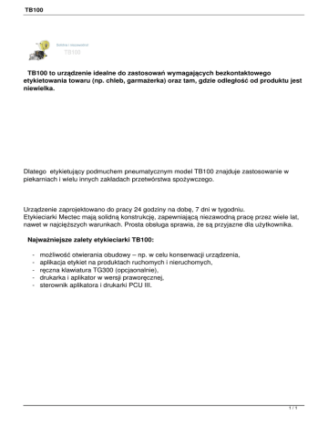 TB100 TB100 to urządzenie idealne do zastosowań wymagających bezkontaktowego etykietowania towaru (np. chleb, garmażerka) oraz tam, gdzie odległość od produktu jest niewielka. Dlatego etykietujący podmuchem pneumatycznym model TB100 znajduje zastosowanie w piekarniach i wielu innych zakładach przetwórstwa spożywczego. Urządzenie zaprojektowano do pracy 24 godziny na dobę, 7 dni w tygodniu. Etykieciarki Mectec mają solidną konstrukcję, zapewniającą niezawodną pracę przez wiele lat, nawet w najcięższych warunkach. Prosta obsługa sprawia, że są przyjazne dla użytkownika. Najważniejsze zalety etykieciarki TB100: - możliwość otwierania obudowy – np. w celu konserwacji urządzenia, aplikacja etykiet na produktach ruchomych i nieruchomych, ręczna klawiatura TG300 (opcjaonalnie), drukarka i aplikator w wersji praworęcznej, sterownik aplikatora i drukarki PCU III. 1/1