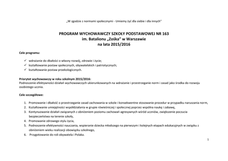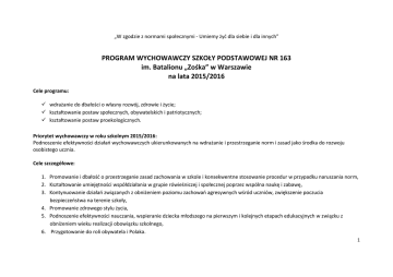 „W zgodzie z normami społecznymi - Umiemy żyć dla siebie i dla innych” PROGRAM WYCHOWAWCZY SZKOŁY PODSTAWOWEJ NR 163 im. Batalionu „Zośka” w Warszawie na lata 2015/2016 Cele programu: wdrażanie do dbałości o własny rozwój, zdrowie i życie; kształtowanie postaw społecznych, obywatelskich i patriotycznych; kształtowanie postaw proekologicznych. Priorytet wychowawczy w roku szkolnym 2015/2016: Podnoszenie efektywności działań wychowawczych ukierunkowanych na wdrażanie i przestrzeganie norm i zasad jako środka do rozwoju osobistego ucznia. Cele szczegółowe: 1. Promowanie i dbałość o przestrzeganie zasad zachowania w szkole i konsekwentne stosowanie procedur w przypadku naruszania norm, 2. Kształtowanie umiejętności współdziałania w grupie rówieśniczej i społecznej poprzez wspólna naukę i zabawę, 3. Kontynuowanie działań związanych z obniżeniem poziomu zachowań agresywnych wśród uczniów, zwiększenie poczucia bezpieczeństwa na terenie szkoły, 4. Promowanie zdrowego stylu życia, 5. Podnoszenie efektywności nauczania, wspieranie dziecka młodszego na pierwszym i kolejnych etapach edukacyjnych w związku z obniżeniem wieku realizacji obowiązku szkolnego, 6. Przygotowanie do roli obywatela i Polaka. 1 Realizacja programu: obszar funkcjonowania społecznego Przestrzegam norm i zasad, bo jest to ważne dla mnie i dla innych zadania Wdrażanie do przestrzegania ogólnie przyjętych norm moralnych i społecznych Promowanie kultury osobistej i postaw prospołecznych w kontaktach interpersonalnych, kształtowanie postaw szacunku i tolerancji wobec uczniów niepełnosprawnych adresaci sposoby realizacji Przypomnienie uczniom regulaminu szkolnego, kryteriów oceniania, zasad bezpieczeństwa, praw i obowiązków ucznia, Apel dotyczącym norm i zasad ich przestrzegania, Praca z normami – stosowanie procedur w sytuacjach naruszania norm, Promowanie etycznej postawy w czasie omawiania tekstów literackich, lekcji religii i innych zajęć edukacyjnych, wdrażanie wypracowanych w ubiegłym roku szkolnym norm i zasad zachowania obowiązujących w SP 163. Uczniowie, Podczas zajęć edukacyjnych odwoływanie się do takich nauczyciele wartości jak: przyjaźń, koleżeństwo, wzajemny szacunek, uczciwość, lojalność, sprawiedliwość, odpowiedzialność, Wykorzystanie sylwetki Patrona szkoły a jako wzoru do naśladowania, Realizacja treści programu na wszystkich zajęciach edukacyjnych. uczniowie osoby odpowiedzialne Dyrektor, nauczyciele Wszyscy nauczyciele 2 Wdrażanie do dbałości o bezpieczeństwo psychiczne i fizyczne Uczniowie, rodzice Rozwijanie umiejętności skutecznego porozumiewania się oraz pracy zespołowej Doskonalenie umiejętności rozwiązywania konfliktów bez używania przemocy uczniowie uczniowie Udział w apelach „Bezpiecznie w domu w szkole na ulicy”, „Bezpiecznie w czasie ferii”, „Kultura na codzień”, Współpraca z p. pielęgniarką (lekcje nt. zagrożeń jakie stwarzają fajerwerki), Rozwijanie kompetencji medialnych, umożliwiających uczniom odpowiedzialnie korzystanie z zasobów cyfrowych, np.: lekcje na temat cyberprzemocy, Współpraca ze Strażą Miejską , min: „Bezpieczeństwo w ruchu turystycznym”, Realizacja programu techniki - wychowanie komunikacyjne karta rowerowa, Udział uczniów w konkursach tematycznych. Praca w zespołach (realizacja podstawy programowej/projektów) itd., wycieczki i wyjazdy klasowe, lekcje w terenie, ćwiczenie skutecznego komunikowania się na godzinach wychowawczych i językach, Wdrażanie oceniania kształtującego na lekcjach uwzględniających skuteczną pracę w zespołach. Wypracowanie form radzenia sobie w sytuacji trudnej przy współpracy Stowarzyszenia Bliżej Dziecka i Przeciw Przemocy, Rozwijanie postaw asertywnych (zabawy integracyjne, dyskusje, filmy edukacyjne, treści nauczania), Rozwiązywanie bieżących konfliktów przez wychowawców, nauczycieli, pedagoga, psychologa. Nauczyciele, wicedyrektor, pielęgniarka nauczyciele psycholog, pedagog, nauczyciele 3 Przeciwdziałanie agresji i przemocy rówieśniczej uczniowie Pogadanki na zajęciach z wychowawcą - jak radzić sobie z emocjami w sytuacjach trudnych, Ćwiczenia relaksacyjne podczas lekcji, Realizacja Programu profilaktycznego szkoły udział pedagoga szkolnego w zebraniach z rodzicami na temat zapobiegania agresji słownej i fizycznej w domu i w szkole warsztaty z zakresu nabywania umiejętności zachowań asertywnych warsztaty z zakresu zapobiegania przemocy programy realizowane przez Stowarzyszenie Bliżej Dziecka i Przeciw przemocy, warsztaty integracyjne w klasach 0 - 1, Indywidualna opieka psychologa i pedagoga nad dziećmi z zaburzeniami w zachowaniu, Zajęcia socjoterapeutyczne. nauczyciele, pedagog, psycholog, Wdrażanie do wzajemnej pomocy Uczniowie, nauczyciele rodzice Udział w akcji „Szlachetna Paczka”, Zbiórka surowców wtórnych z przeznaczeniem dochodów dla potrzebujących. Biblioteka, nauczyciele Integrowanie uczniów klasy uczniowie Organizacja imprez klasowych j: wycieczki, dyskoteki, bal szóstoklasisty, wyjścia do teatru lub kina, rozgrywki sportowe, wigilia klasowa, itp. nauczyciele 4 Kształtowanie przynależności do społeczności szkolnej – rozwijanie samorządności uczniowie Wspieranie w budowaniu więzi rodzinnych, kształtowanie postaw wzajemnego poszanowania się w rodzinie i wzajemnej o siebie dbałości Uczniowie, rodzice Promowanie wspólnego spędzania czasu wolnego, kultywowania tradycji rodzinnych Uczniowie, rodzice Praca Małego Samorządu i SU uświadamianie roli samorządu klasowego i szkolnego przygotowanie do świadomego uczestnictwa w życiu społecznym Wyrabianie szacunku dla dóbr materialnych osobistych i wspólnych. Wdrażanie programu „Wychowanie do życia w rodzinie" w klasach V i VI, Pedagogizacja rodziców w zakresie: kultury zachowań, agresji, emocji, postaw rodzicielskich, umiejętności komunikacyjnych w kontaktach z dziećmi, Zebra