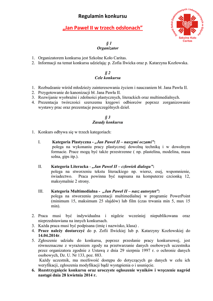 Regulamin konkursu „Jan Paweł II w trzech odsłonach” §1 Organizator 1. Organizatorem konkursu jest Szkolne Koło Caritas. 2. Informacji na temat konkursu udzielają: p. Zofia Ilwicka oraz p. Katarzyna Kozłowska. §2 Cele konkursu 1. 2. 3. 4. Rozbudzanie wśród młodzieży zainteresowania życiem i nauczaniem bł. Jana Pawła II. Przygotowanie do kanonizacji bł. Jana Pawła II. Rozwijanie wyobraźni i zdolności plastycznych, literackich oraz multimedialnych. Prezentacja twórczości szerszemu kręgowi odbiorców poprzez zorganizowanie wystawy prac oraz prezentacje poszczególnych dzieł. §3 Zasady konkursu 1. Konkurs odbywa się w trzech kategoriach: I. Kategoria Plastyczna - „Jan Paweł II – naszymi oczami”: polega na wykonaniu pracy plastycznej dowolną techniką i w dowolnym formacie. Prace mogą być także przestrzenne ( np. plastelina, modelina, masa solna, gips itp.). II. Kategoria Literacka - „Jan Paweł II – człowiek dialogu”: polega na stworzeniu tekstu literackiego np. wiersz, esej, wspomnienie, świadectwo. Praca powinna być napisana na komputerze czcionką 12, maksymalnie 2 strony. III. Kategoria Multimedialna - „Jan Paweł II – nasz autorytet”: polega na stworzeniu prezentacji multimedialnej w programie PowerPoint (minimum 15, maksimum 25 slajdów) lub film (czas trwania min 5, max 15 min). 2. Praca musi być indywidualna i nigdzie wcześniej niepublikowana oraz nieprzedstawiana na innych konkursach. 3. Każda praca musi być podpisana (imię i nazwisko, klasa) . 4. Prace należy dostarczyć do p. Zofii Ilwickiej lub p. Katarzyny Kozłowskiej do 14.04.2014r. 5. Zgłoszenie udziału do konkursu, poprzez przesłanie pracy konkursowej, jest równoznaczne z wyrażeniem zgody na przetwarzanie danych osobowych uczestnika przez organizatora zgodnie z Ustawą z dnia 29 sierpnia 1997 r. o ochronie danych osobowych, Dz. U. Nr 133, poz. 883. Każdy uczestnik, ma możliwość dostępu do dotyczących go danych w celu ich weryfikacji, zgłoszenia modyfikacji bądź wystąpienia o i usunięcie. 6. Rozstrzygnięcie konkursu oraz uroczyste ogłoszenie wyników i wręczenie nagród nastąpi dnia 28 kwietnia 2014 r. §4 Kryteria oceniania prac I. W kategorii plastycznej komisja będzie kierować się następującymi kryteriami: zgodność z tematem estetyka wykonania oryginalność pracy wartości artystyczne II. W kategorii literackiej komisja będzie kierować się następującymi kryteriami: zgodność z tematem oryginalność pracy zgodność z zasadami języka polskiego (poprawność) III. W kategorii multimedialnej komisja będzie kierować się następującymi kryteriami: zgodność z tematem oryginalność pracy jakość wykonania poprawność wykonania §5 Nagrody W każdej kategorii przewidziane są dyplomy i nagrody za zajęcie I, II, III miejsca. Miejsce I : nagroda niespodzianka, 30 punktów z zachowania, list żelazny na cały wybrany dzień oraz w kategorii plastycznej ocena cząstkowa „6” z religii, w kategorii literackiej ocena cząstkowa „6” z religii i języka polskiego, w kategorii multimedialnej ocena cząstkowa „6” z religii i określonego przedmiotu informatycznego; Miejsce II : 20 punktów z zachowania, list żelazny na jedną lekcję z wybranego przedmiotu oraz w kategorii plastycznej ocena cząstkowa „6” z religii, w kategorii literackiej ocena cząstkowa „6” z religii i języka polskiego, w kategorii multimedialnej ocena cząstkowa „6” z religii i określonego przedmiotu informatycznego; Miejsce III : 10 punktów z zachowania oraz w kategorii plastycznej ocena cząstkowa „5” z religii, w kategorii literackiej ocena cząstkowa „5” z religii i języka polskiego, w kategorii multimedialnej ocena cząstkowa „5” z religii i określonego przedmiotu informatycznego. REGULAMIN SZKOLNEGO KONKURSU NA NAJŁADNIEJSZY WYSTRÓJ KLASPRACOWNI „ Jan Paweł II – Papież młodych” I. Postanowienia ogólne: 1. Organizatorem konkursu jest Szkolne Koło Caritas w ZSEiI im. KEN w Giżycku (opiekunowie: p. Katarzyna Kozłowska i p. Zofia Ilwicka). 2. Cele konkursu: rozbudzanie wśród młodzieży zainteresowania życiem i nauczaniem bł. Jana Pawła II, przygotowanie do kanonizacji bł. Jana Pawła II, upamiętnienie Wielkiego Rodaka, integracja zespołów klasowych, motywowanie uczniów do dbałości o swoje miejsce pracy, jego estetykę, podtrzymywanie polskich tradycji, kształtowanie świadomości religijnej. II. Zasady konkursu 1. Wystroju klasopracowni należy dokonać do 16.04.2014r. 2. Konkurs jest przeznaczony dla uczniów klas I-III. 3. Ocenie podlegać będą: zgodność wystroju z tematem, oryginalność wystroju, wartości artystyczne, zaangażowanie klasy. III. Zasady rozstrzygnięcia konkursu 1. Wygląd klasopracowni oceni jury w składzie: 2 nauczycieli nie będących wychowawcami klas I-III oraz 2-3 przedstawicieli SKC. 2. Każdy członek komisji konkursowej będzie mógł przyznać punkty w skali od 0 do 5. Punkty zostaną zsumowane i klasa, która otrzyma ich największa ilość wygrywa konkurs, zajmując I miejsce. Proporcjonalnie do uzyskanej liczby punktów poszczególne klasy zdobędą odpowiednio miejsce II lub III. 3. Nagrody: Miejsce I : nagroda niespodzianka dla całej klasy oraz możliwość wyjścia na ognisko klasowe. Miejsce II: wybrany dzień wolny od odpytywania, klasówek, kartkówek. Miejsce III: wybrany dzień wolny od odpytywania. REGULAMIN ELIMINACJI „JEDEN Z DZIESIĘCIU” 1. Tematyka konkursu jest związana z postacią Błogosławionego Jana Pawła II, tj. podróże, wizyty, spotkania, życie, dokumenty, rodzina, kapłaństwo. 2. Eliminacje składają się z testu, który trwa 40 minut i zawiera 30 pytań (a,b,c). 3. Tylko jedna odpowiedź jest poprawna. 4. Każdemu z uczestników zostanie przydzielone indywidualne stanowisko. 5. Dziesięciu graczy z najwyższą liczbą punktów wystąpi w finale. 6. W przypadku, gdy kilku zawodników osiągnie tę samą liczbę punktów i li