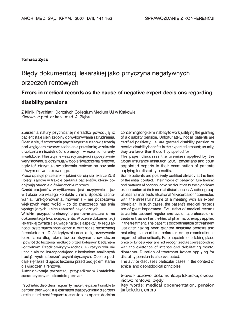 ARCH. MED. SĄD. KRYM., 2007, LVII, 144-152 Sprawozdanie z konferencji Tomasz Zyss Błędy dokumentacji lekarskiej jako przyczyna negatywnych orzeczeń rentowych Errors in medical records as the cause of negative expert decisions regarding disability pensions Z Kliniki Psychiatrii Dorosłych Collegium Medium UJ w Krakowie Kierownik: prof. dr hab.. med. A. Zięba Zburzenia natury psychicznej nierzadko powodują, iż pacjent staje się niezdolny do wykonywania zatrudnienia. Ocenia się, iż schorzenia psychiatryczne stanowią trzecią pod względem rozpowszechnienia przesłankę w zakresie orzekania o niezdolności do pracy – w rozumieniu renty inwalidzkiej. Niestety nie wszyscy pacjenci są pozytywnie weryfikowani, tj. otrzymują w ogóle świadczenia rentowe, bądź też otrzymują świadczenia rentowe na poziomie niższym od wnioskowanego. Praca opisuje przesłanki – jakimi kierują się lekarze ZUS i biegli sądowi w trakcie badania pacjentów, którzy podejmują starania o świadczenia rentowe. Część pacjentów weryfikowana jest pozytywnie – już w trakcie pierwszego kontaktu z nimi. Sposób zachowania, funkcjonowania, mówienia – nie pozostawia większych wątpliwości – co do znacznego nasilenia występujących u nich zaburzeń psychicznych. W takim przypadku niezwykle pomocne znaczenie ma dokumentacja lekarska pacjenta. W ocenie dokumentacji lekarskiej zwraca się uwagę na takie aspekty jak regularność i systematyczność leczenia, oraz rodzaj stosowanej farmakoterapii. Dość krytycznie ocenia się przerywanie leczenia na długi okres tuż po otrzymaniu świadczeń i powrót do leczenia niedługo przed kolejnym badaniem kontrolnym. Rzadkie wizyty w rodzaju 1-2 razy w roku nie uznaje się za korespondujące z istnieniem nasilonych i uciążliwych zaburzeń psychiatrycznych. Ocenie poddaje się także długość leczenia przed podjęciem starań o świadczenia rentowe. Autor dokonuje prezentacji przypadków w kontekście zasad etycznych i deontologicznych. Psychiatric disorders frequently make the patient unable to perform their work. It is estimated that psychiatric disorders are the third most frequent reason for an expert’s decision concerning long-term inability to work justifying the granting of a disability pension. Unfortunately, not all patients are certified positively, i.e. are granted disability pension or receive disability benefits in the expected amount; usually, they are lower than those they applied for. The paper discusses the premises applied by the Social Insurance Institution (ZUS) physicians and court appointed experts in their examination of patients applying for disability benefits. Some patients are positively certified already at the time of the initial contact. Their mode of behavior, functioning and patterns of speech leave no doubt as to the significant exacerbation of their mental disturbances. Another group of patients manifests situational “exacerbation” connected with the stressful nature of a meeting with an expert physician. In such cases, the patient’s medical records are of great importance. Evaluation of medical records takes into account regular and systematic character of treatment, as well as the kind of pharmacotherapy applied in the treatment. The patient’s discontinuation of treatment just after having been granted disability benefits and restarting it a short time before check-up examination is regarded rather critically. Rare appointments taking place once or twice a year are not recognized as corresponding with the existence of intense and debilitating mental disorders. Duration of treatment before applying for disability pension is also evaluated. The author discusses particular cases in the context of ethical and deontological principles. Słowa kluczowe: dokumentacja lekarska, orzecznictwo rentowe, błędy Key words: medical documentation, pension jurisdiction, errors Nr 1 Błędy dokumentacji lekarskiej Wprowadzenie Krótkotrwały i jednorazowy charakter spotkania diagnostycznego – jakim jest badanie pacjenta przez organ ZUS oraz badanie przeprowadzone przez biegłych sądowych – przesądza o tym, iż stan psychiczny pacjenta w trakcie takiego badania (w sytuacji stresowej dla osoby badanej) wielokrotnie nie jest wystarczający do przyjęcia określonego stanowiska orzeczniczego. Oczywiście istnieje pewna grupa pacjentów, których wygląd, zachowanie oraz sposób mówienia i wypowiadane treści – pozwalają dojść szybko na postawienie określonego rozpoznania i przypisanie mu określonego znaczenia orzeczniczego. W większości zaburzeń psychiatrycznych wyniki badań dodatkowych nie odgrywają żadnego znaczenia lub tylko niewielkie. Stąd też olbrzymią rolę w procesie orzeczniczym pełni analiza zapisków z dokumentacji medycznej [9, 10]. Można zapewne przyjąć, iż znamienita część tej dokumentacji prowadzona jest przez kolegów lekarzy rzetelnie i sumiennie – oddając rzeczywisty stan zdrowia w trakcie każdej wizyty. Niestety analiza dokumentacji lekarskiej dokonywana przez autora niniejszej pracy na przestrzeni minionych lat wykazuje jednak, iż w nie tak nielicznych przypadkach dokumentacja prowadzona jest w sposób wadliwy i nierzetelny, a nawet ulega niekiedy zniekształcaniu – żeby nie powiedzieć fałszowaniu. Lekarze ZUS i biegli doskonale zdają sobie sprawę z realiów w zakresie podstawowej opieki zdrowotnej i ogólnej sytuacji gospodarczej, w której otrzymanie świadczeń rentowych jest dla licznych pacjentów ucieczką od sytuacji bezrobocia. Chęć pomocy pacjentowi przez lekarza prowadzącego (niezależnie od motywacji – altruistycznej czy merkantylnej) nie może jednak prowadzić do „preparowania” dokumentacji lekarskiej – tak aby zwiększyć szanse pacjenta na otrzymanie świadczeń rentowych. I tak znamienita część zaburzeń psychicznych ma przebieg falowy czy też fazowy – zdarzają się okresu pogorszenia (niekiedy bardzo długo trwające) oraz okr