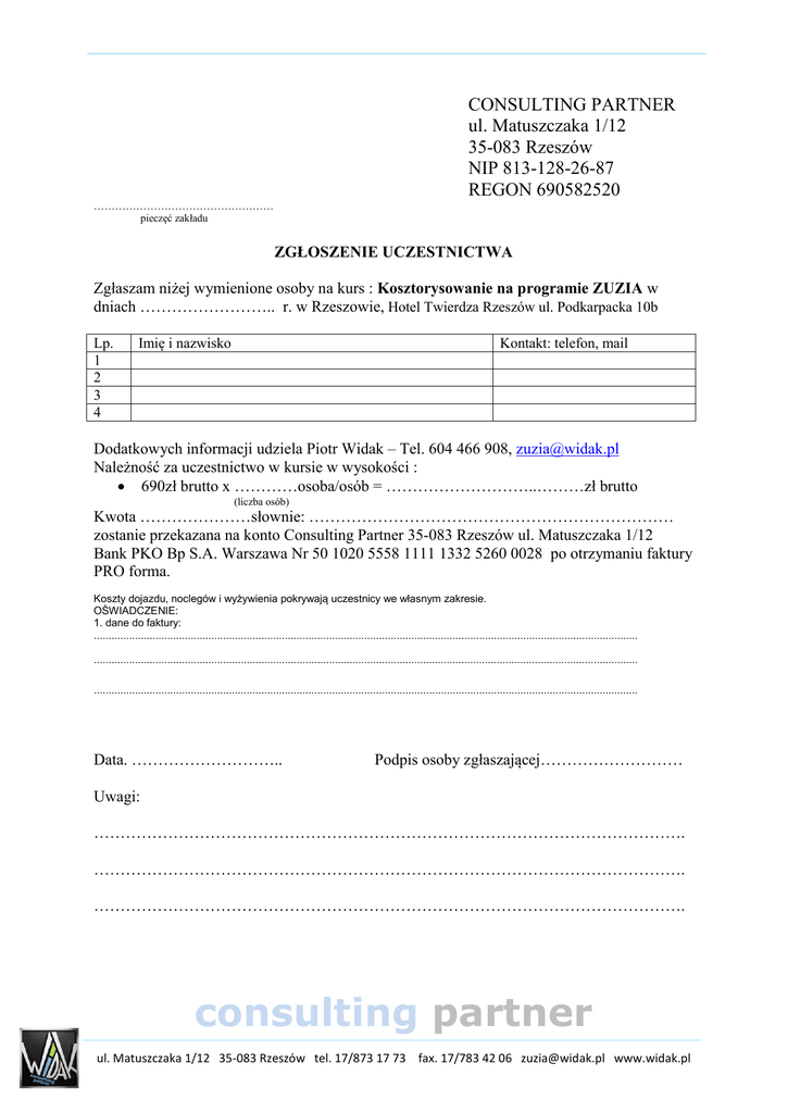 CONSULTING PARTNER ul. Matuszczaka 1/12 35-083 Rzeszów NIP 813-128-26-87 REGON 690582520 …………………………………………… pieczęć zakładu ZGŁOSZENIE UCZESTNICTWA Zgłaszam niżej wymienione osoby na kurs : Kosztorysowanie na programie ZUZIA w dniach …………………….. r. w Rzeszowie, Hotel Twierdza Rzeszów ul. Podkarpacka 10b Lp. 1 2 3 4 Imię i nazwisko Kontakt: telefon, mail Dodatkowych informacji udziela Piotr Widak – Tel. 604 466 908, [email protected] Należność za uczestnictwo w kursie w wysokości : 690zł brutto x …………osoba/osób = ………………………..………zł brutto (liczba osób) Kwota …………………słownie: …………………………………………………………… zostanie przekazana na konto Consulting Partner 35-083 Rzeszów ul. Matuszczaka 1/12 Bank PKO Bp S.A. Warszawa Nr 50 1020 5558 1111 1332 5260 0028 po otrzymaniu faktury PRO forma. Koszty dojazdu, noclegów i wyżywienia pokrywają uczestnicy we własnym zakresie. OŚWIADCZENIE: 1. dane do faktury: ......................................................................................................................................................................................... ......................................................................................................................................................................................... ......................................................................................................................................................................................... Data. ……………………….. Podpis osoby zgłaszającej……………………… Uwagi: …………………………………………………………………………………………………. …………………………………………………………………………………………………. …………………………………………………………………………………………………. consulting partner ul. Matuszczaka 1/12 35-083 Rzeszów tel. 17/873 17 73 fax. 17/783 42 06 [email protected] www.widak.pl