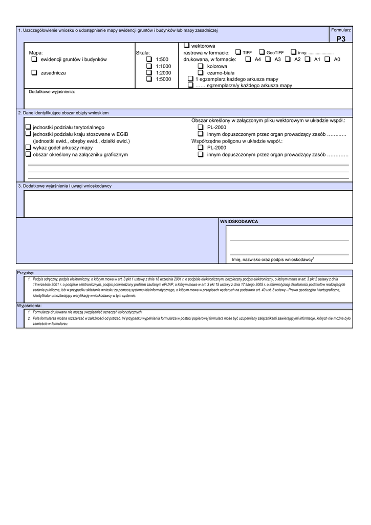 1. Uszczegółowienie wniosku o udostępnienie mapy ewidencji gruntów i budynków lub mapy zasadniczej Formularz P3 q wektorowa Mapa: q ewidencji gruntów i budynków q Skala: zasadnicza q q q q 1:500 1:1000 1:2000 1:5000 rastrowa w formacie: q TIFF q GeoTIFF q inny: ..................... drukowana, w formacie: q A4 q A3 q A2 q A1 q A0 q kolorowa q czarno-biała q 1 egzemplarz każdego arkusza mapy q …… egzemplarze/y każdego arkusza mapy Dodatkowe wyjaśnienia: 2. Dane identyfikujące obszar objęty wnioskiem q jednostki podziału terytorialnego q jednostki podziału kraju stosowane w EGiB (jednostki ewid., obręby ewid., działki ewid.) q wykaz godeł arkuszy mapy q obszar określony na załączniku graficznym Obszar określony w załączonym pliku wektorowym w układzie współ.: q PL-2000 q innym dopuszczonym przez organ prowadzący zasób ……..…. Współrzędne poligonu w układzie współ.: q PL-2000 q innym dopuszczonym przez organ prowadzący zasób …………. 3. Dodatkowe wyjaśnienia i uwagi wnioskodawcy WNIOSKODAWCA Imię, nazwisko oraz podpis wnioskodawcy1 Przypisy: 1. Podpis odręczny, podpis elektroniczny, o którym mowa w art. 3 pkt 1 ustawy z dnia 18 września 2001 r. o podpisie elektronicznym, bezpieczny podpis elektroniczny, o którym mowa w art. 3 pkt 2 ustawy z dnia 18 września 2001 r. o podpisie elektronicznym, podpis potwierdzony profilem zaufanym ePUAP, o którym mowa w art. 3 pkt 15 ustawy z dnia 17 lutego 2005 r. o informatyzacji działalności podmiotów realizujących zadania publiczne, lub w przypadku składania wniosku za pomocą systemu teleinformatycznego, o którym mowa w przepisach wydanych na podstawie art. 40 ust. 8 ustawy - Prawo geodezyjne i kartograficzne, identyfikator umożliwiający weryfikację wnioskodawcy w tym systemie. Wyjaśnienia: 1. Formularze drukowane nie muszą uwzględniać oznaczeń kolorystycznych. 2. Pola formularza można rozszerzać w zależności od potrzeb. W przypadku wypełniania formularza w postaci papierowej formularz może być uzupełniany załącznikami zawierającymi informacje, których nie można było zamieścić w formularzu.